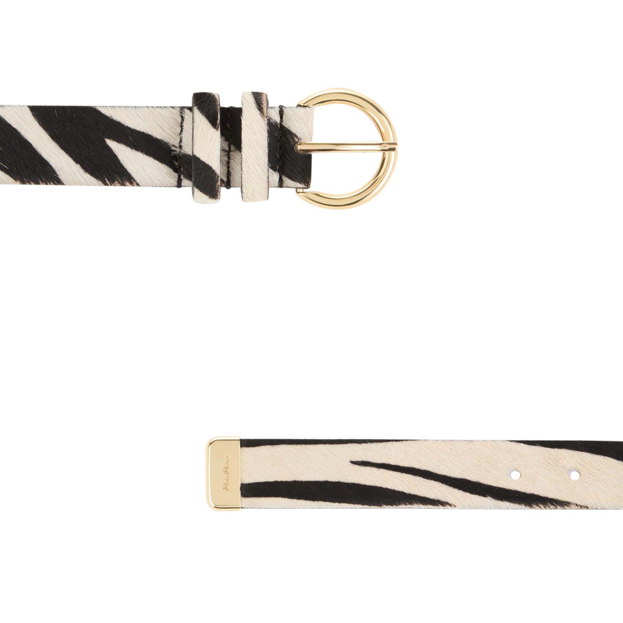 - Rounded buckle, adjustable fit, squared tip, gold-tone hardware, belt keeper, zebra print
