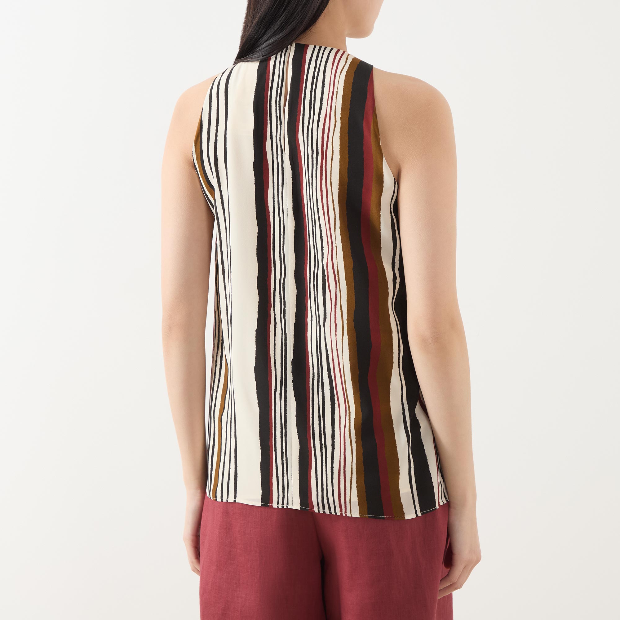 - Round neckline, sleeveless, button and loop fastening, straight hemline, stripe pattern