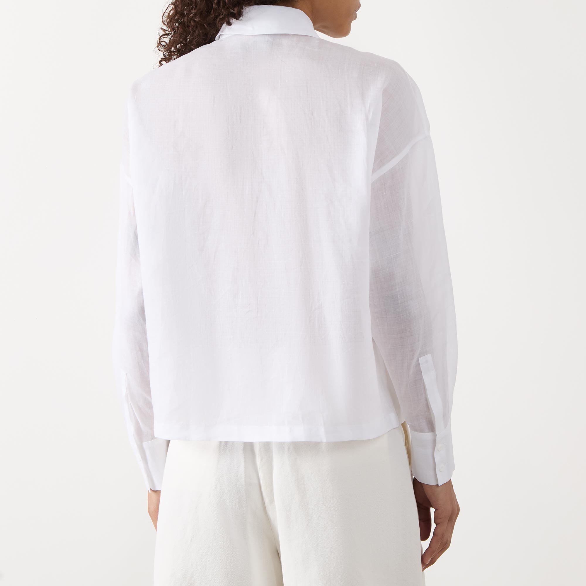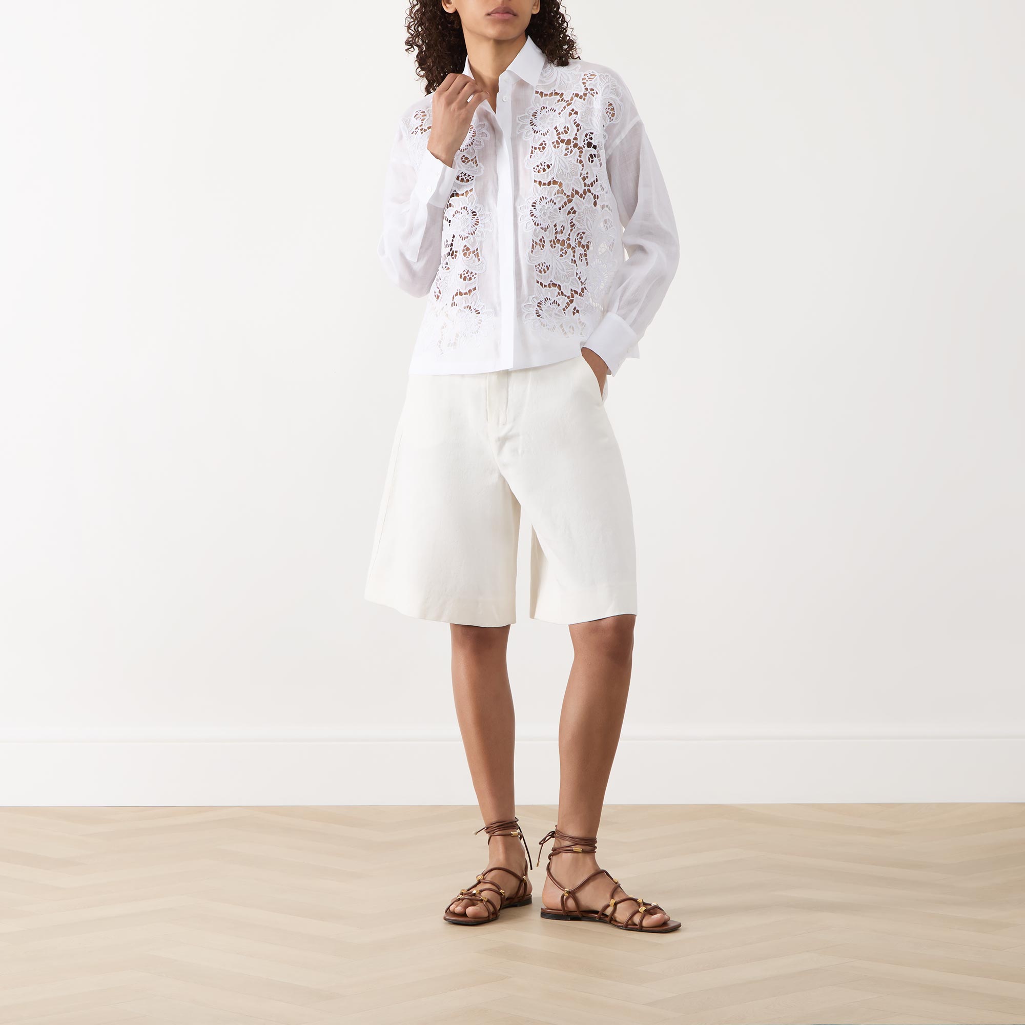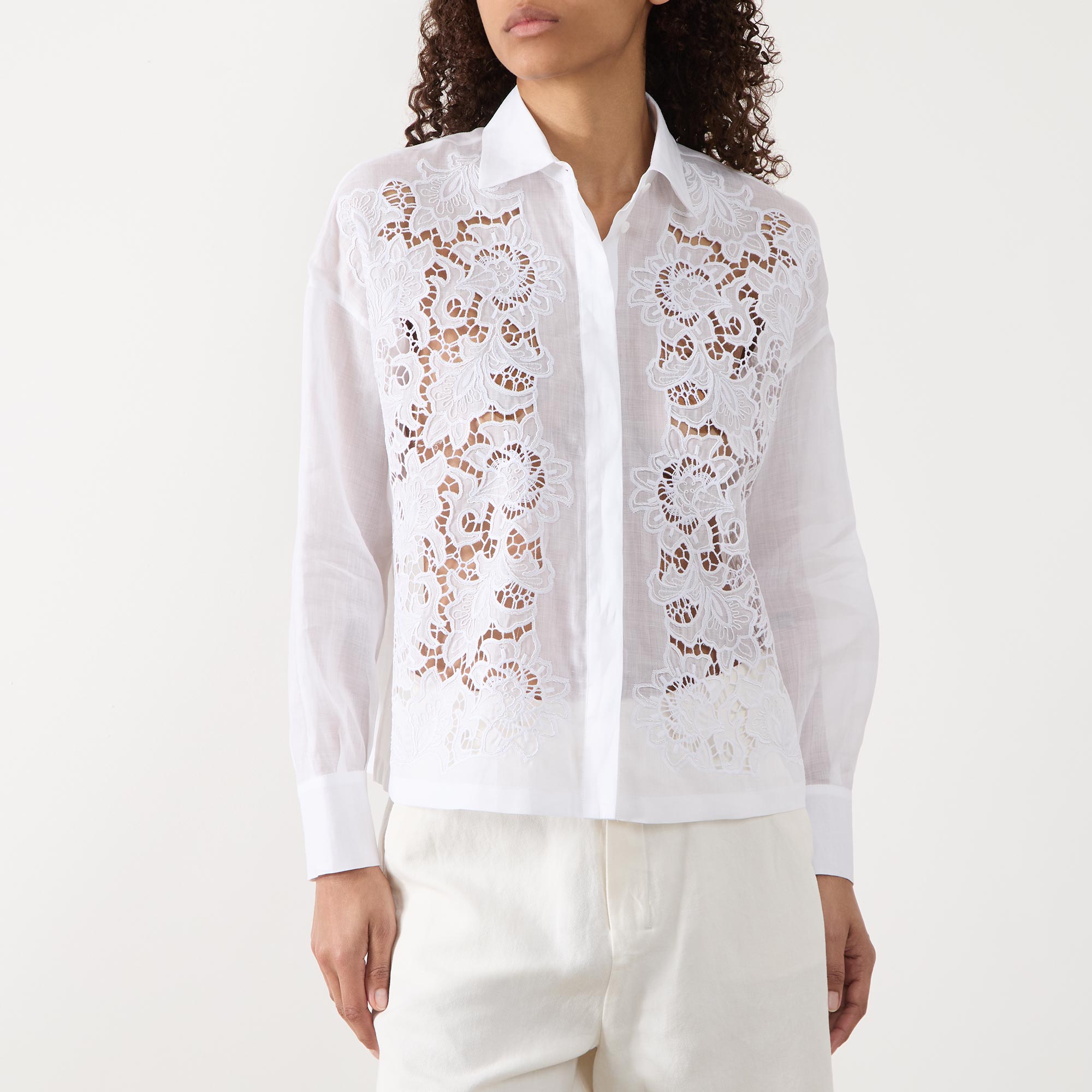 • Collared neckline, concealed button fastening, straight hemline, long low set-in sleeves, buttoned cuffs, broderie anglaise detail