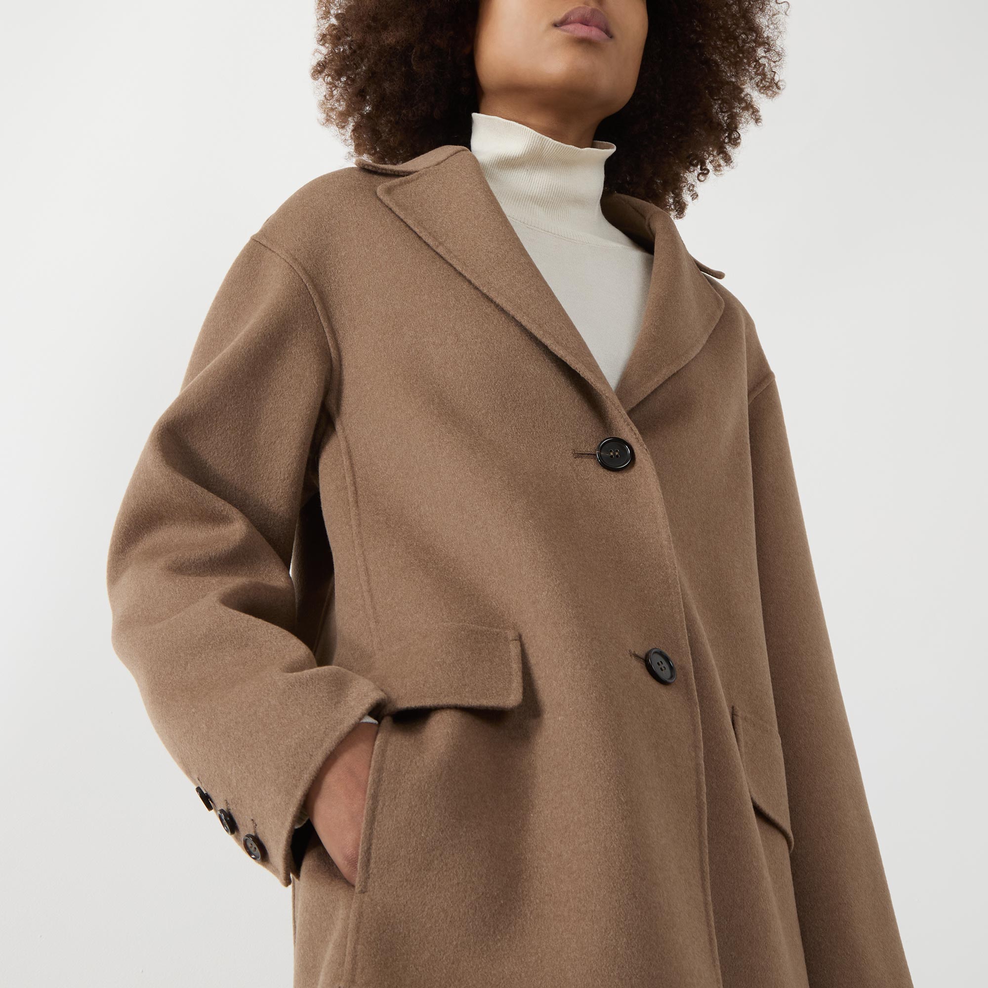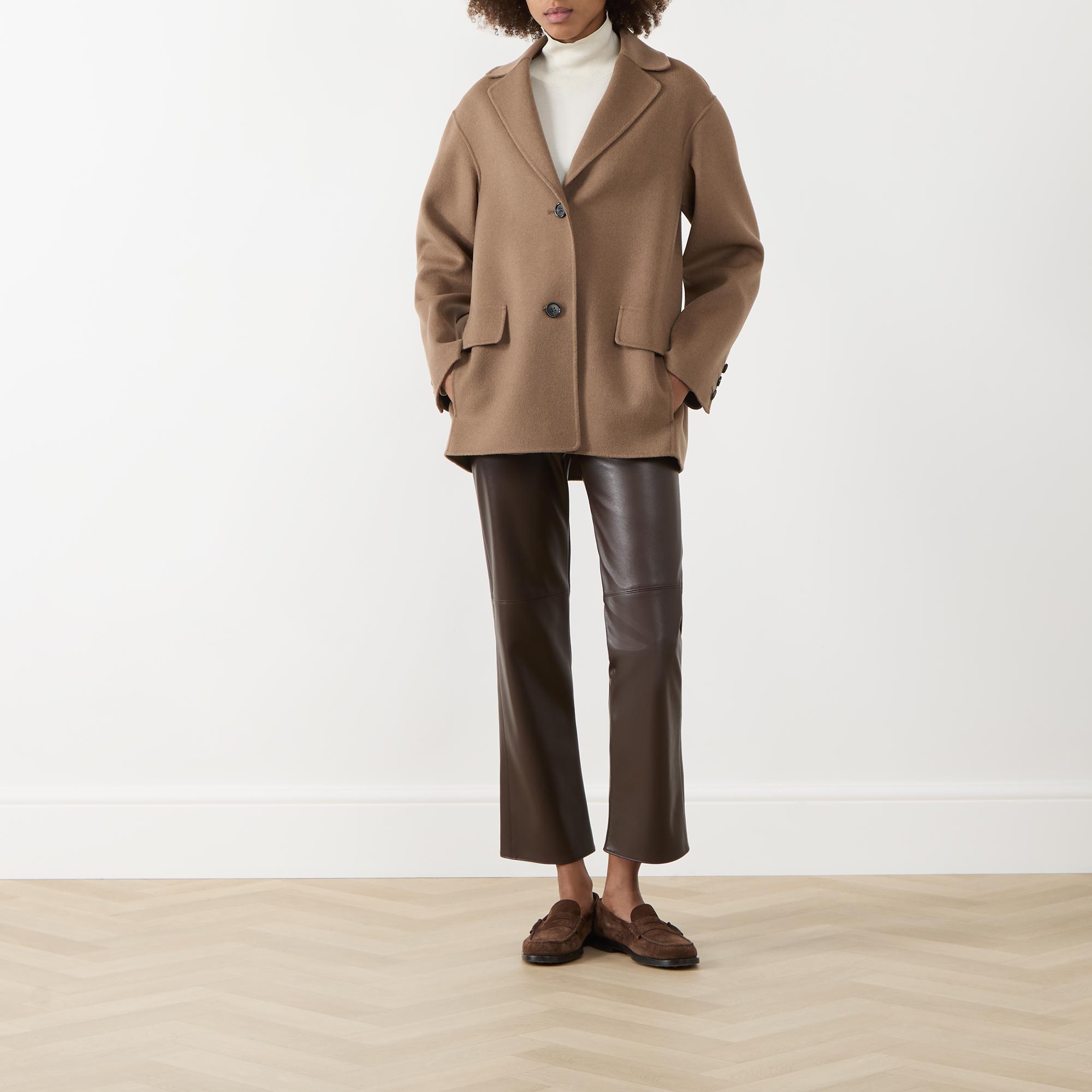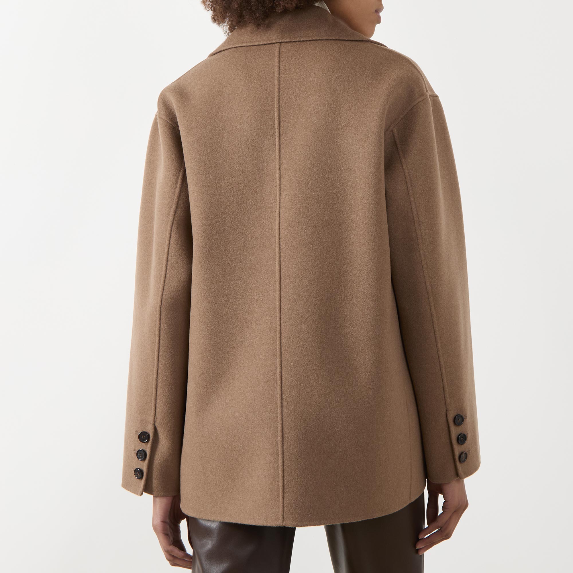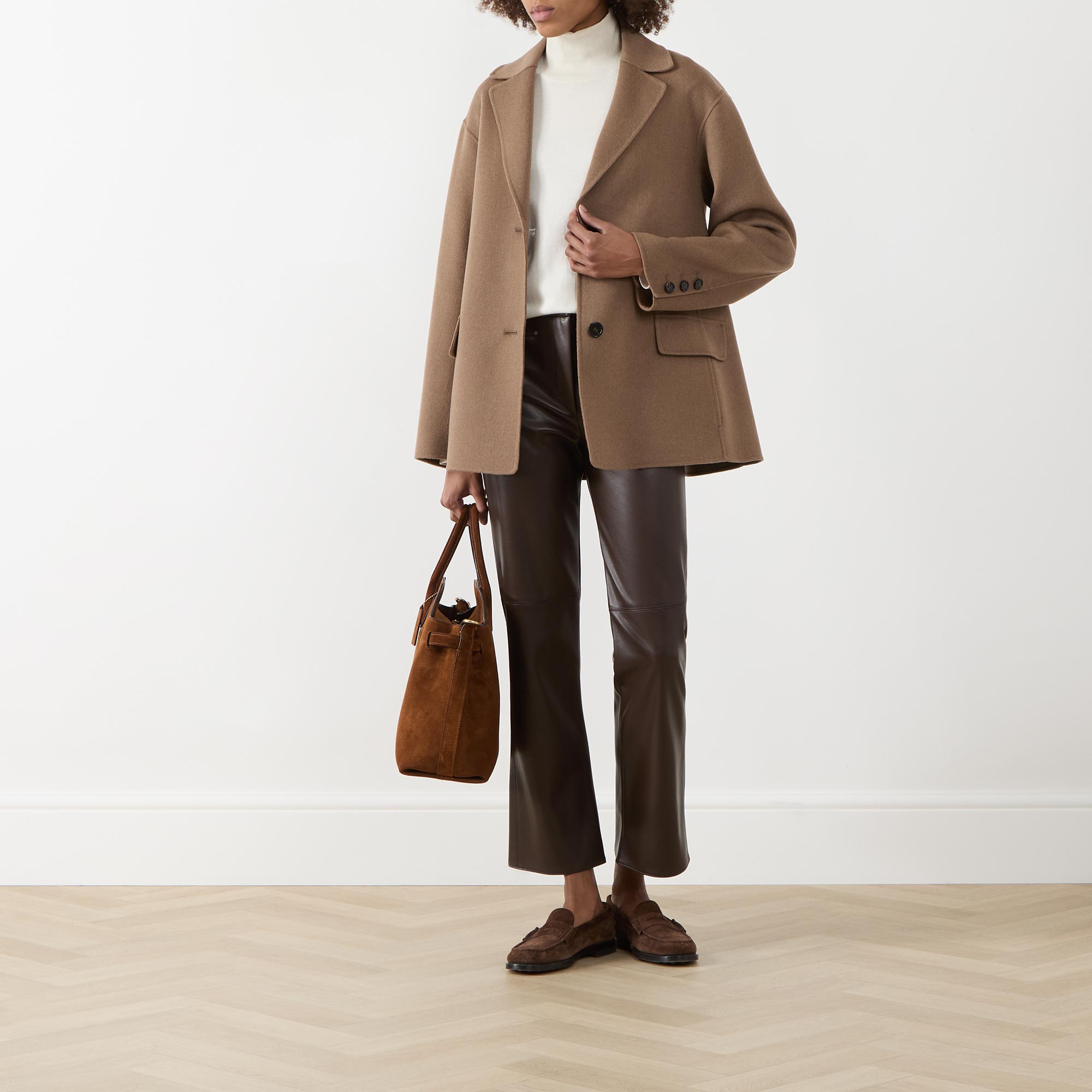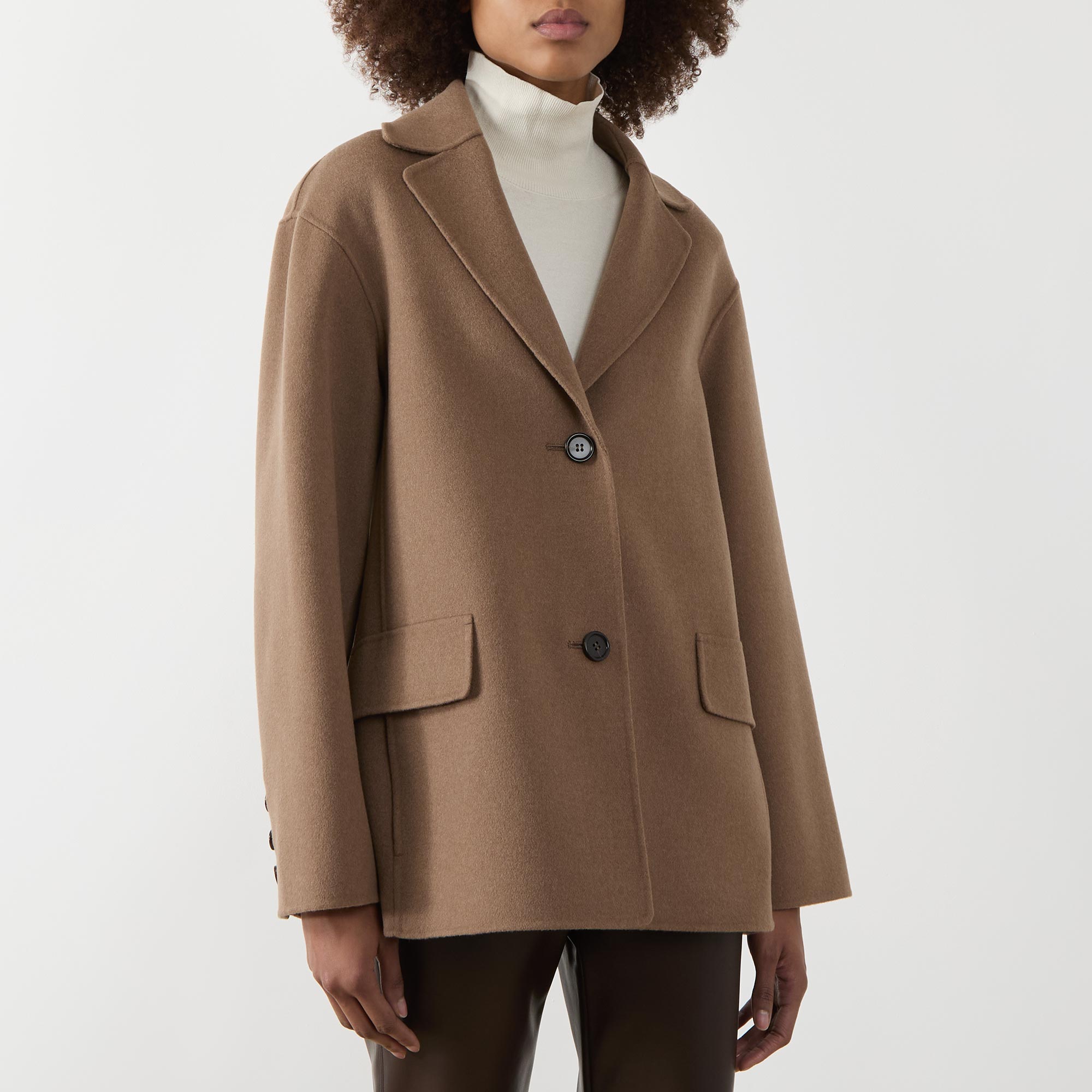 - Notched lapels, single-breasted, button fastening, flap pockets, side entry pockets, raised seams, buttoned cuffs, double-faced wool finish