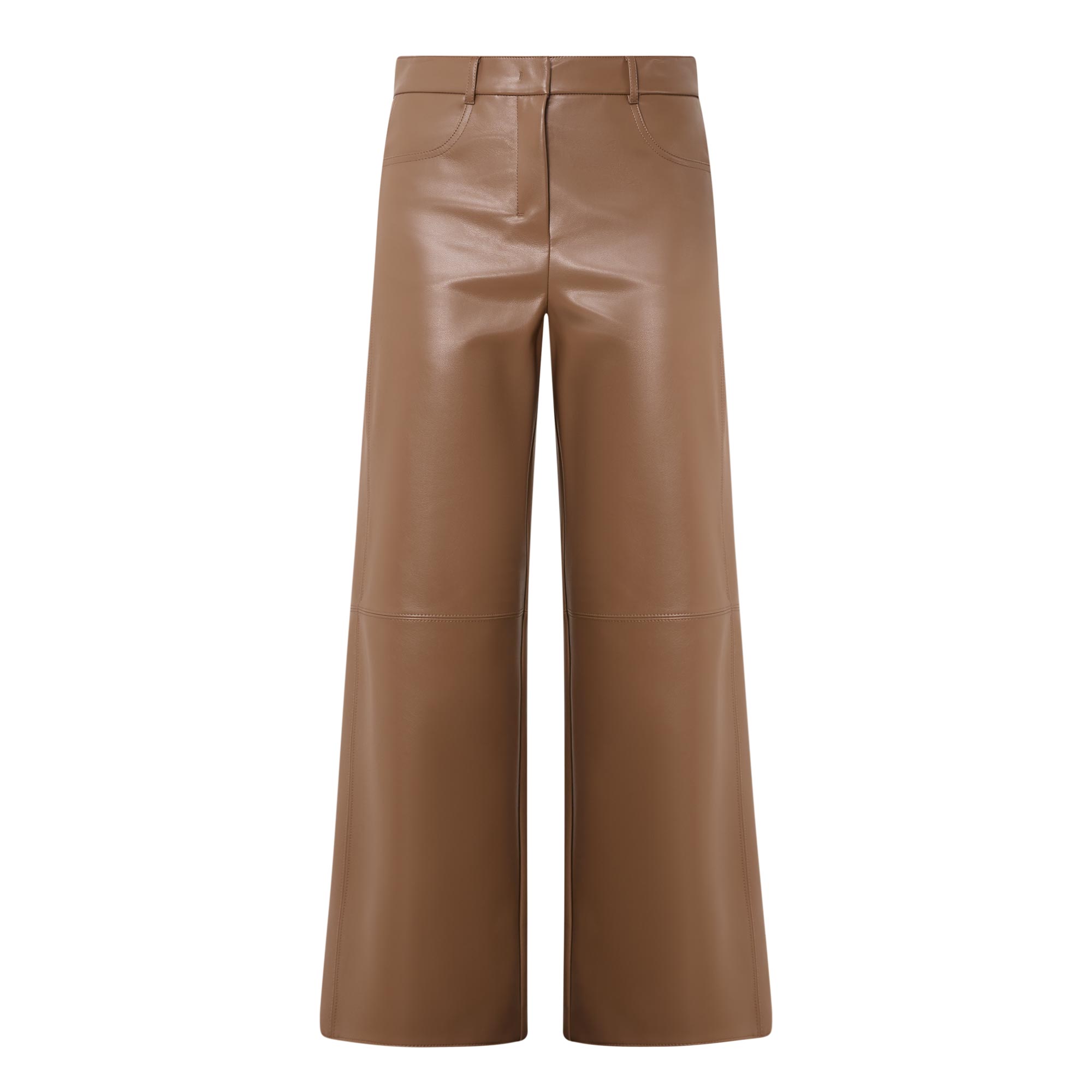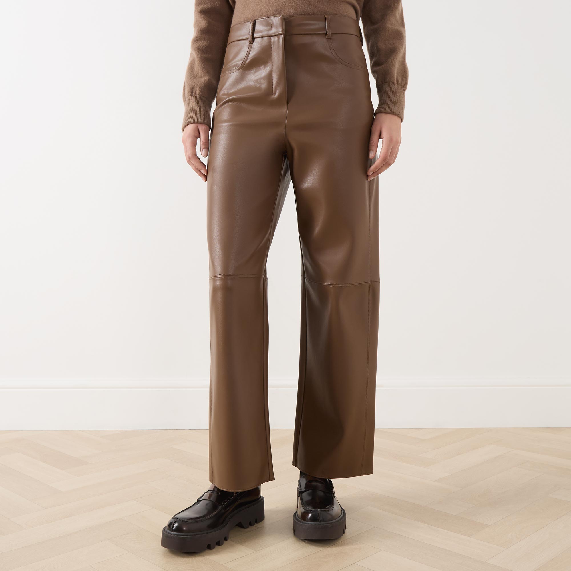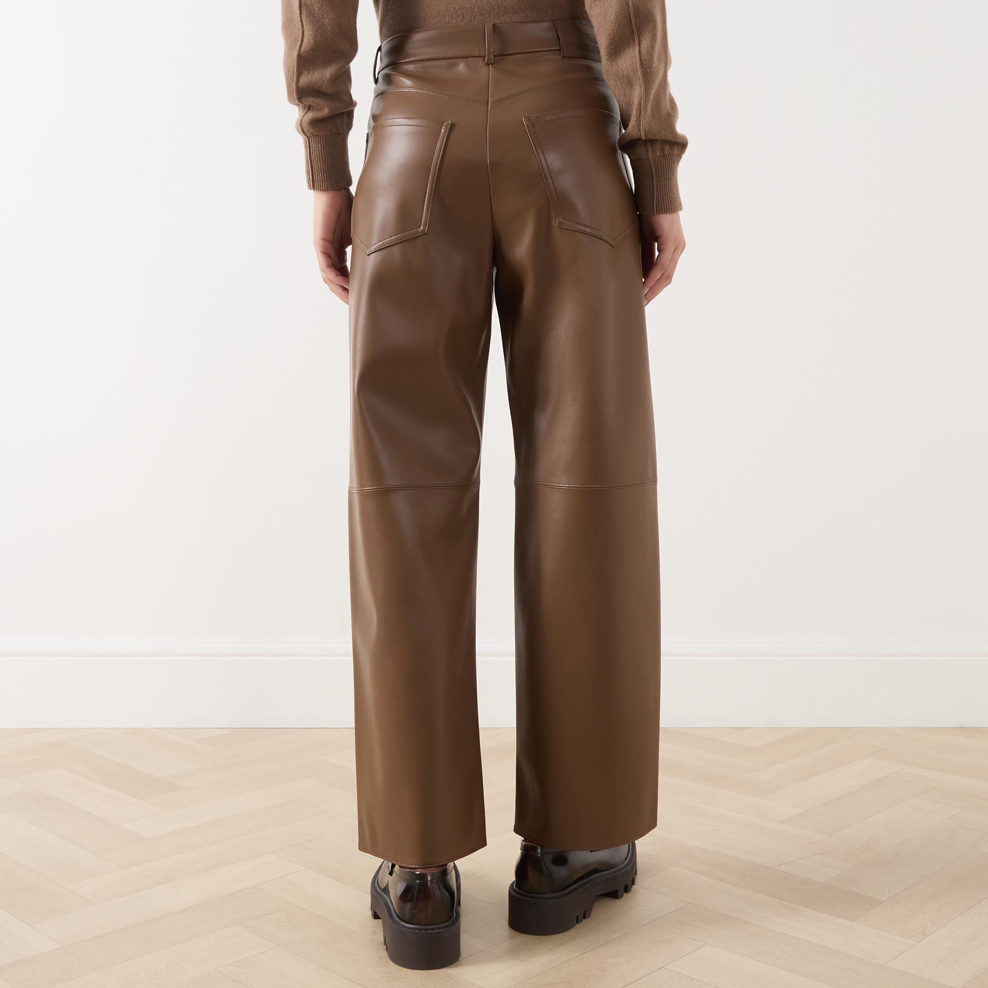 - Concealed zip-fly and hook-and-bar fastening, belt loops, four-pocket design, rear logo patch, high-rise, wide-cut leg, smooth faux leather finish