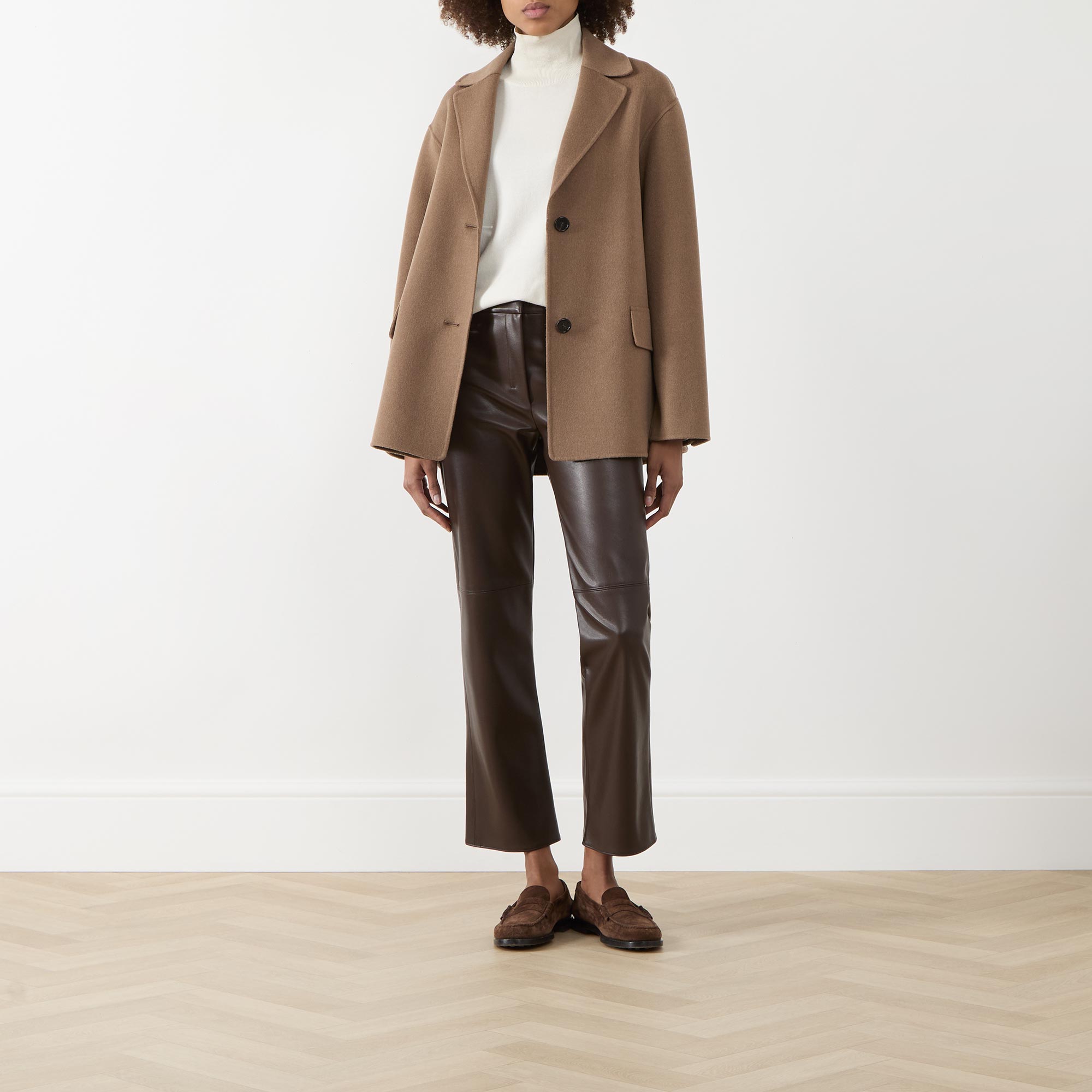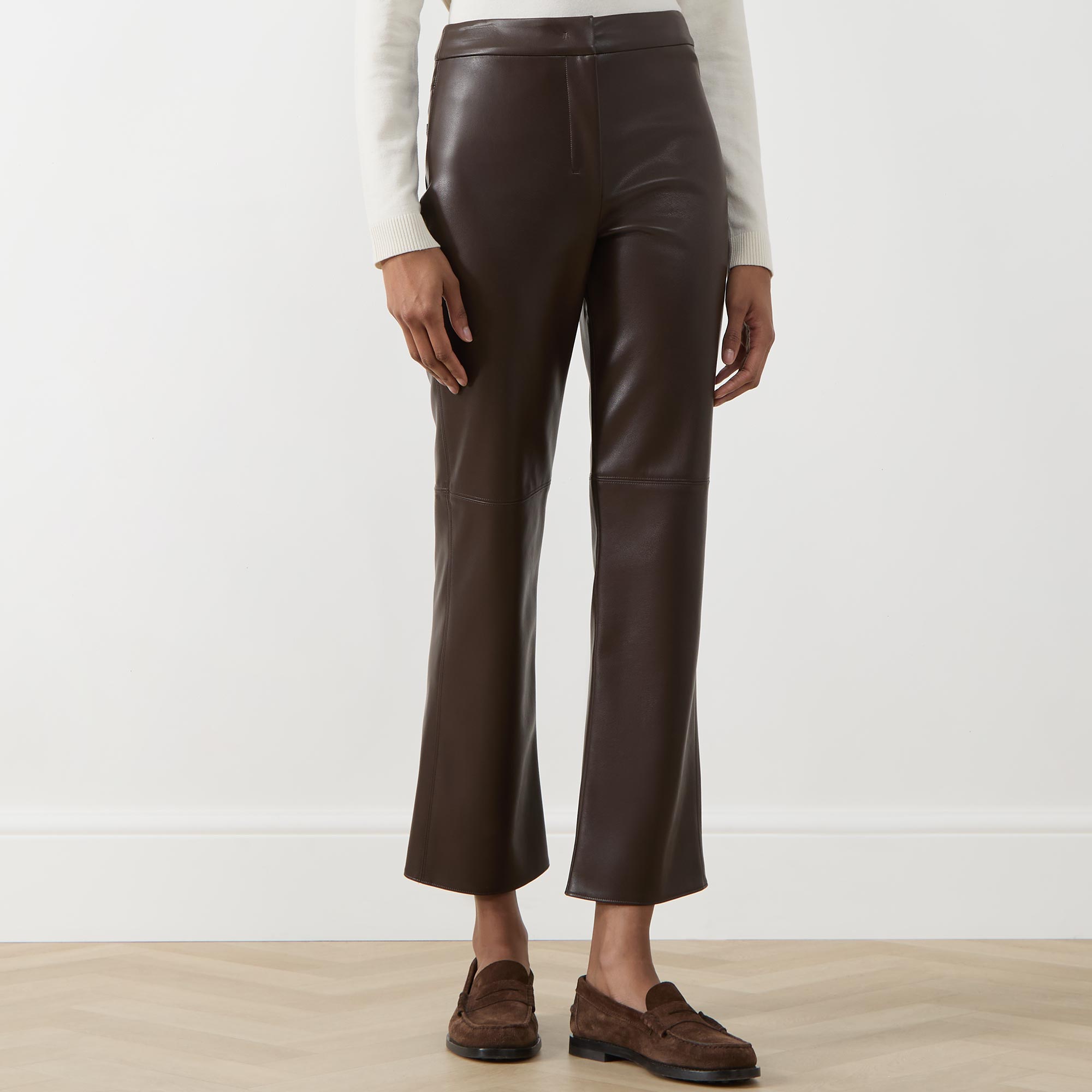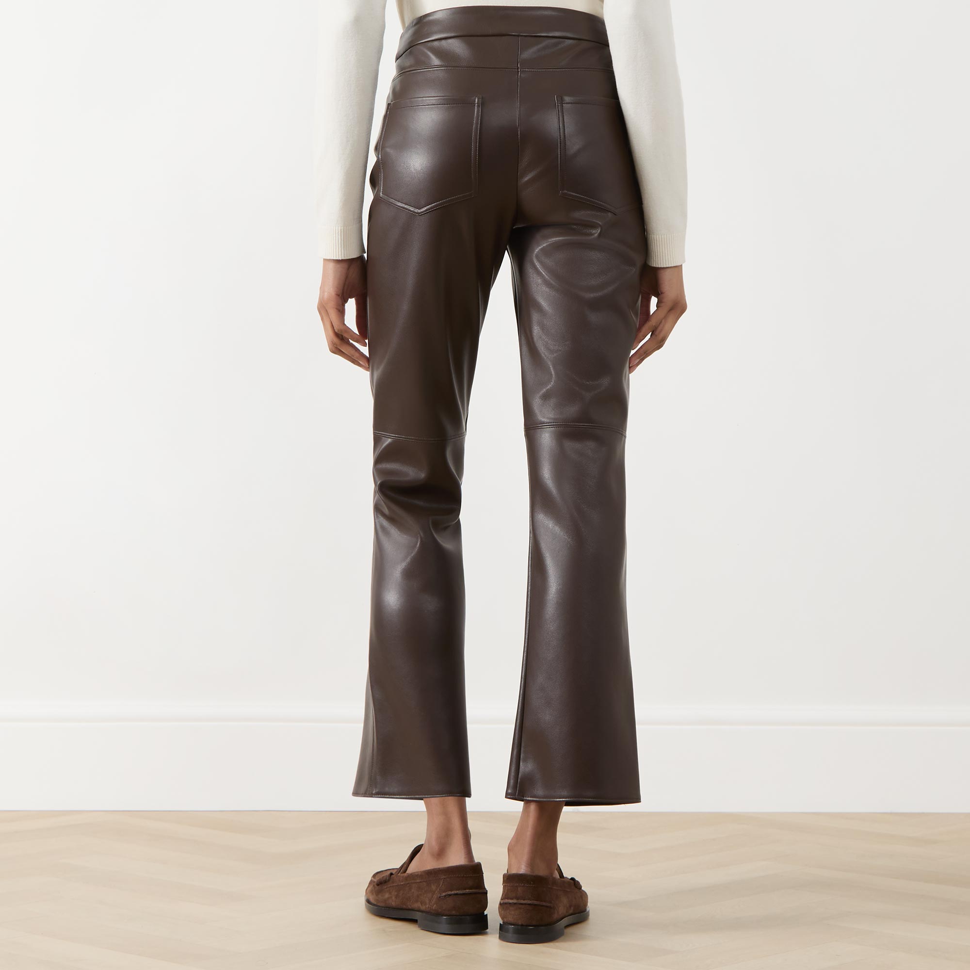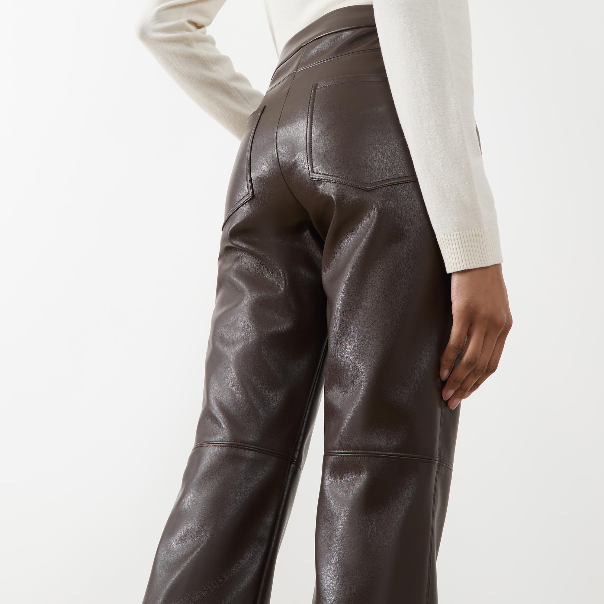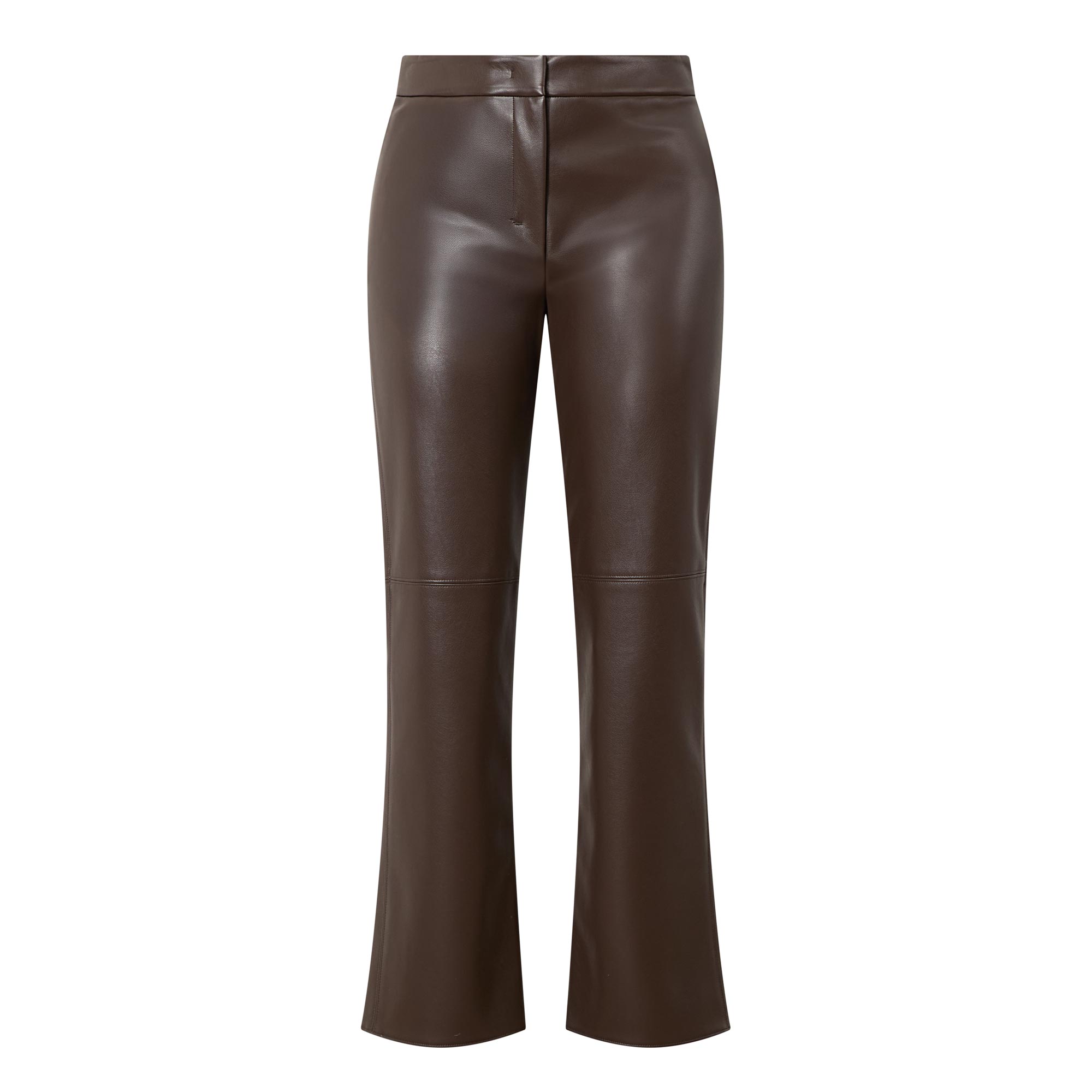 • Hook and bar with fly zip fastening, rear patch pockets, coated faux leather look, slightly flared hem