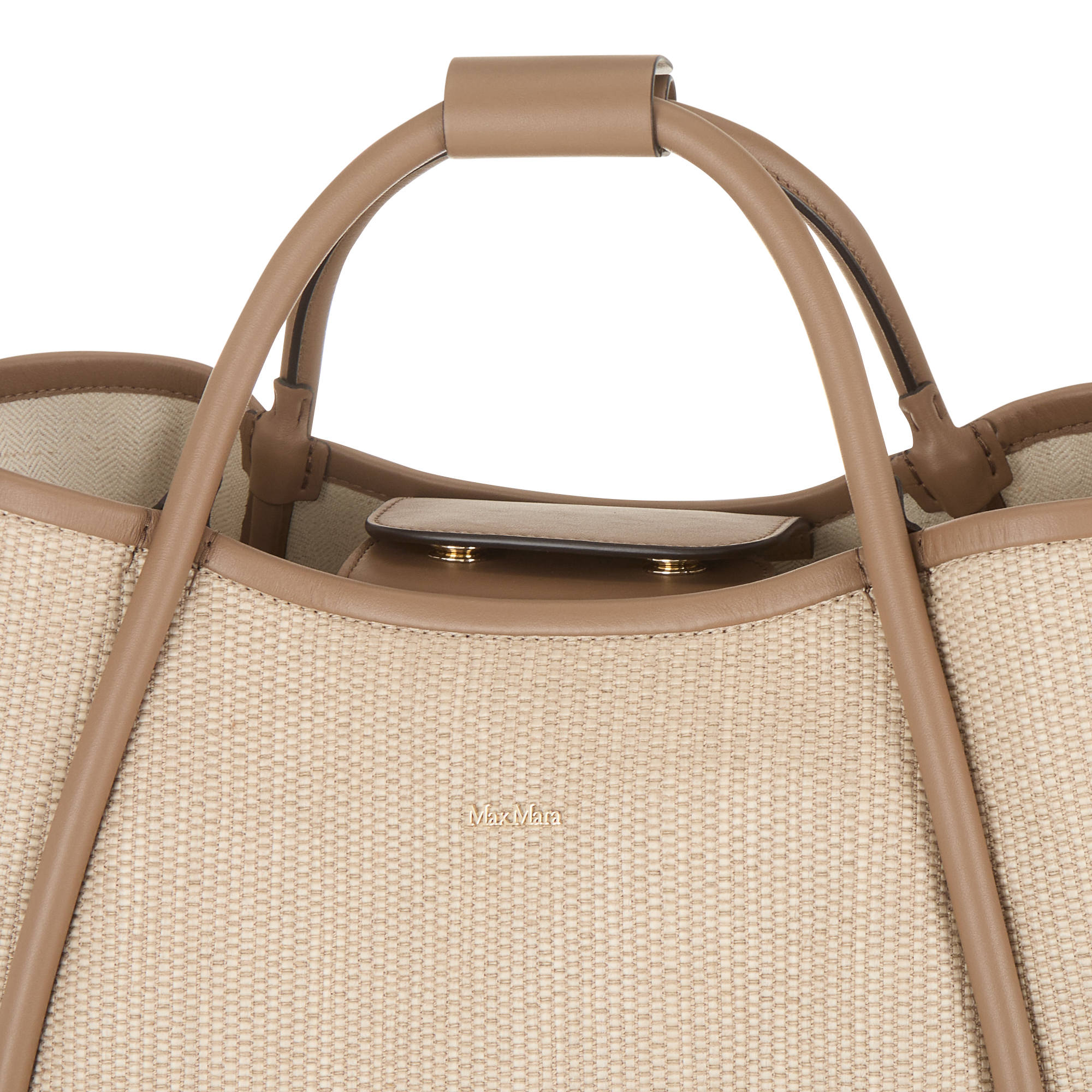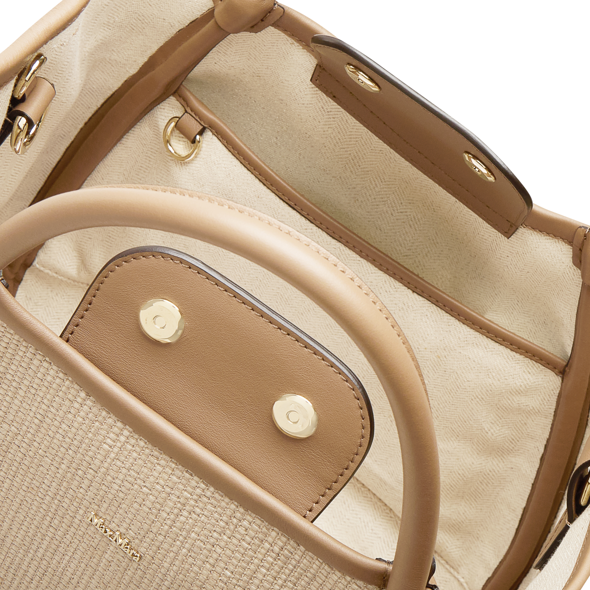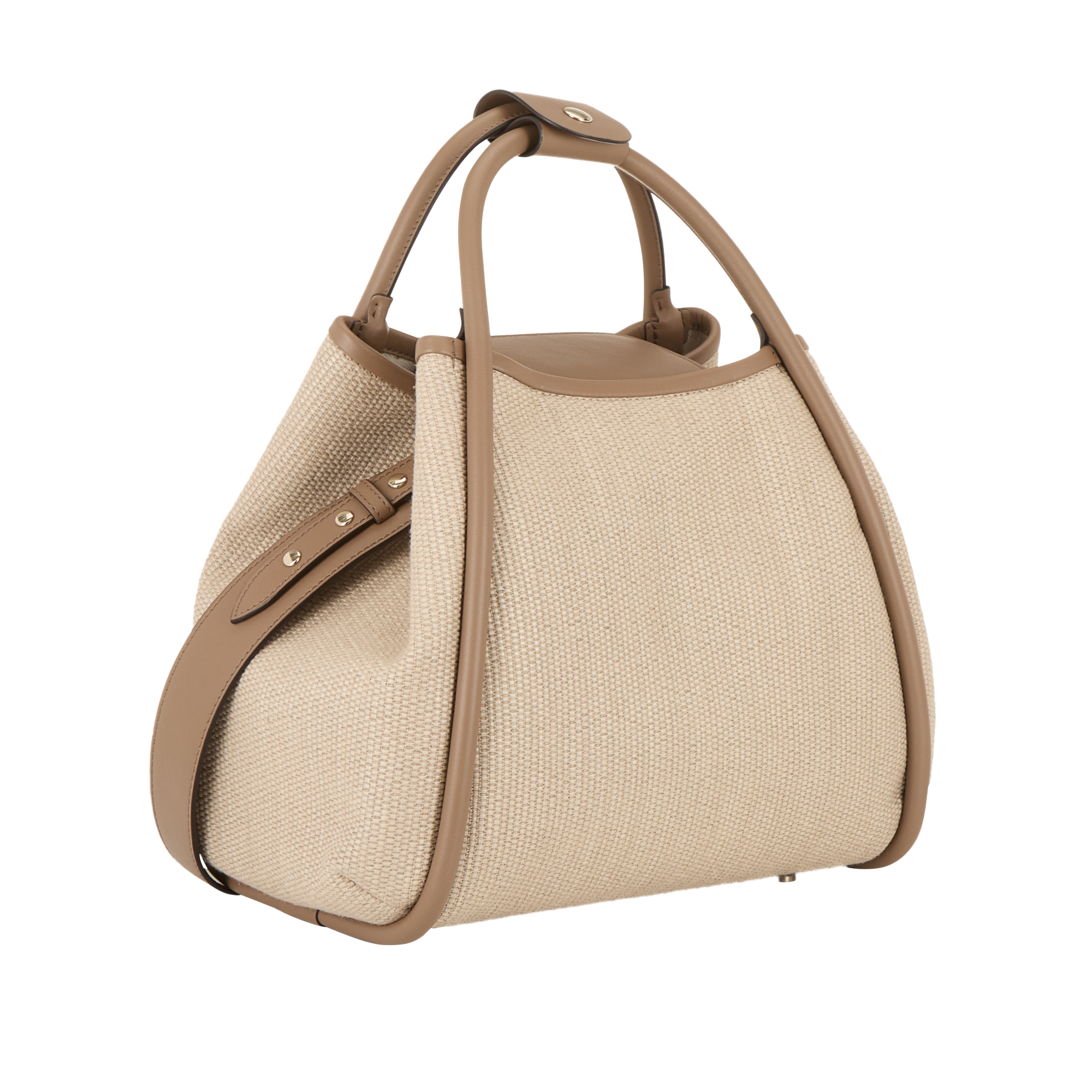- Top handles, snap button closure, flap with snap button fastenings, detachable and adjustable crossbody strap, four foot studs, gold-tone hardware, woven design, logo detail