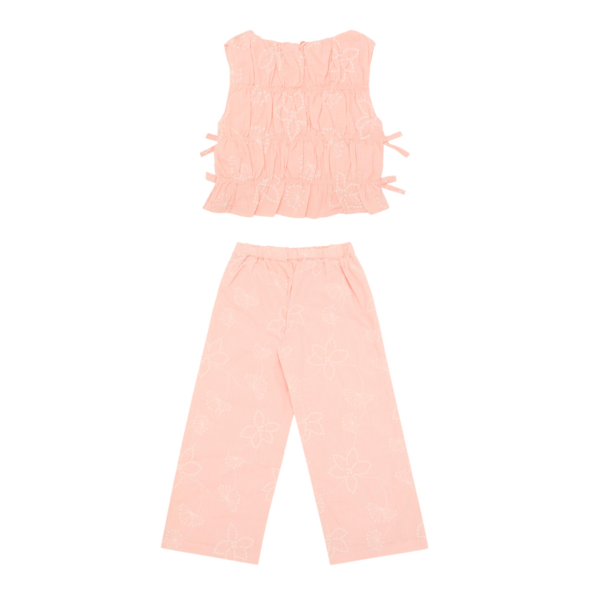 - Top: Round neckline, sleeveless, smocked structure, broderie anglaise detailing, adjustable ties at side