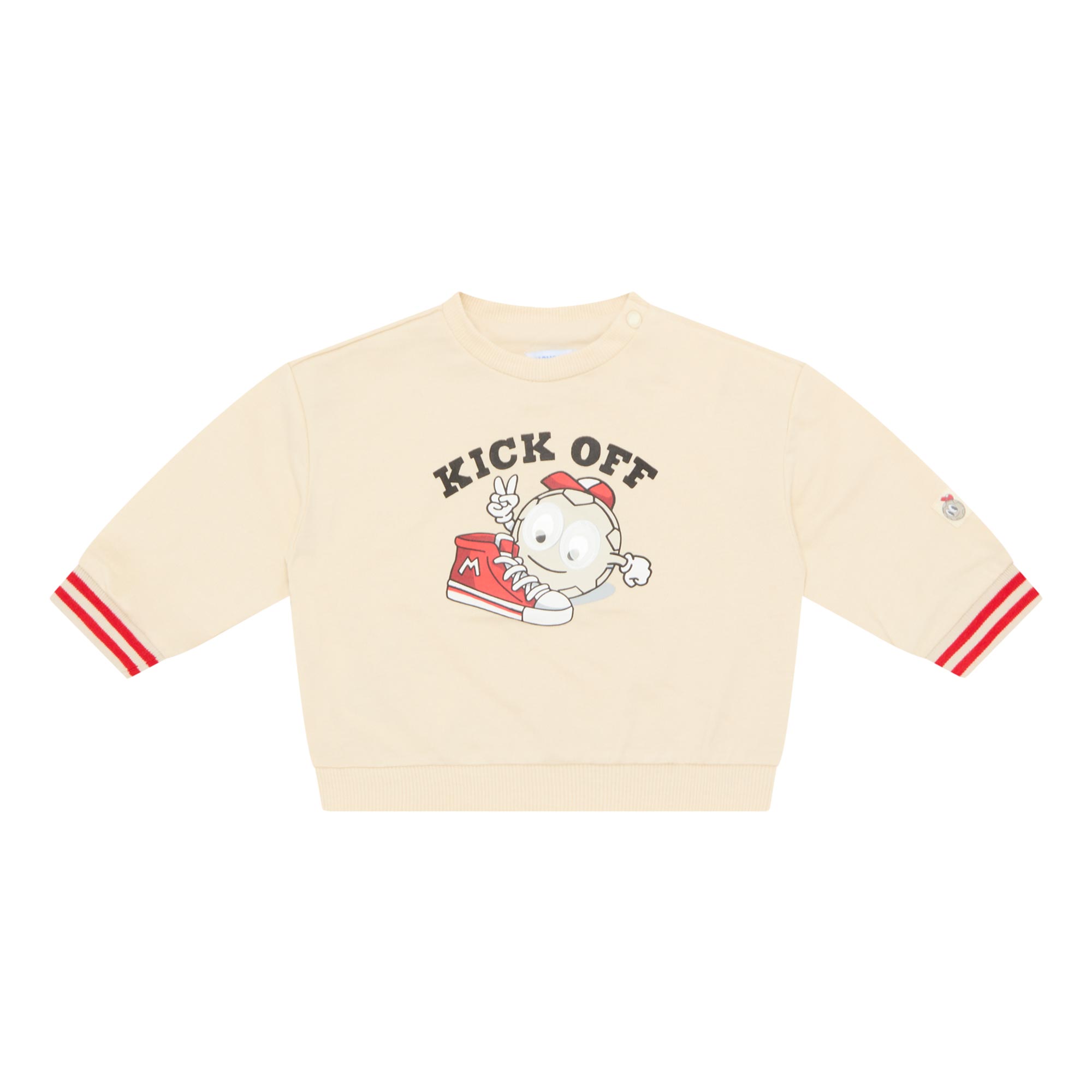 - Round neckline, long sleeves, ribbed trims, stripe and badge details, kick off graphic, snap button fastening