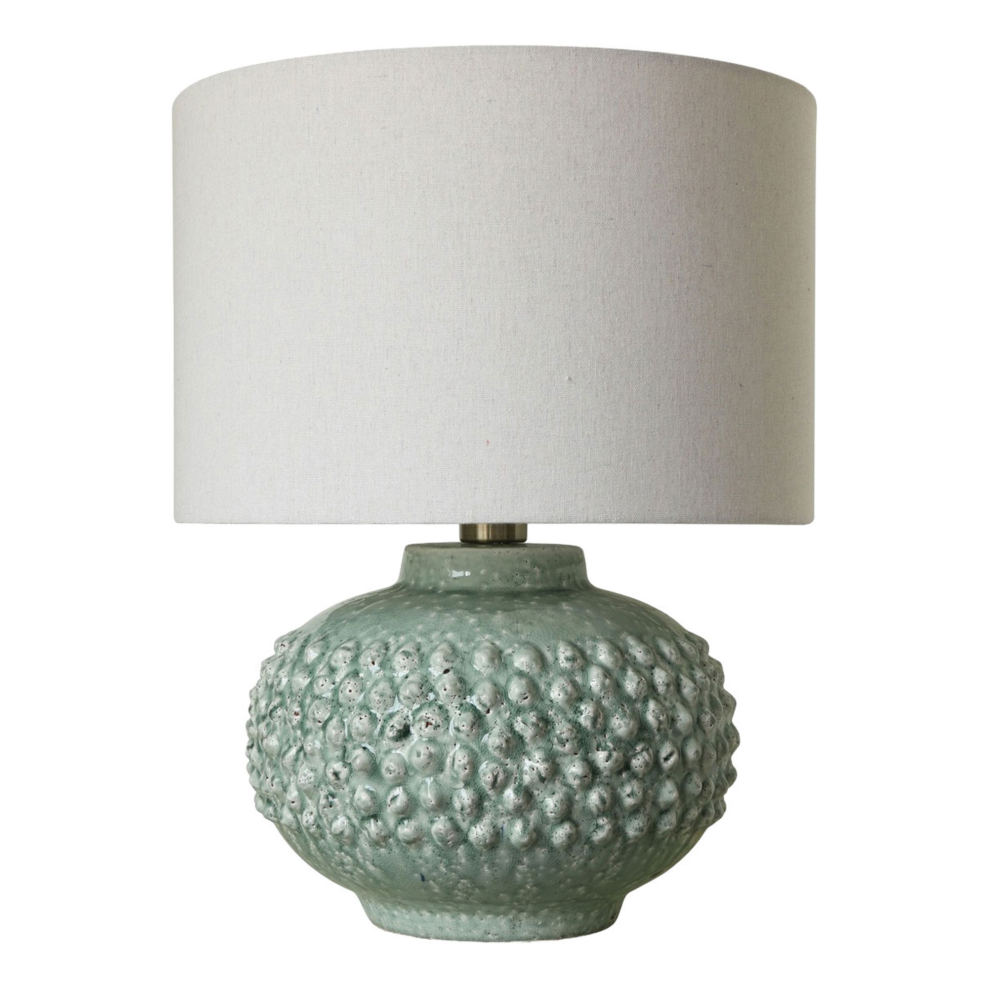 The Arabella Lamp from Mindy Brownes is a sculptural statement piece. Its generously rounded ceramic base features a raised bubbled texture that feels both playful and sophisticated. The soft green glaze enriches the form and adds a soothing quality. A neutral linen textured shade brings balance and refinement to the bold artistic base. This lamp brings warmth style and a touch of creative charm to any room and adds beautifully to a curated interior.