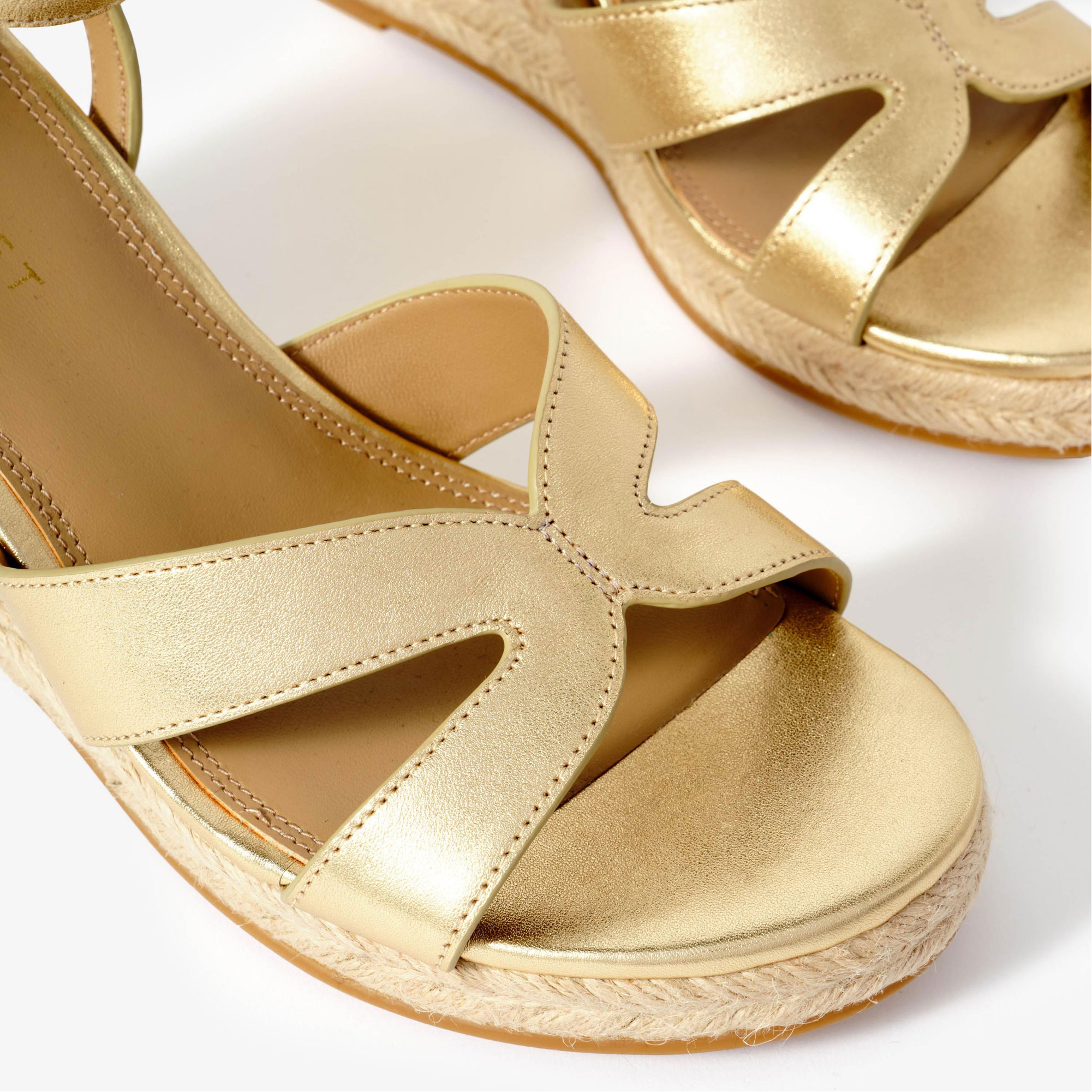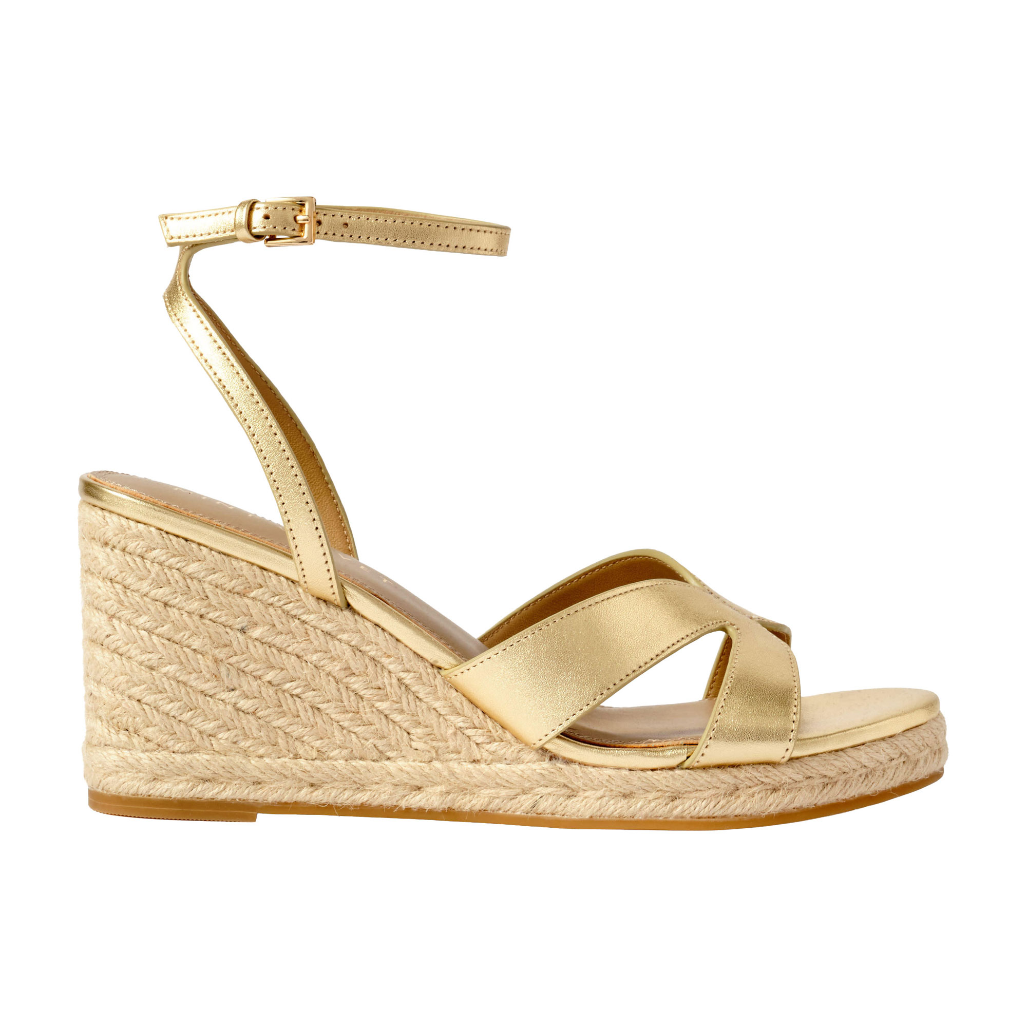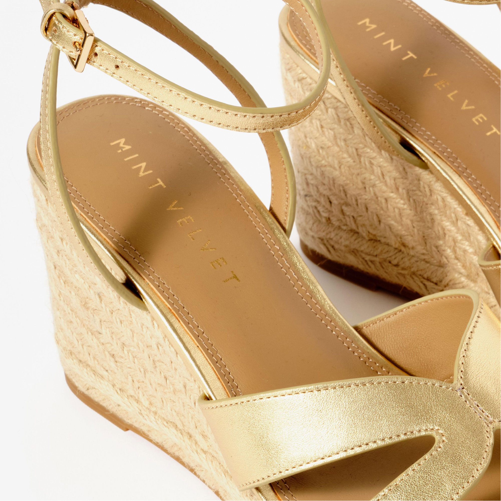 - Open toe sandals, wedge espadrille sole, ankle strap fastening, gold-tone hardware