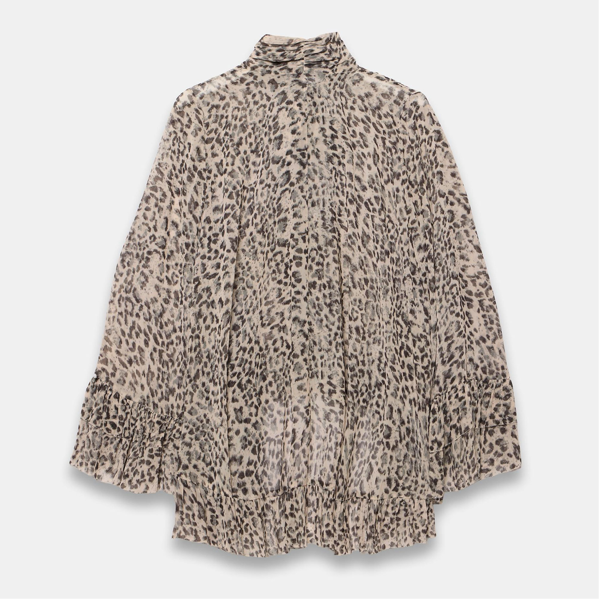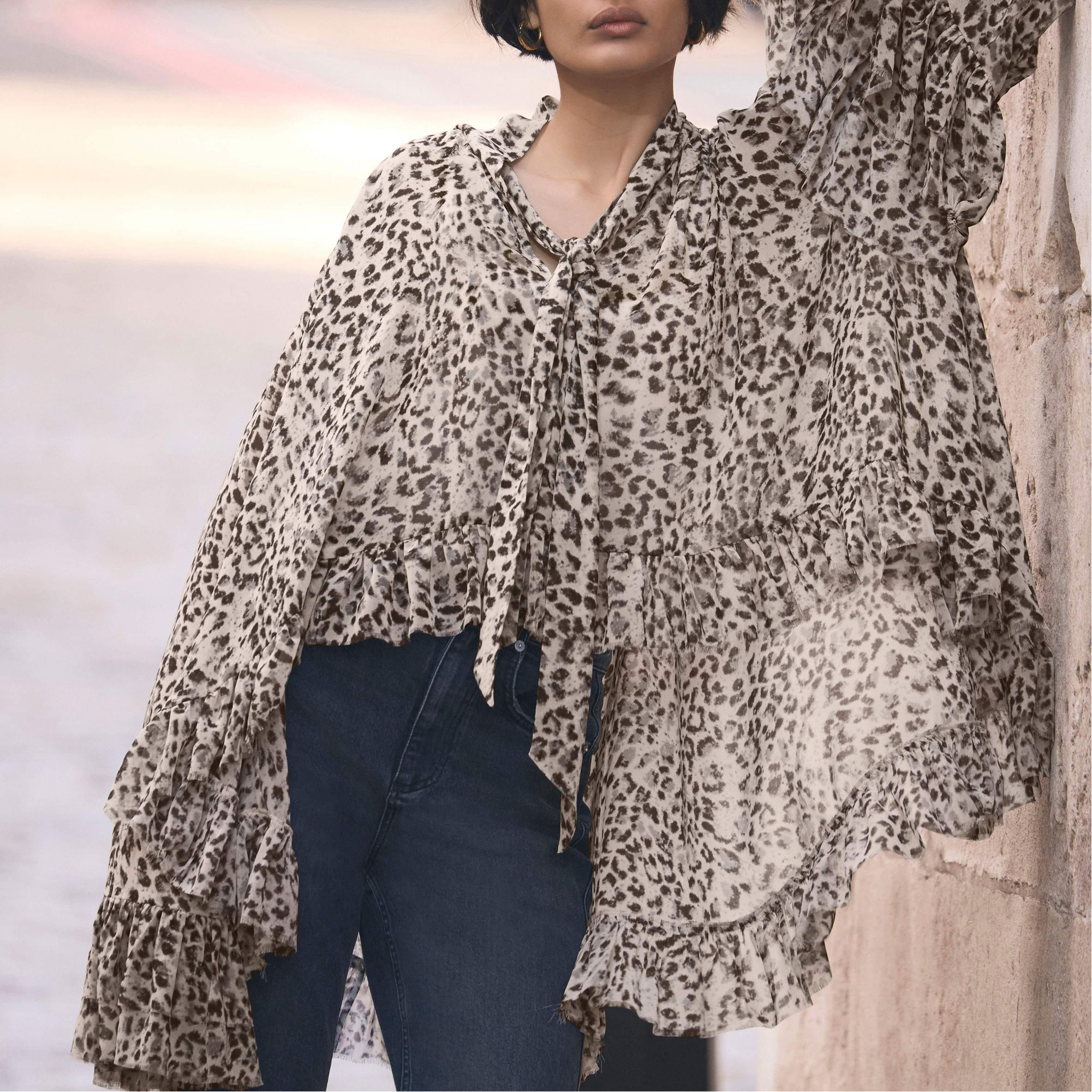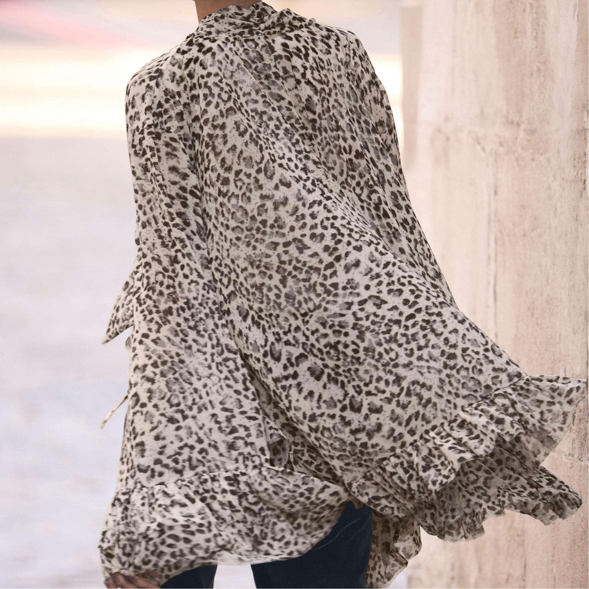 • Leopard print, high neckline, long sleeves, layered fluted cuffs, drop back, ruffle hemline, front tie fastening