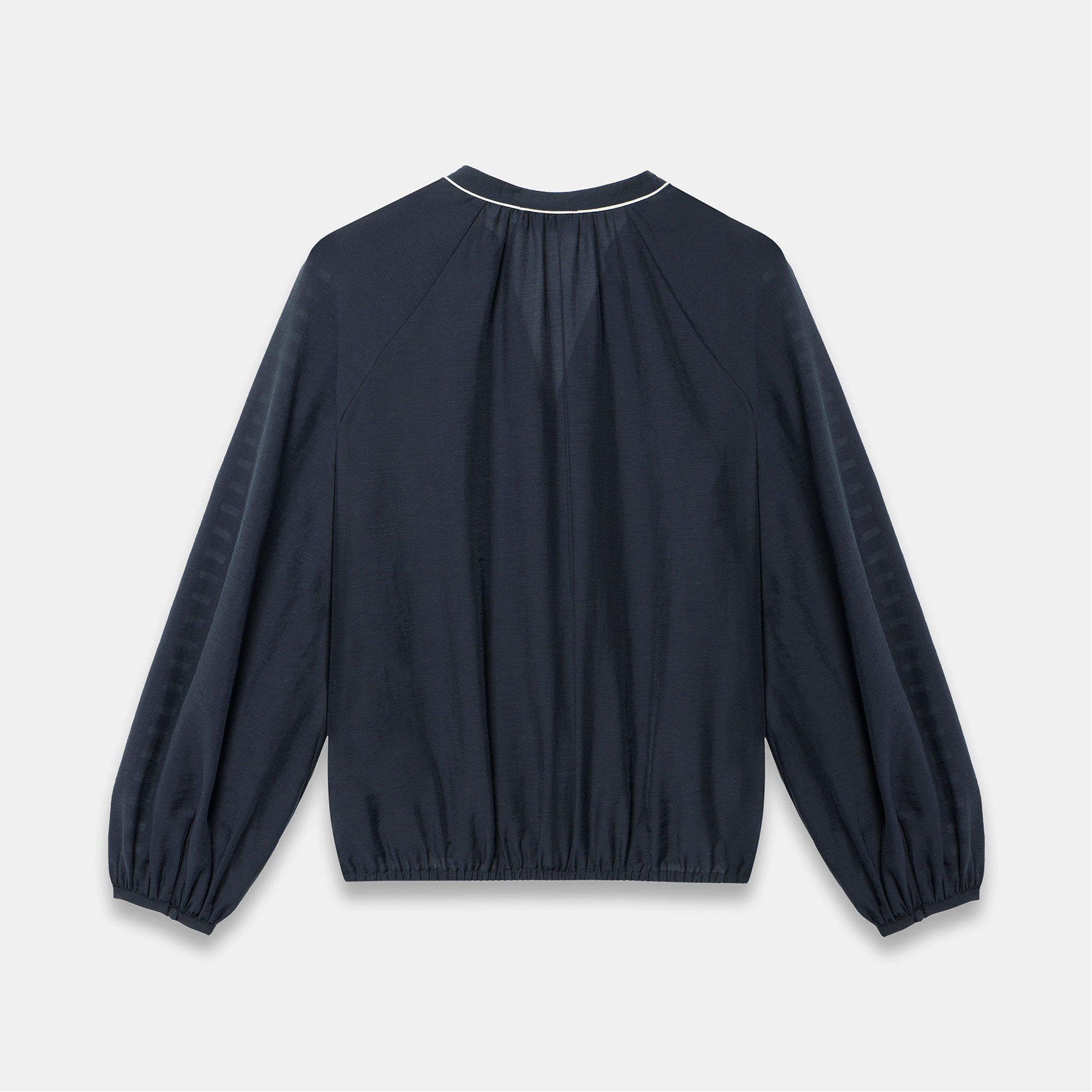 • V-neckline, piped collar, long sleeves, contrast whipstitch detailing, buttoned cuffs, elasticated waistband, front button fastenings
