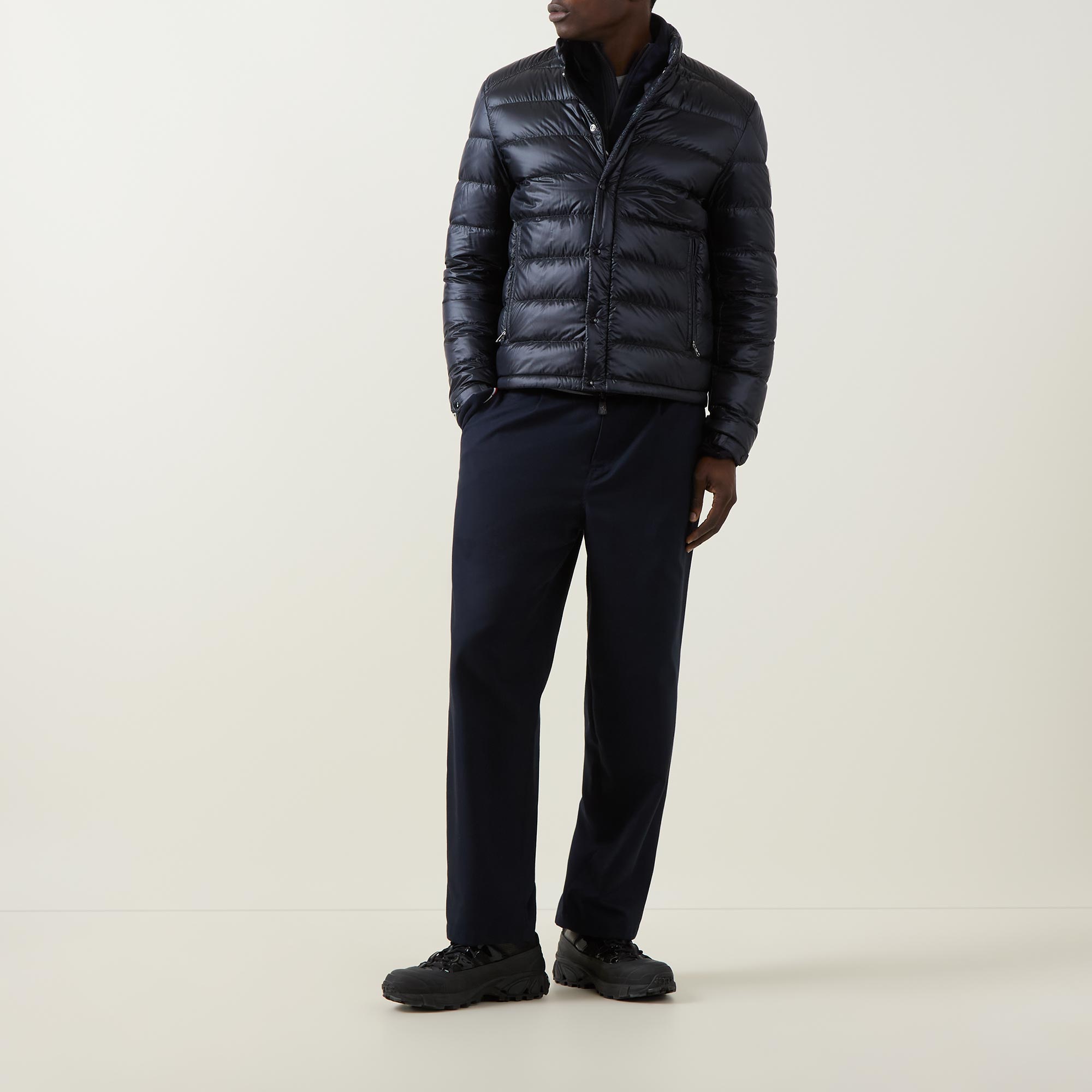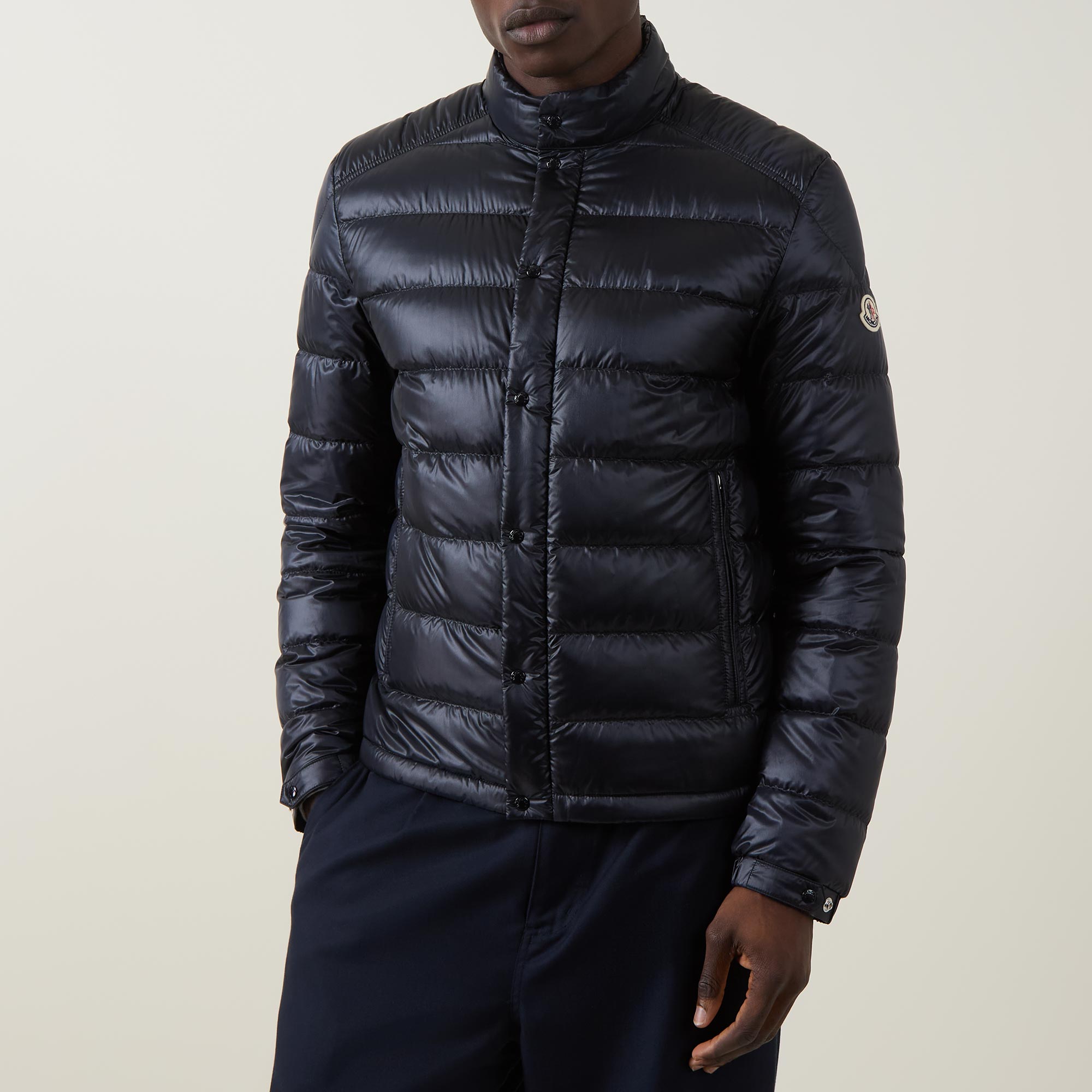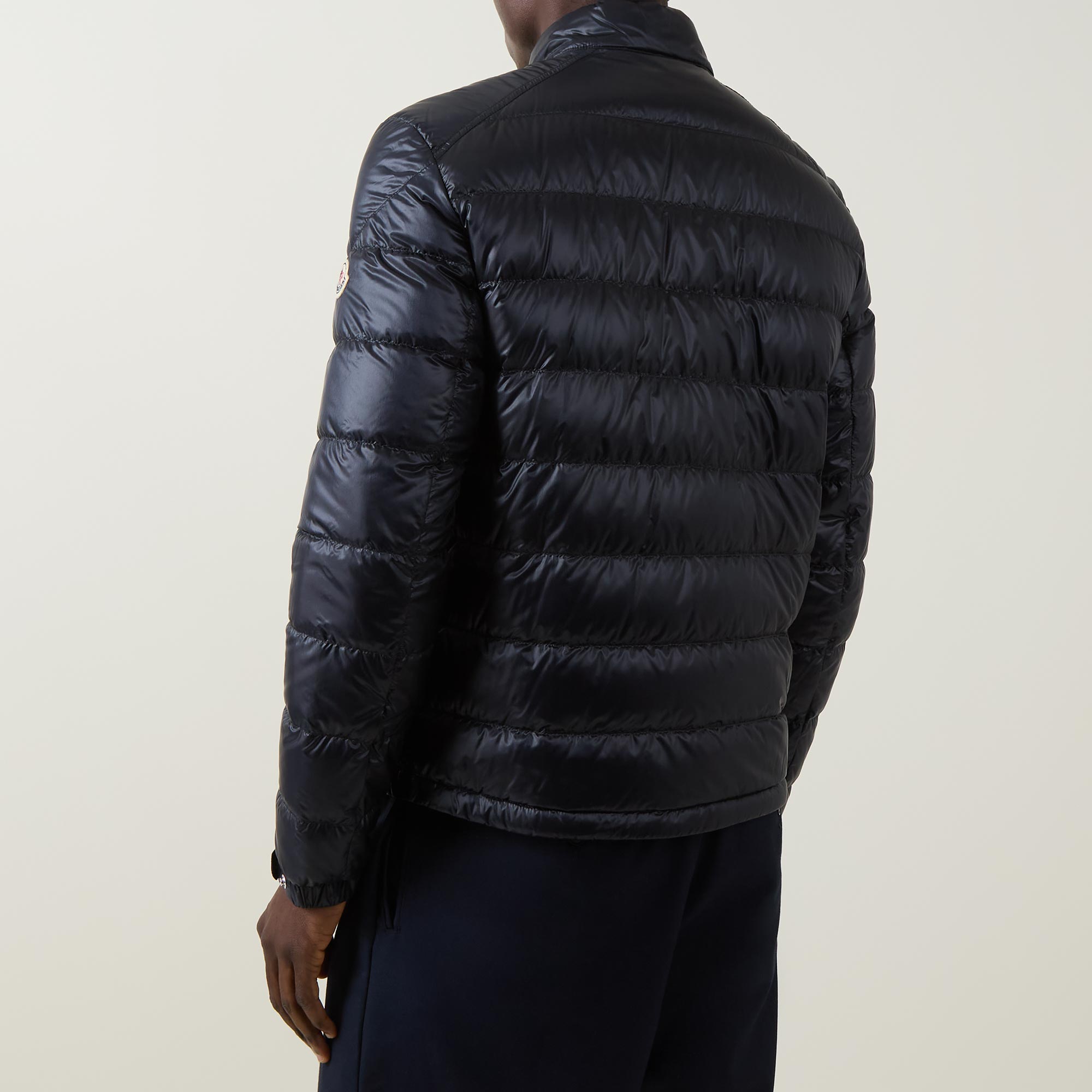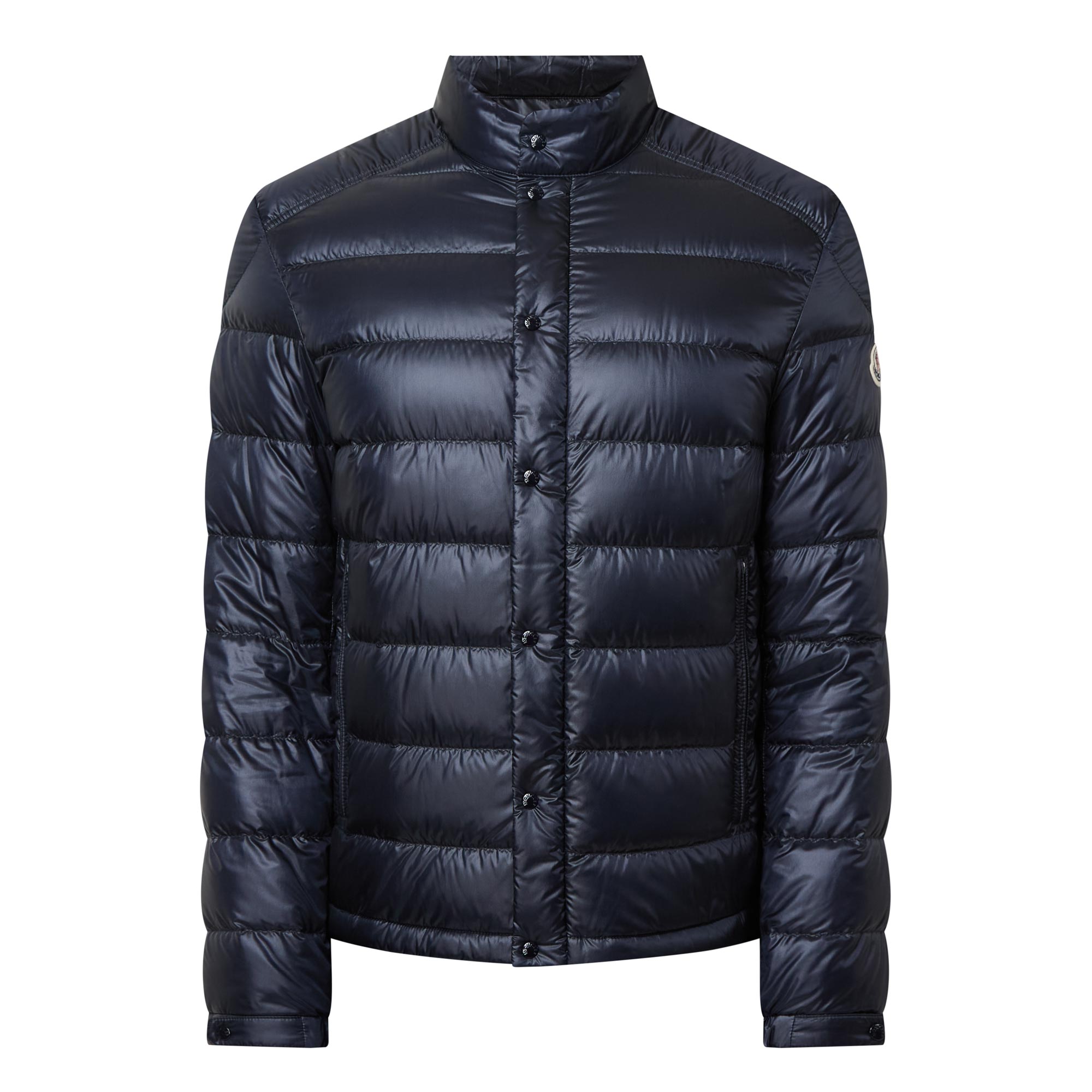 • Stand collar, long sleeves, snap button cuffs, front snap button placket, two side entry pockets with zip fastenings, straight hem with drawstring closure, felt logo detail, boudin-quilted design, glossy finish, down-filled, lightweight