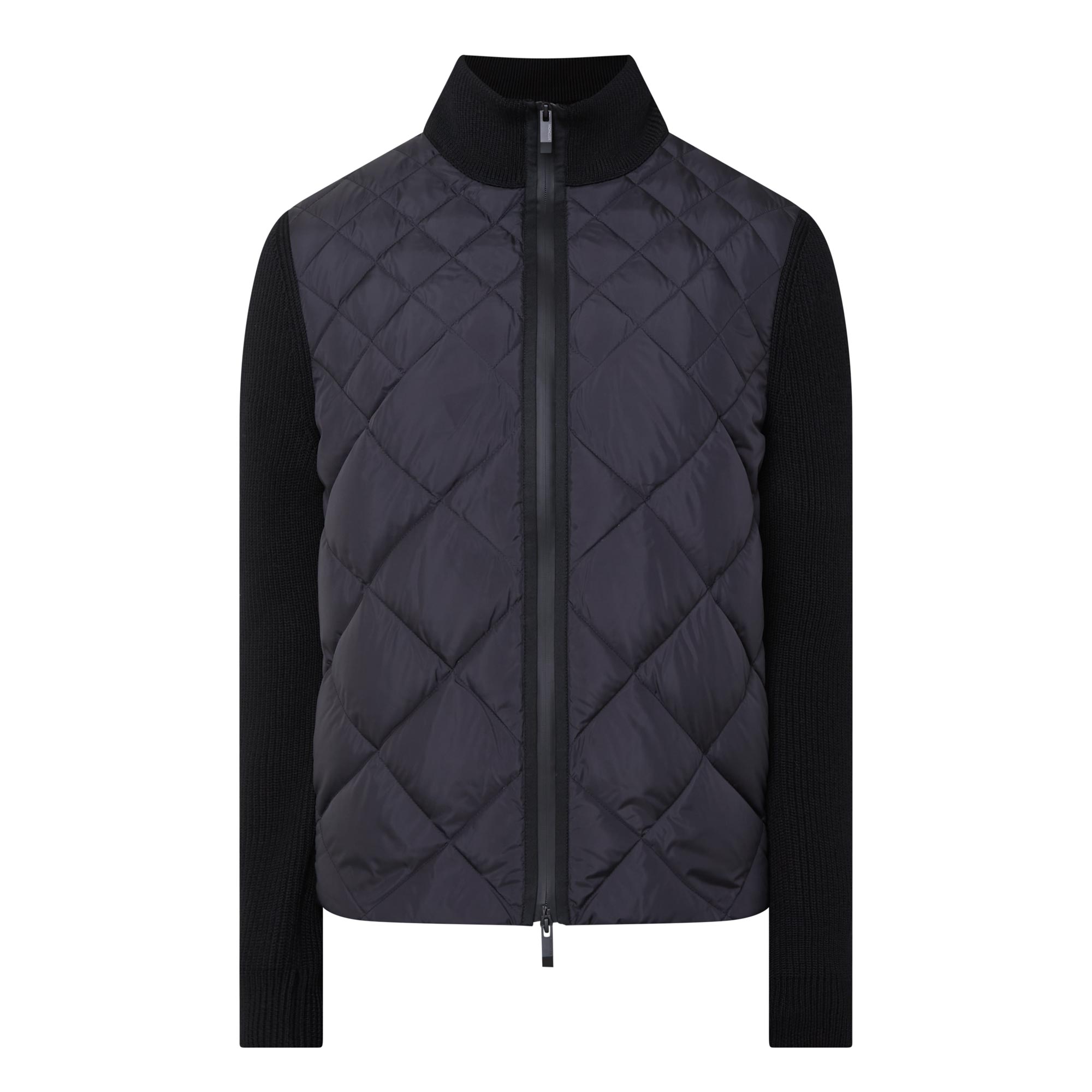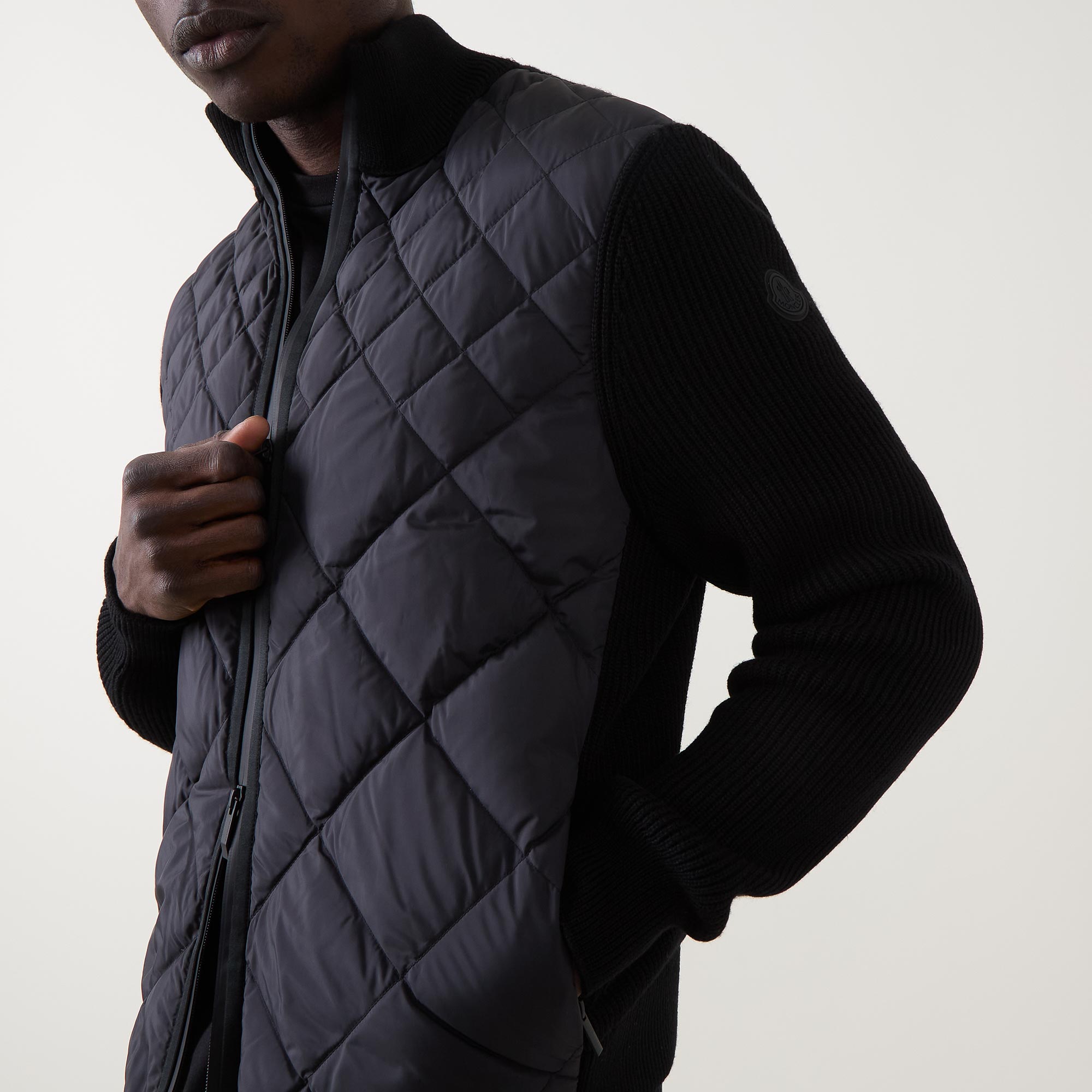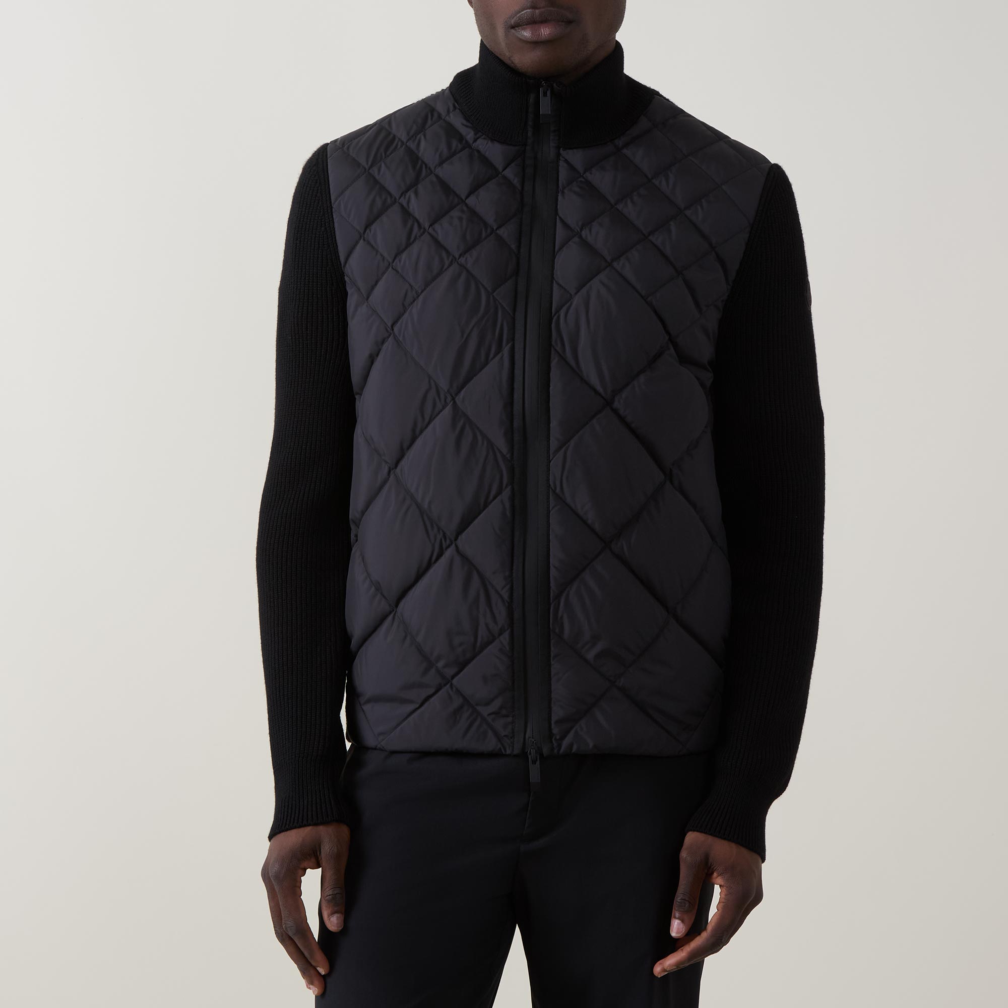 - Stand collar, long knitted sleeves, two-way front zip fastening, two side entry pockets, straight hem, ribbed trims, quilted front, knitted back, lightly padded, tonal logo badge