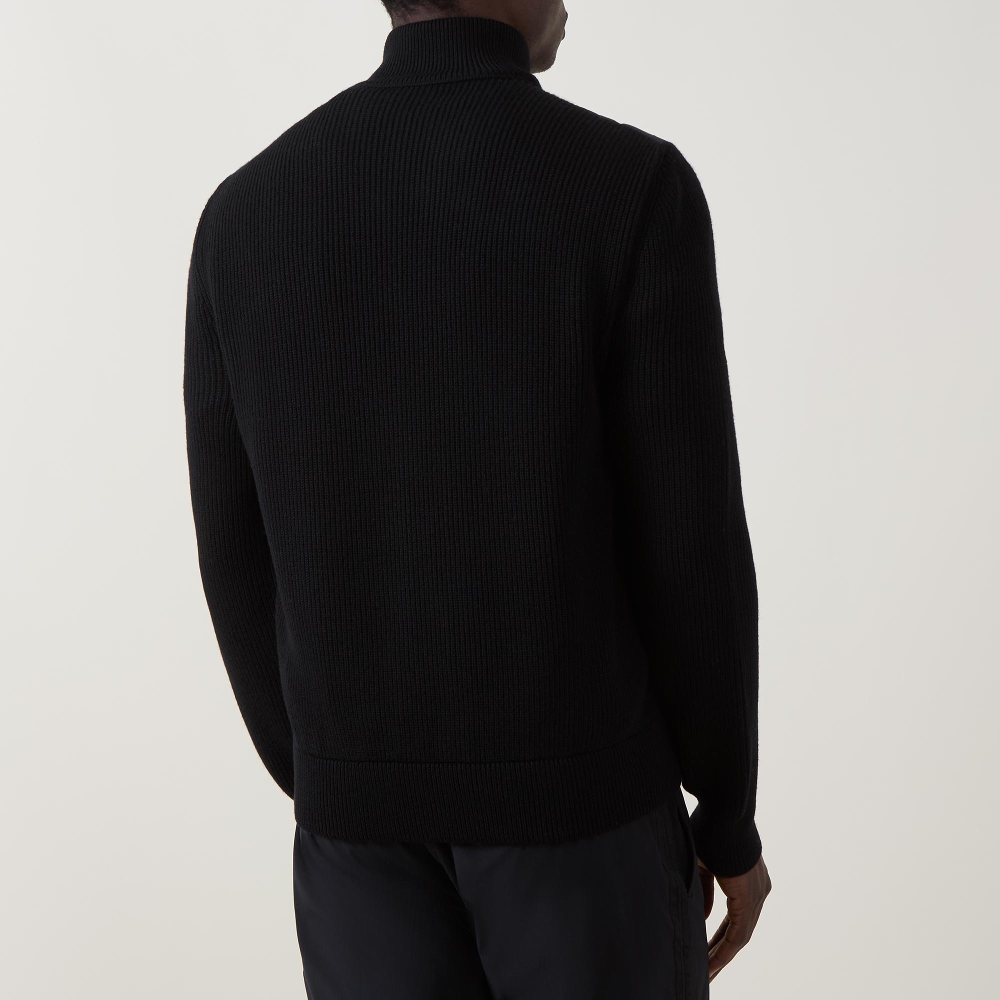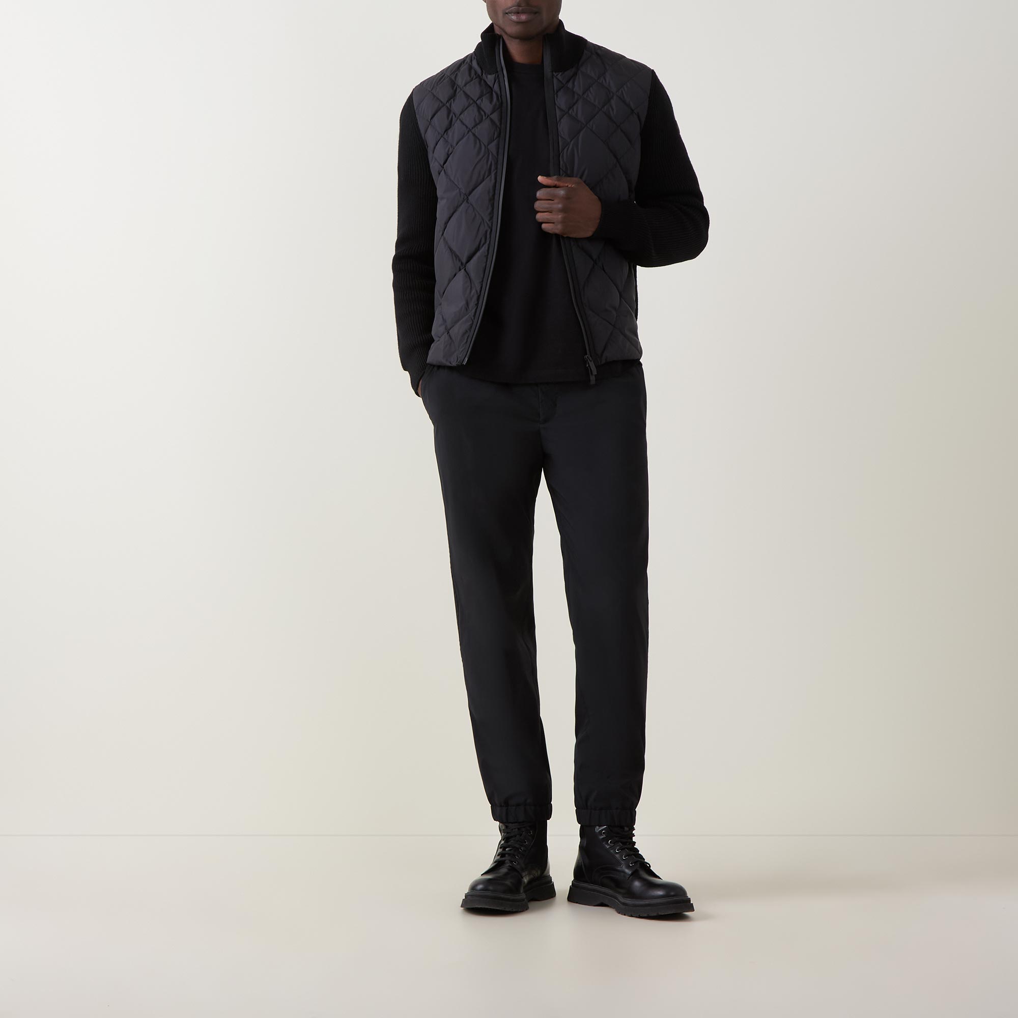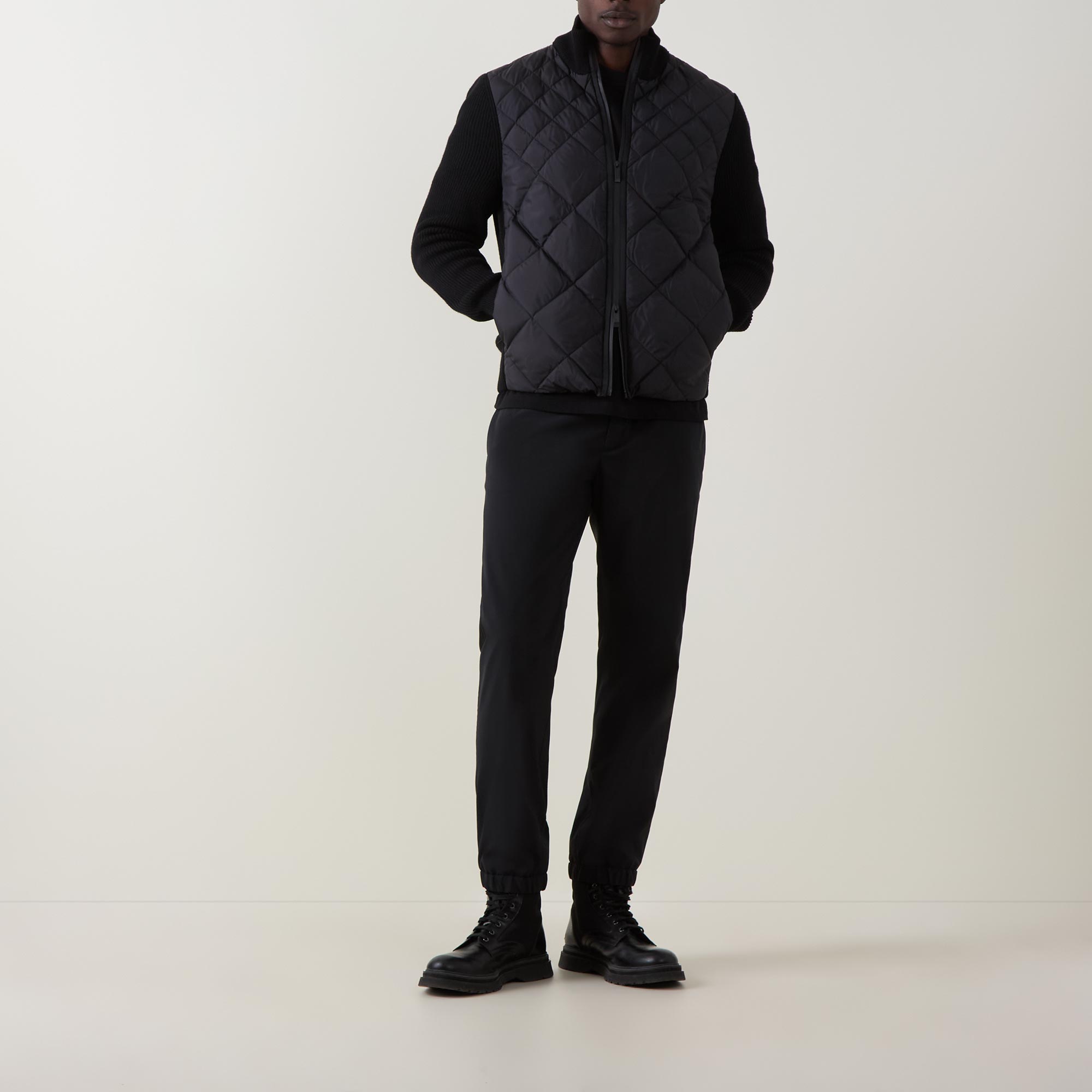 - Stand collar, long knitted sleeves, two-way front zip fastening, two side entry pockets, straight hem, ribbed trims, quilted front, knitted back, lightly padded, tonal logo badge