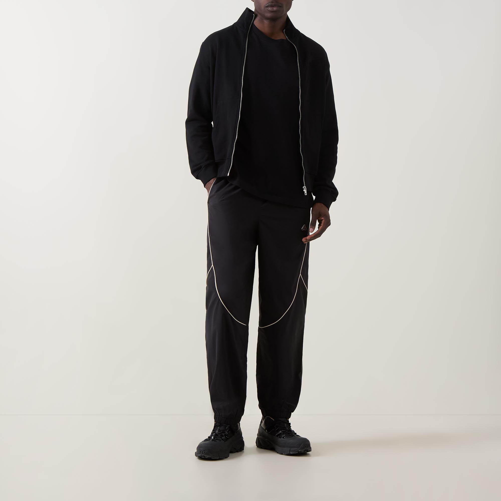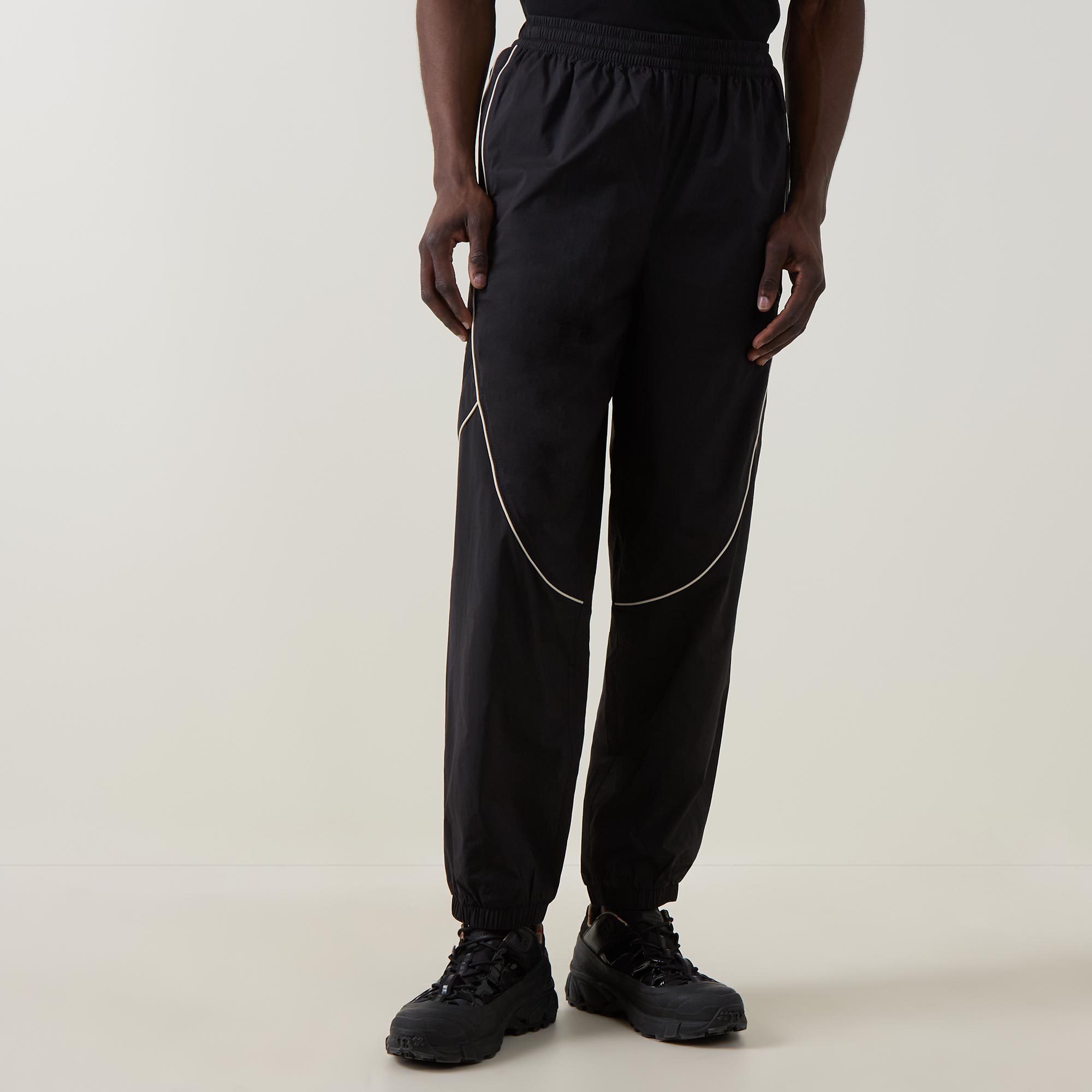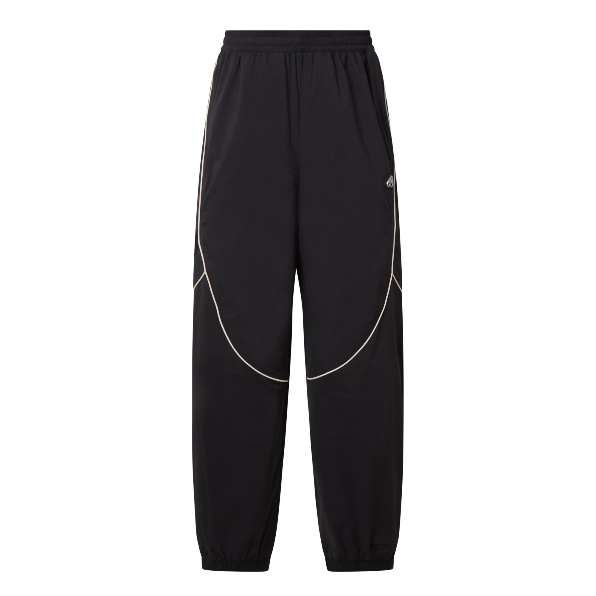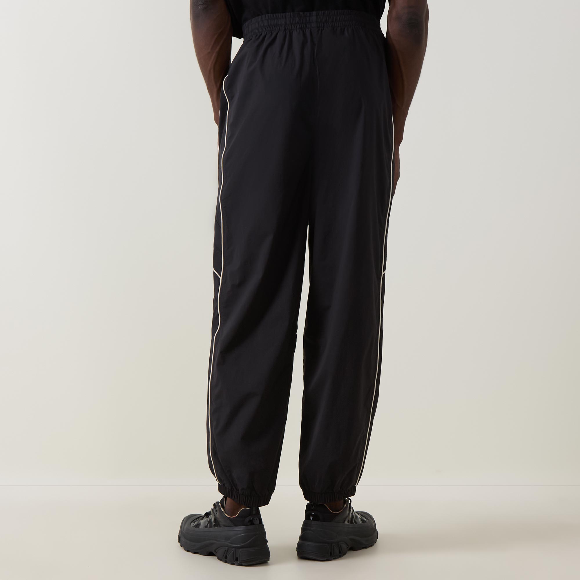 - Mid-rise, straight leg, elasticated waistband, two side entry pockets, contrast piping throughout, cuffed ankles, logo hardware
