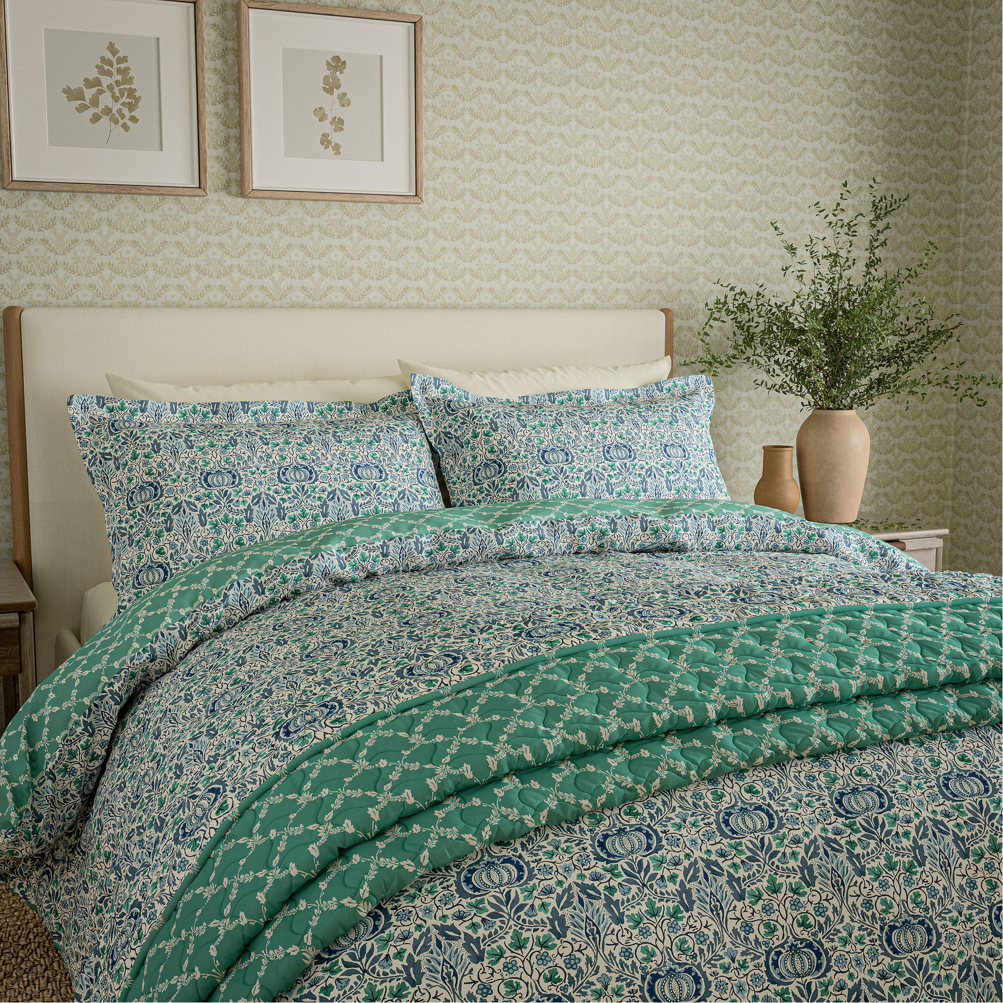 Pomegranates and Indian-inspired motifs cover this small-scale Morris & Co. design, Little Chintz, that has been beautifully transformed for bedding. Featuring a duvet, with a reverse trellis design, matching Oxford pillowcases included, finish the look and add the quilted throw, beautifully bordered with the trellis design. Duvet set includes pillowcase(s). Available in a selection of colourways.
