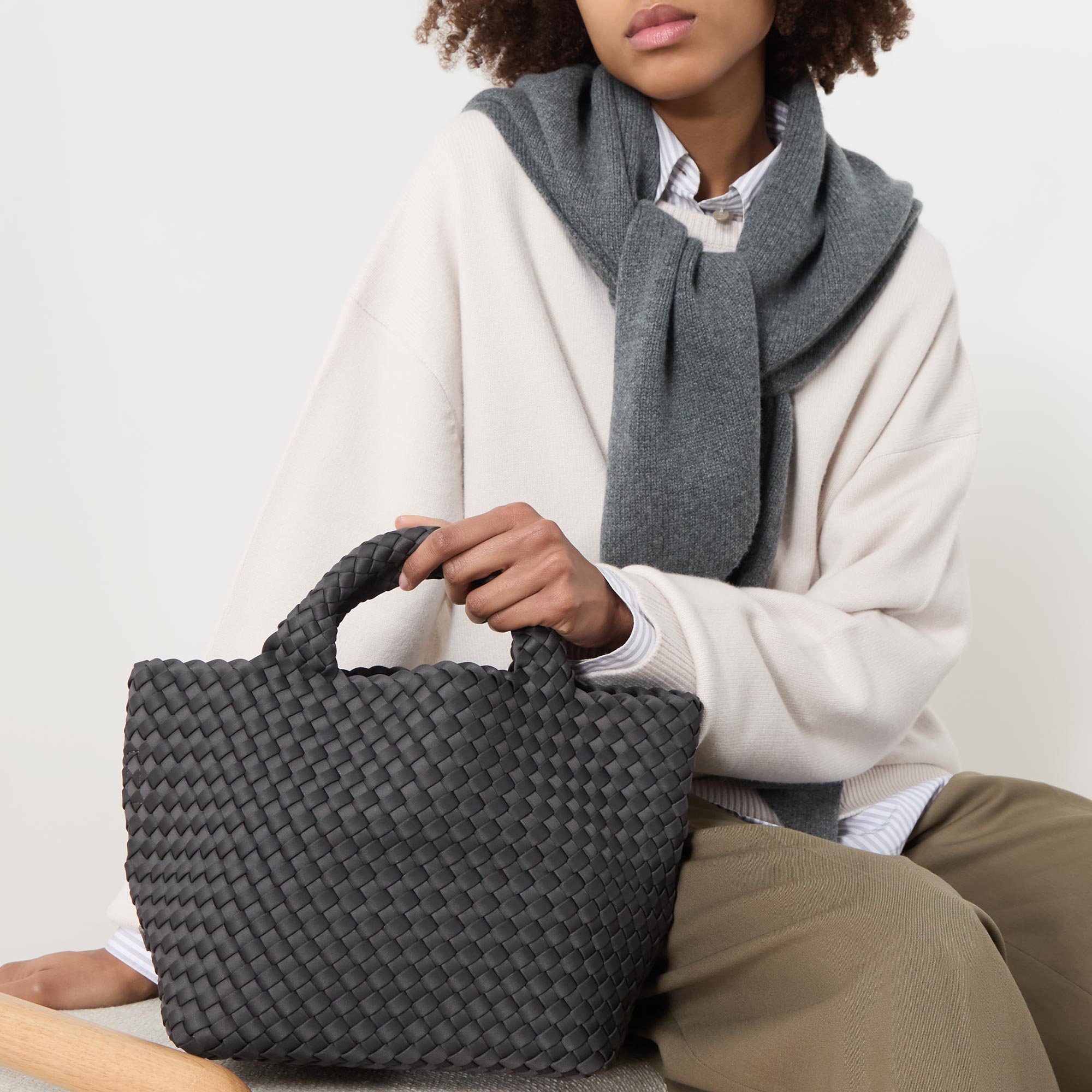 - Handwoven, two top handles, open top design, side logo badge, detachable/adjustable strap