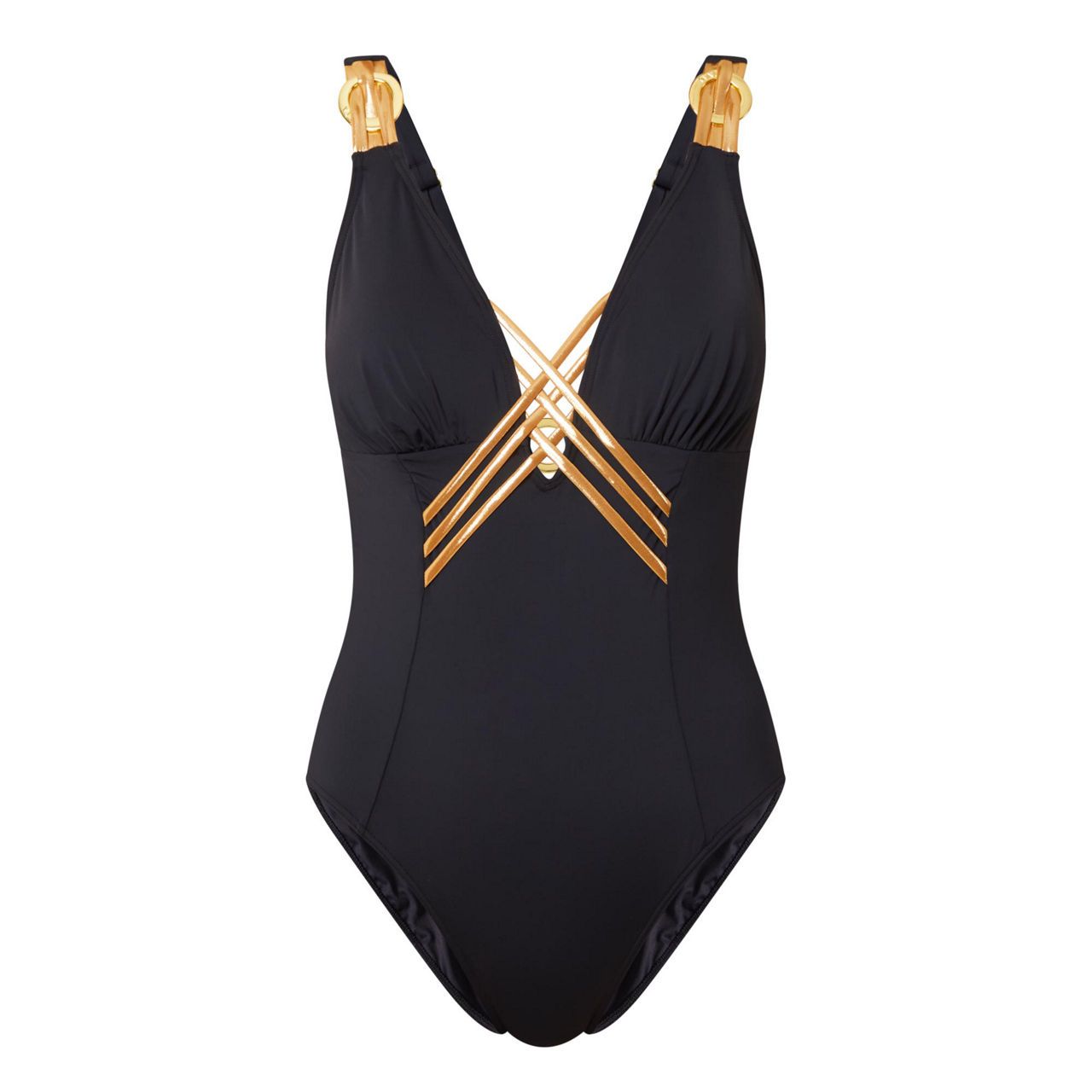 - One-piece design, adjustable straps, plunge neckline, interlaced metallic-gold luxe strapping across the bust, medium control power mesh inside shaping the body, removable padded cups, interwoven lacing, statement gold NAIA trims, second skin NAIA fabric