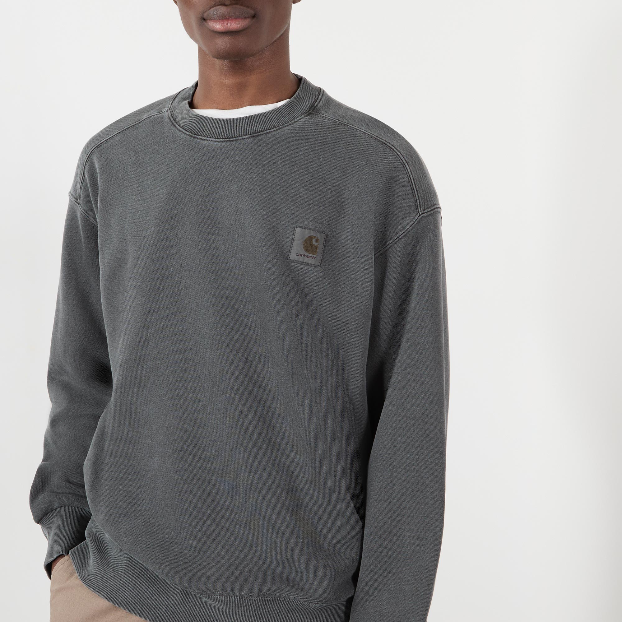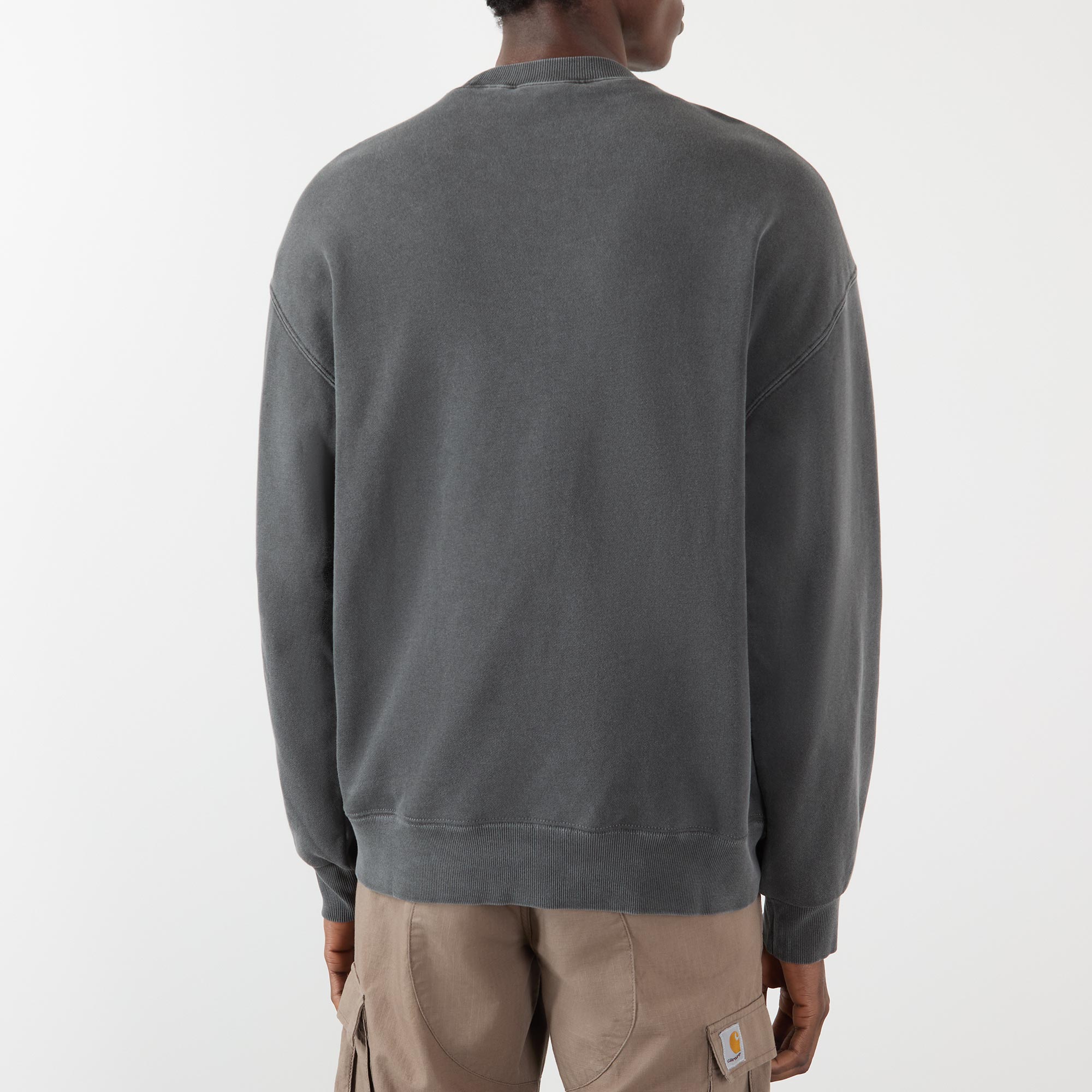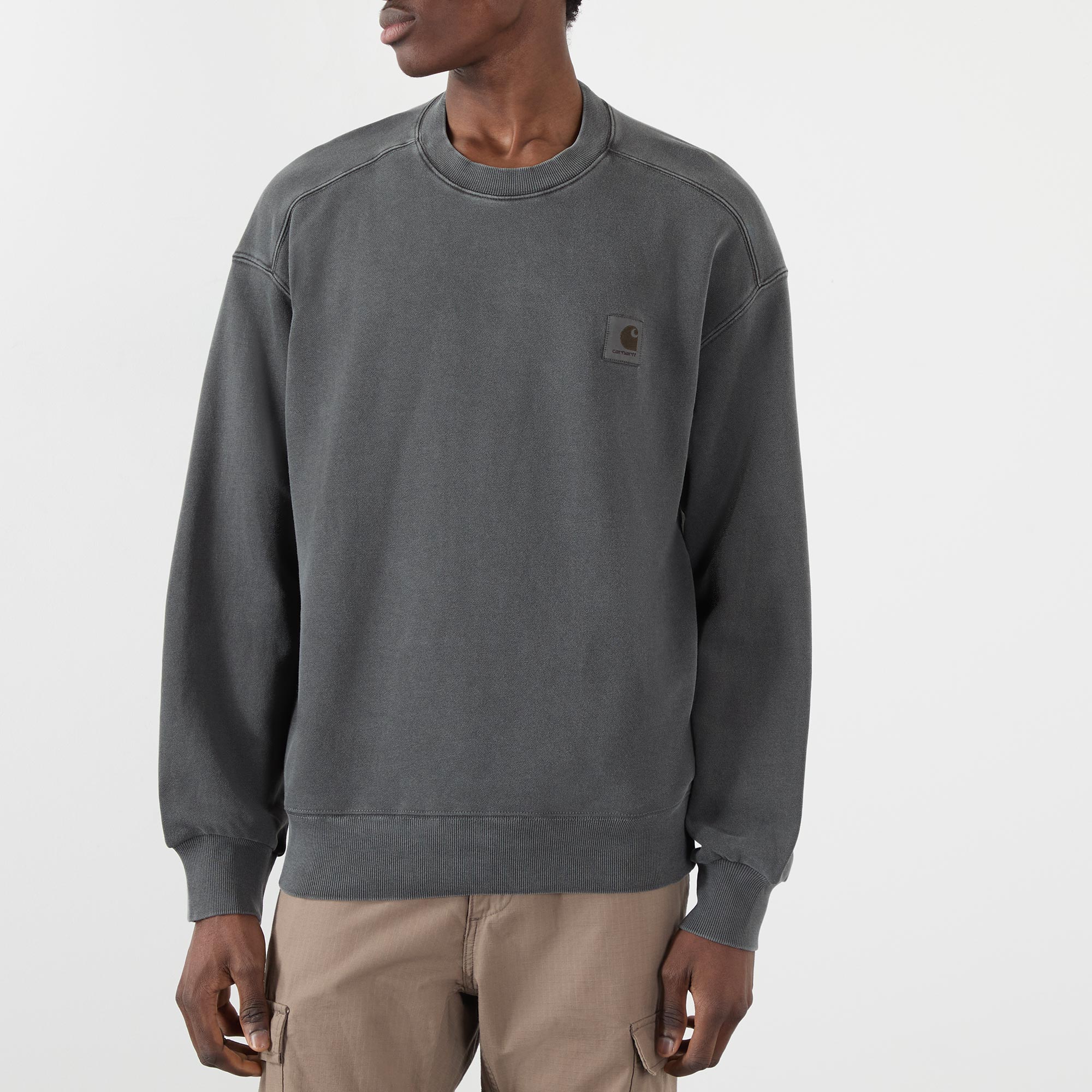- Round neckline, long sleeves, dropped shoulders, ribbed trims, logo badge at chest, garment-dyed finish