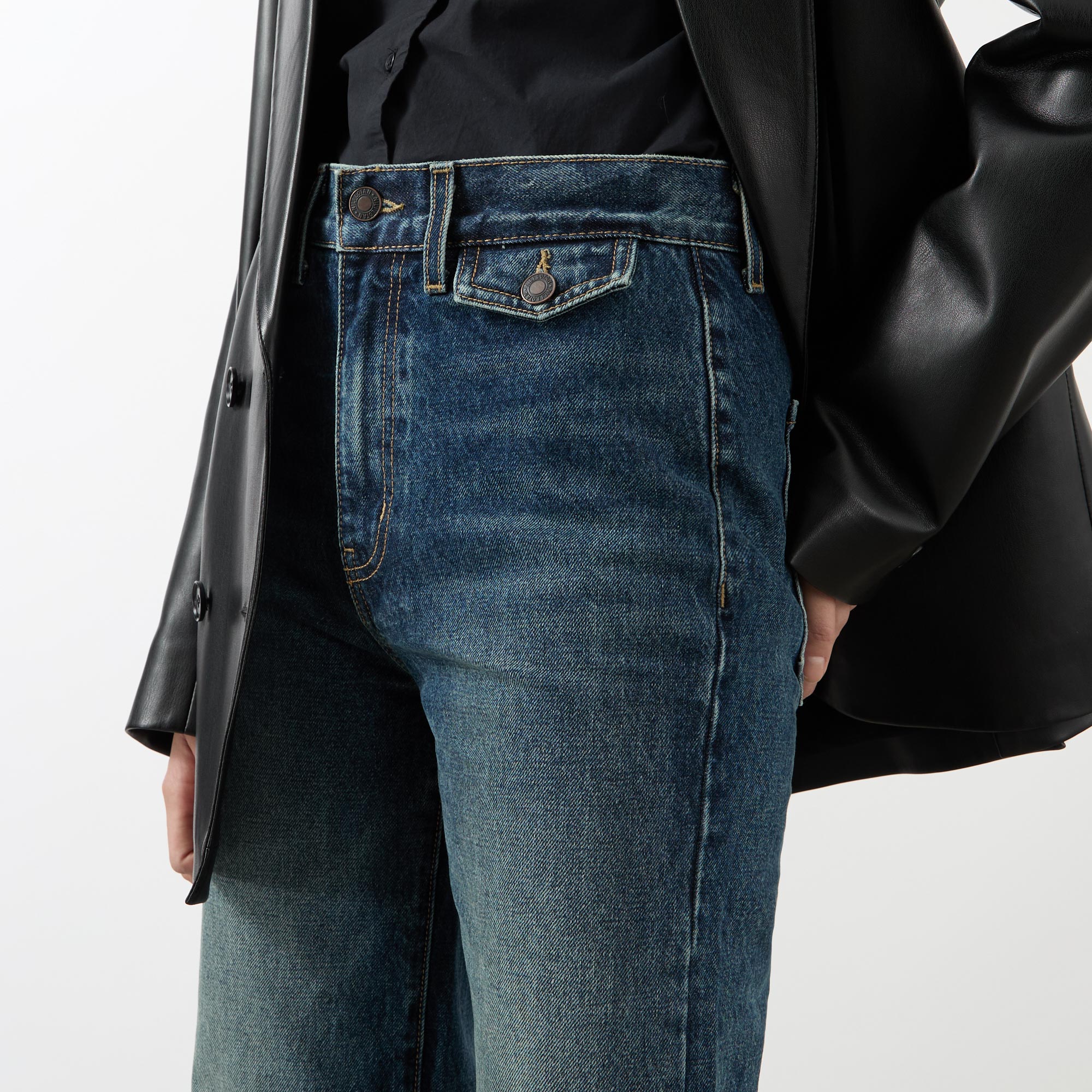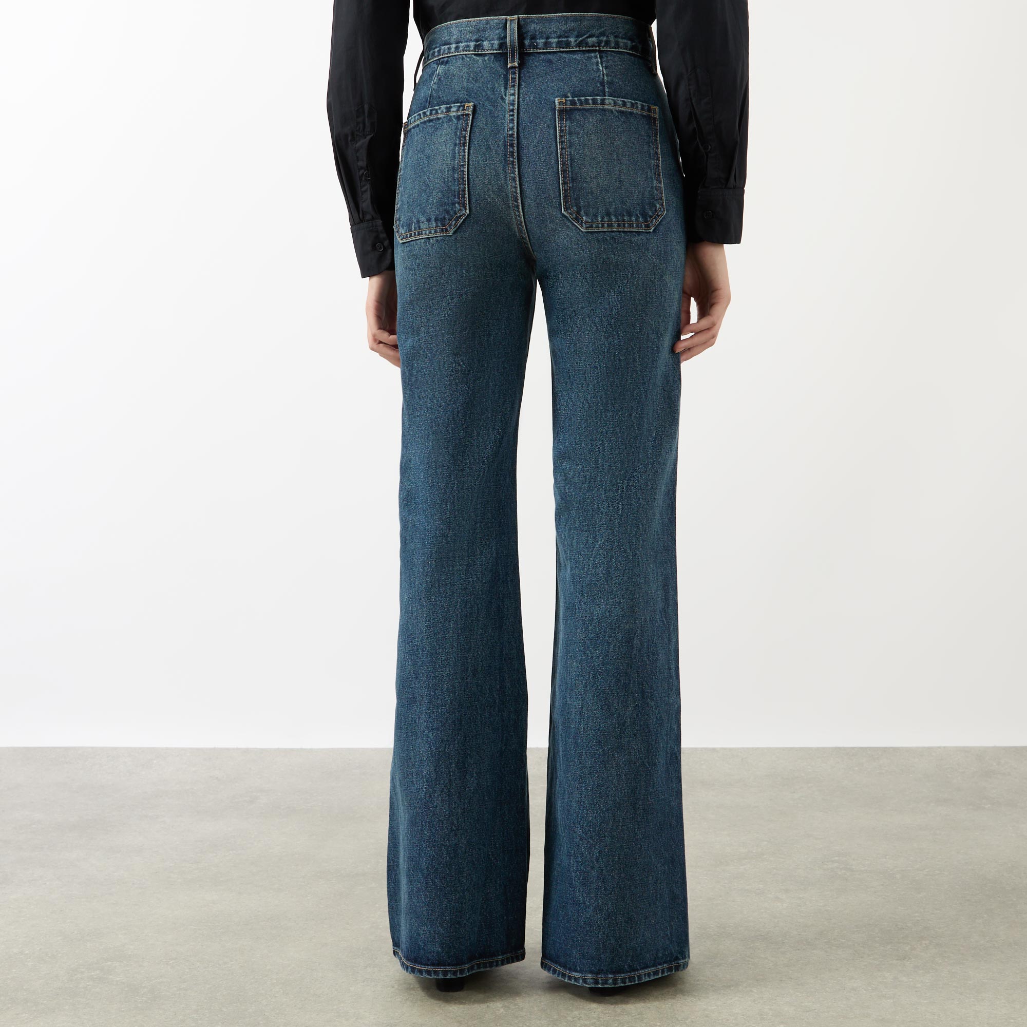 - Button and fly zip fastening, belt loops, front flap pockets, rear patch pockets, whiskering and faded details, flared cut