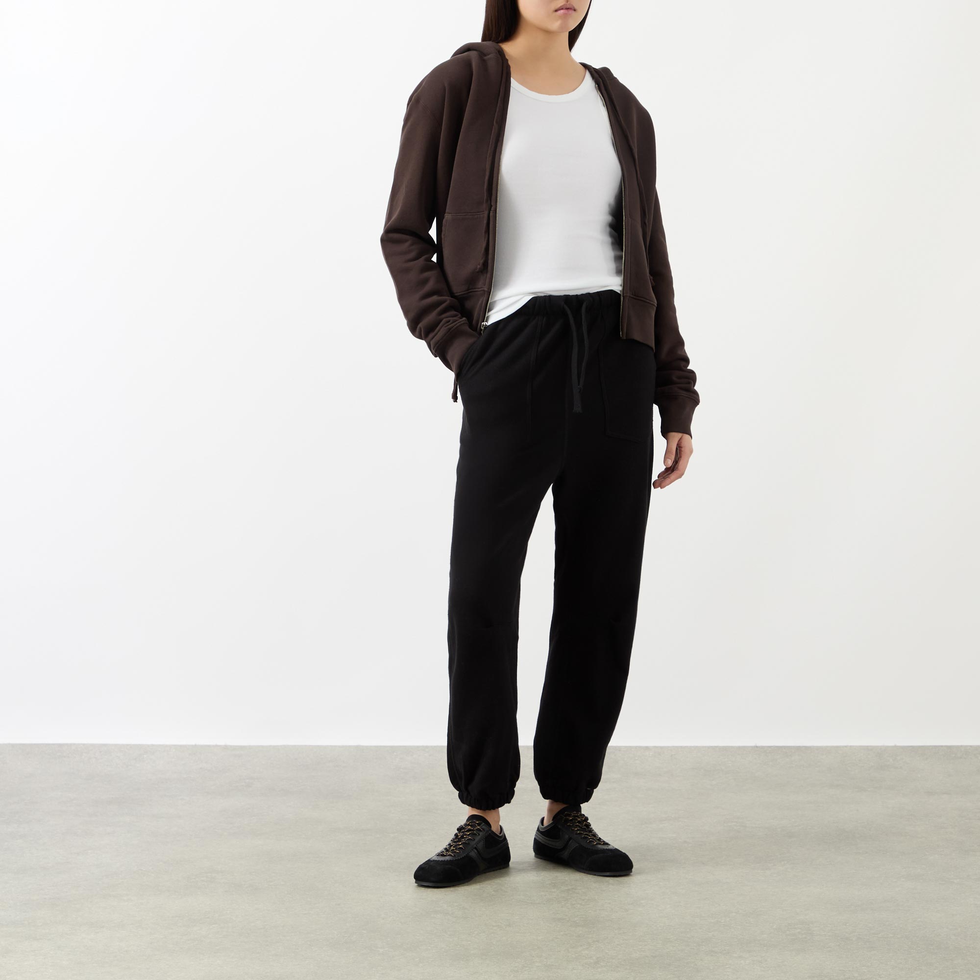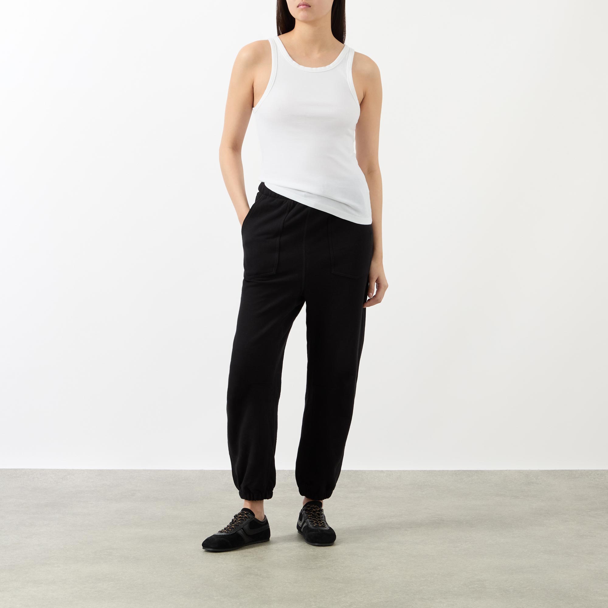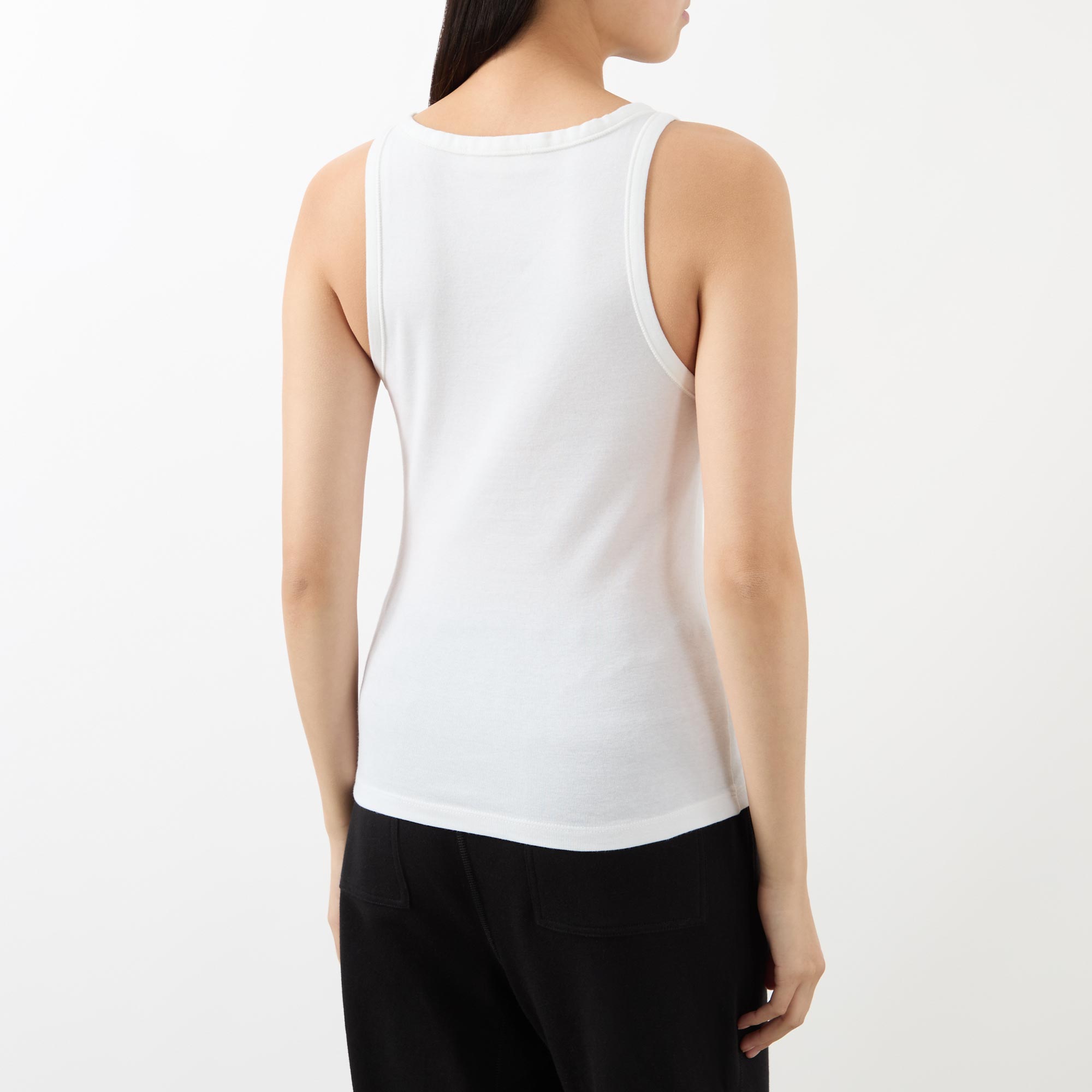 Refined minimalism underpins the SS26 collection from Nili Lotan, seen in the design of the Jennifer tank top. Cut from a ribbed fabric to a slim fit, it features a racer-style neckline and straight hemline.