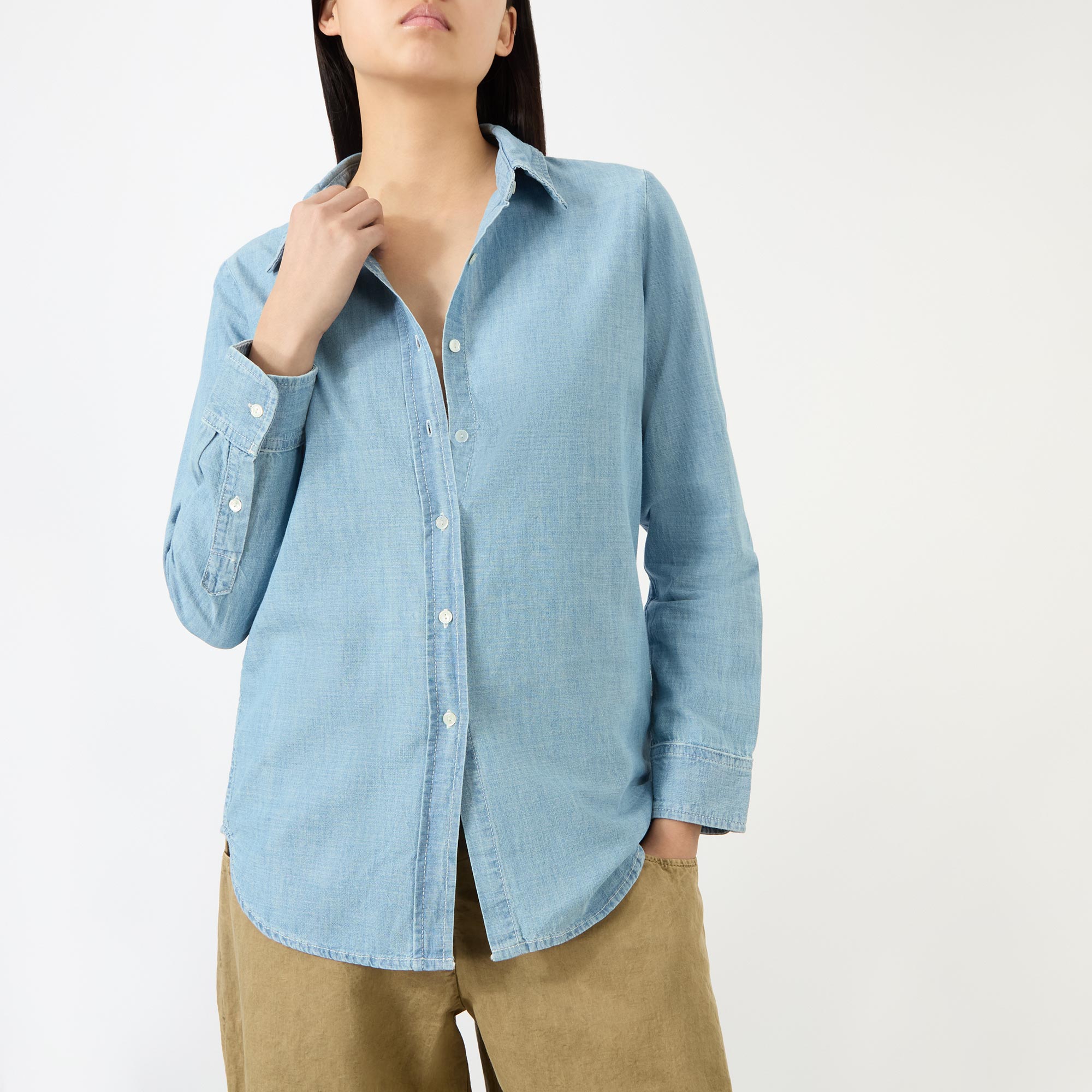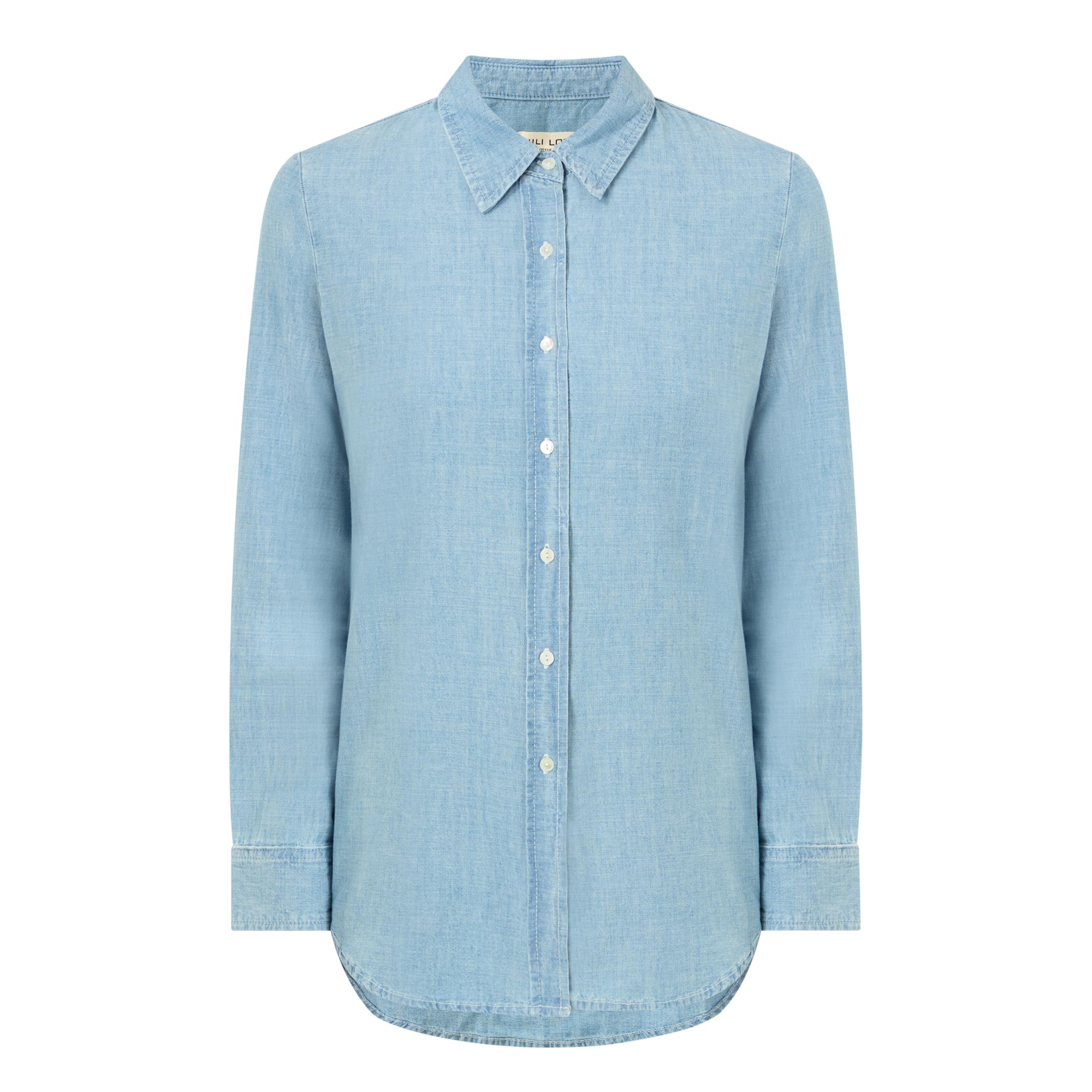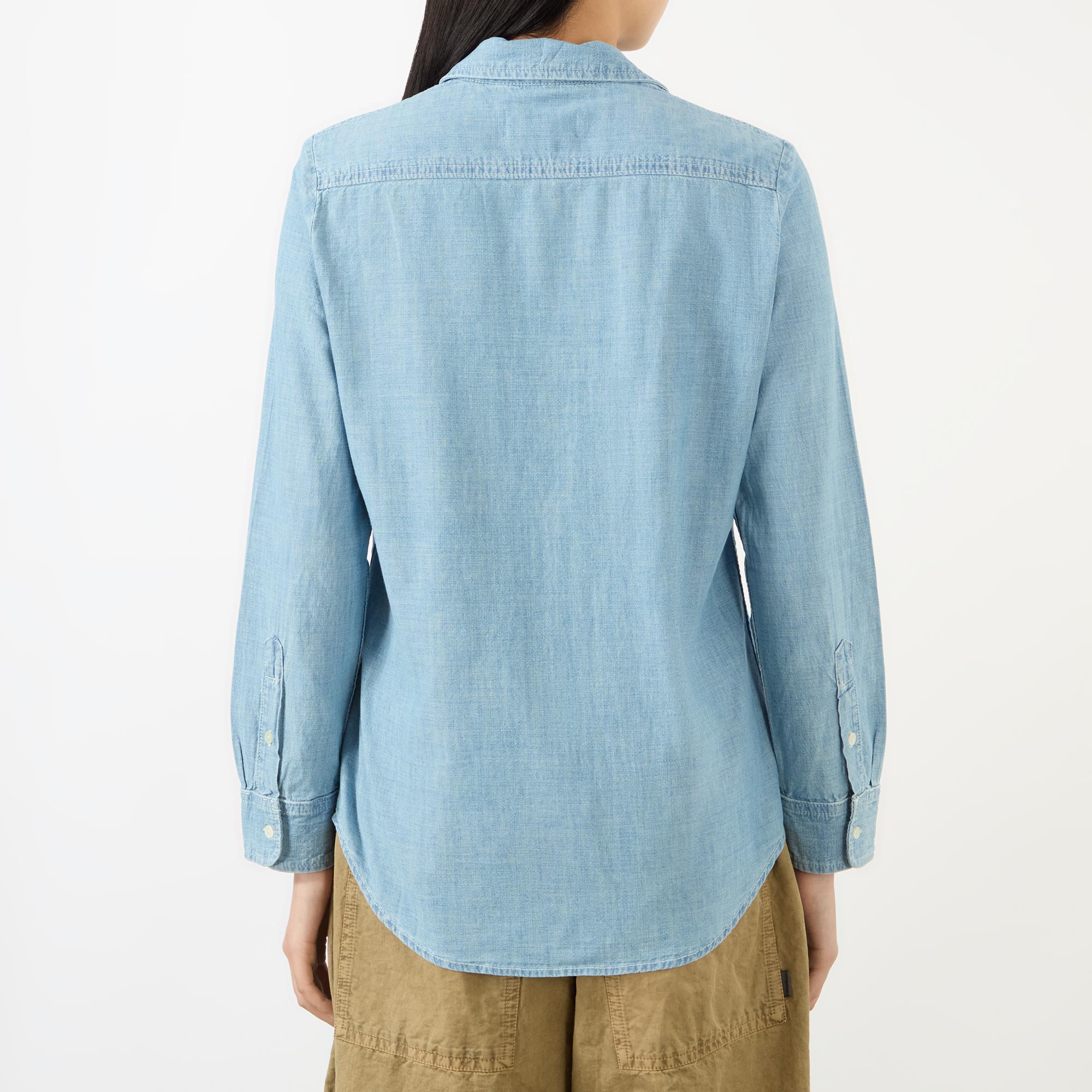 - Point collar, long sleeves, buttoned cuffs, front button placket, exaggerated shirt-tail hem, tobacco stitching, light wash finish