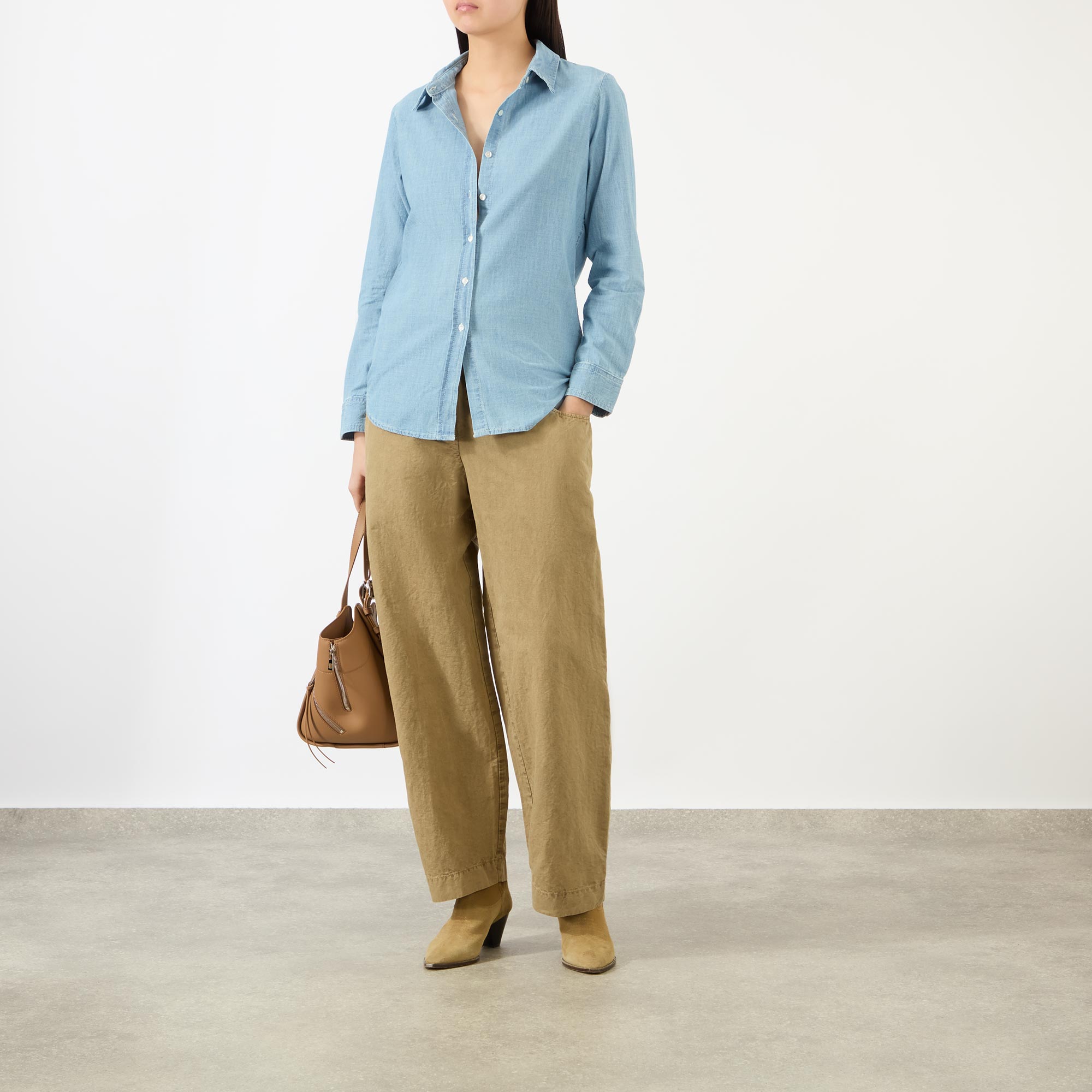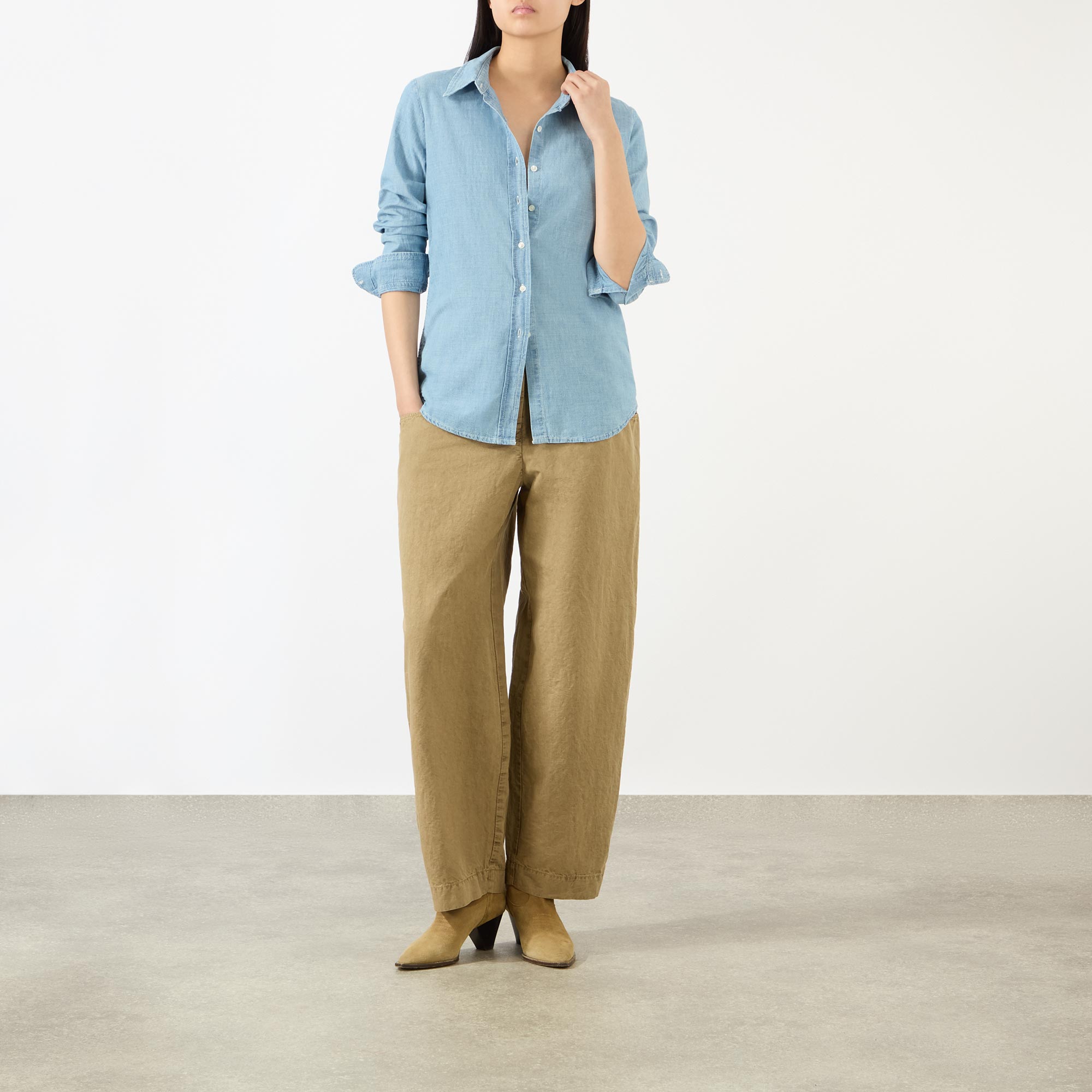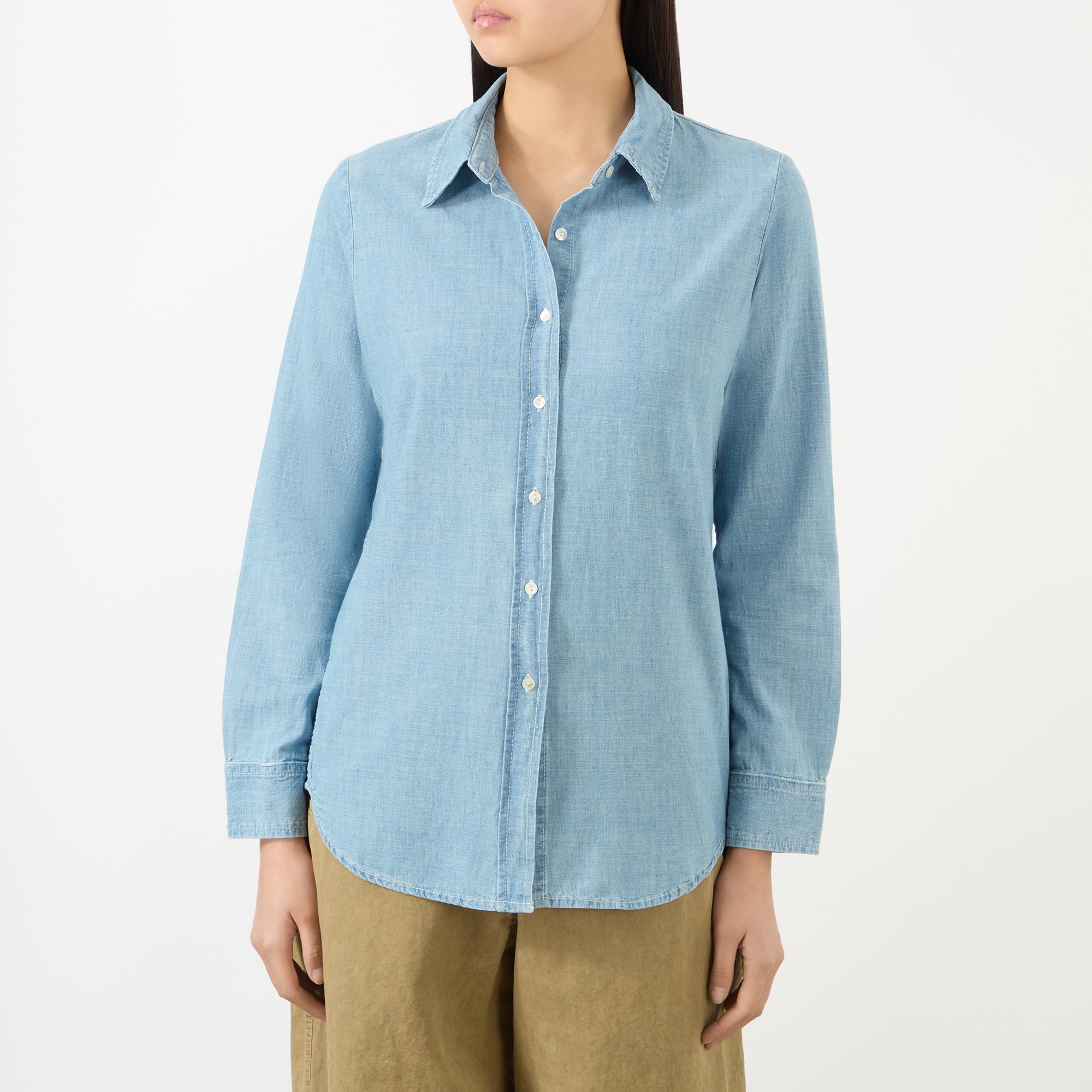 - Point collar, long sleeves, buttoned cuffs, front button placket, exaggerated shirt-tail hem, tobacco stitching, light wash finish