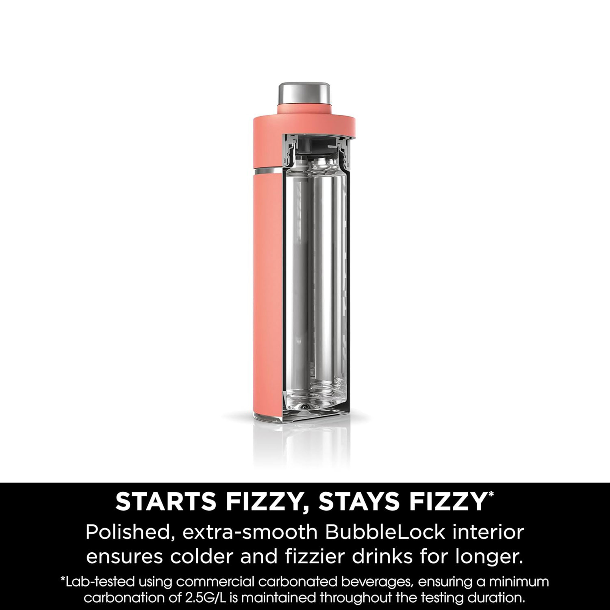 Carbonated drinks can quickly lose their fizz. Thanks to BubbleLock technology, a smooth, polished interior offers fewer nucleation points which can cause bubbles to escape, turning your drink flat. This means you can enjoy drinks that sparkle for longer with each sip.