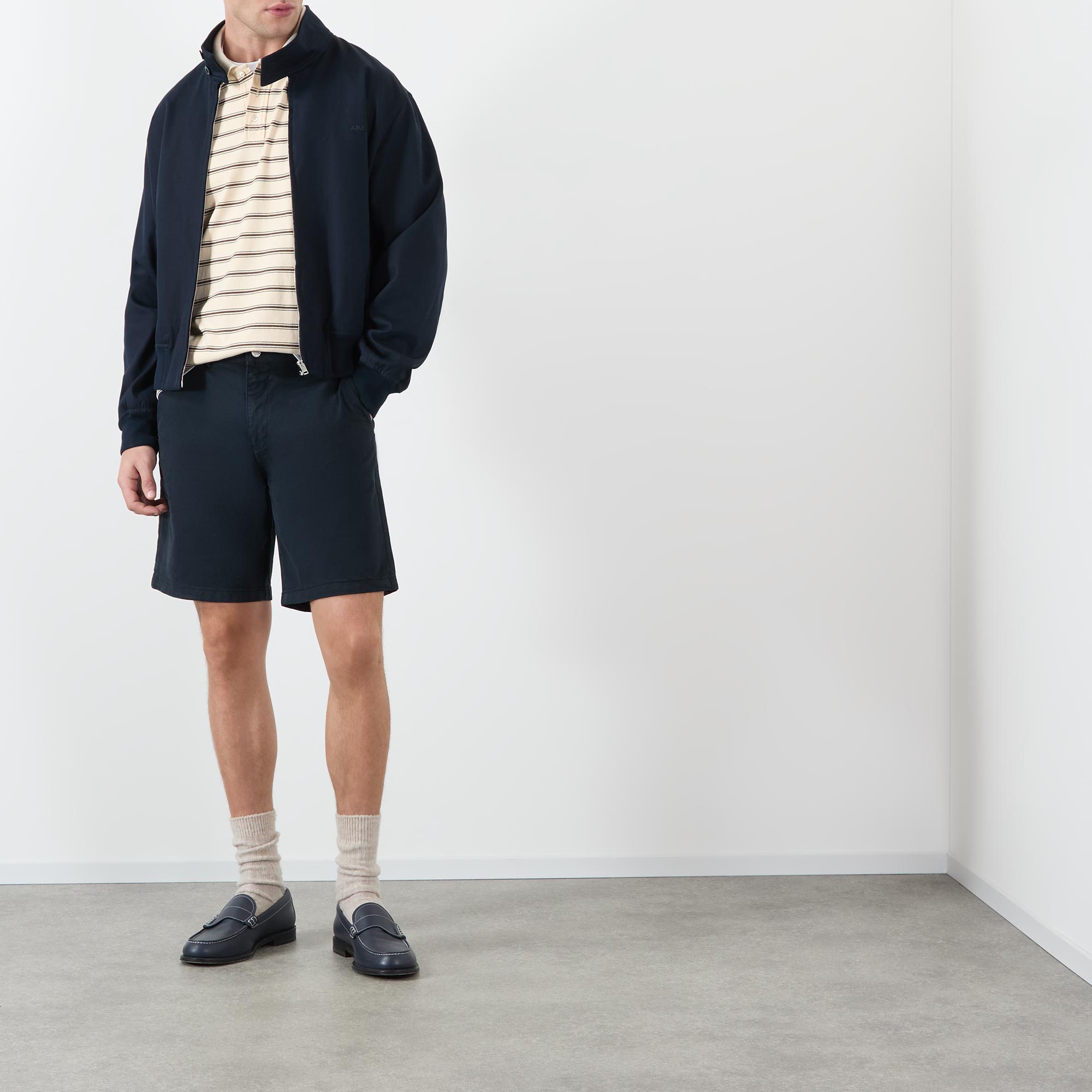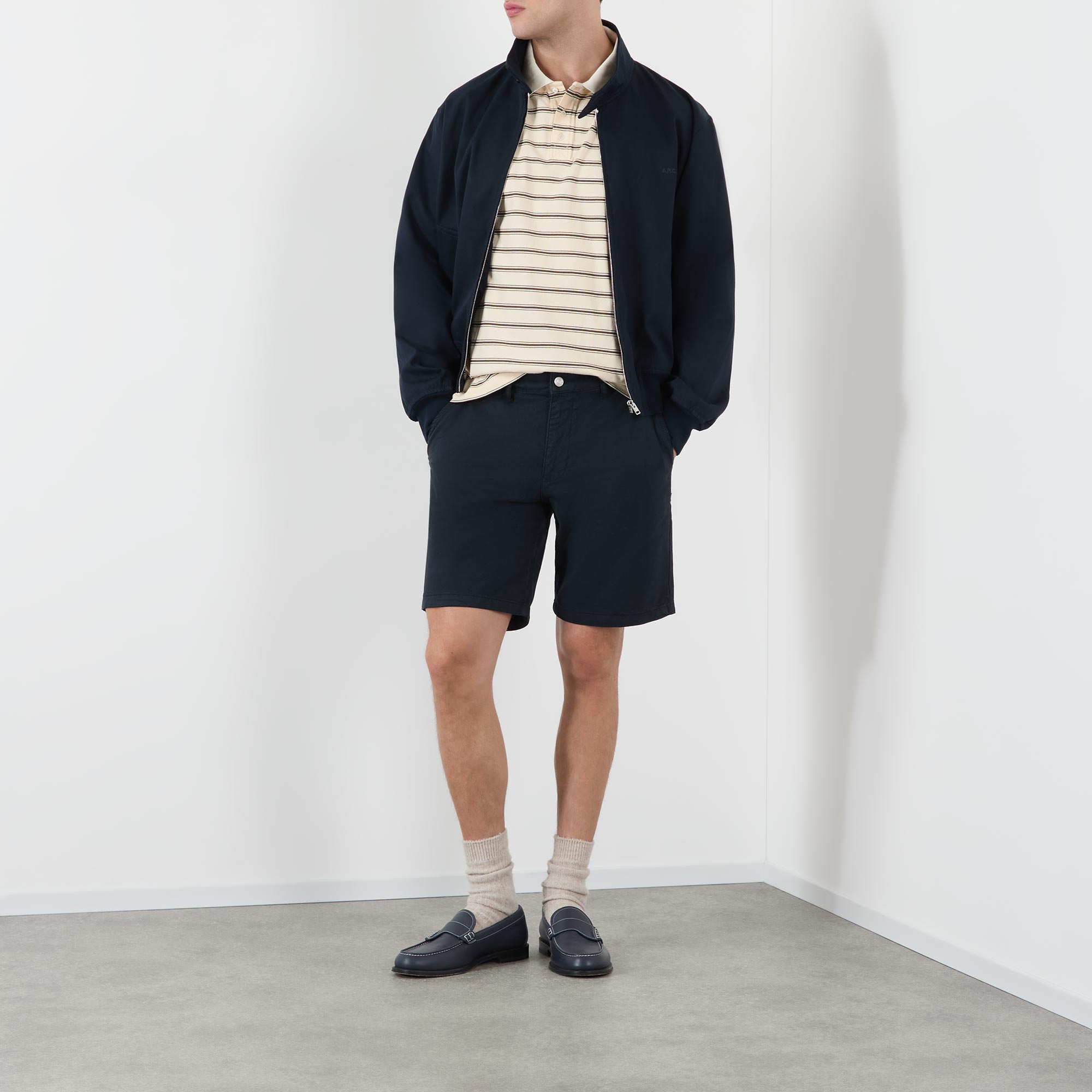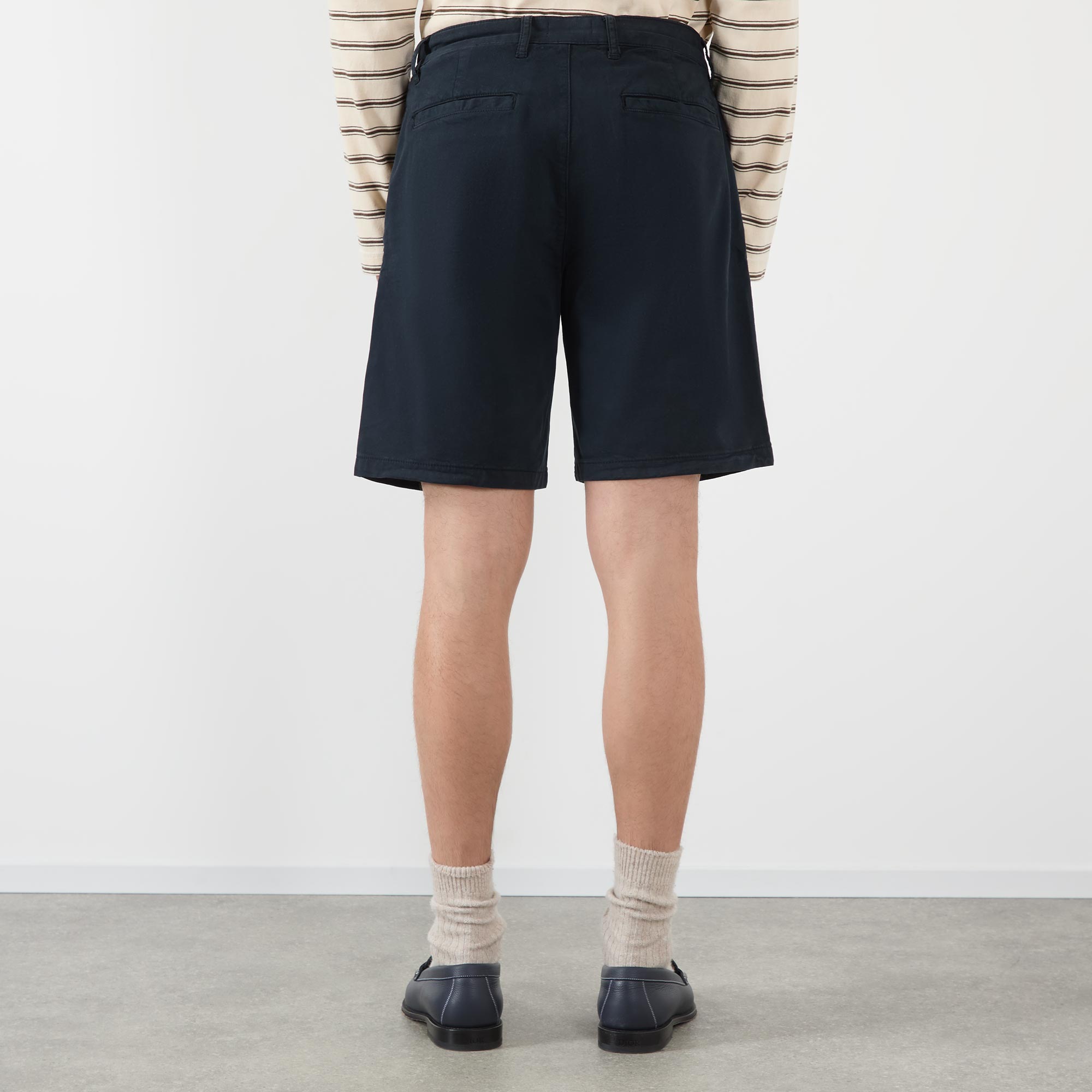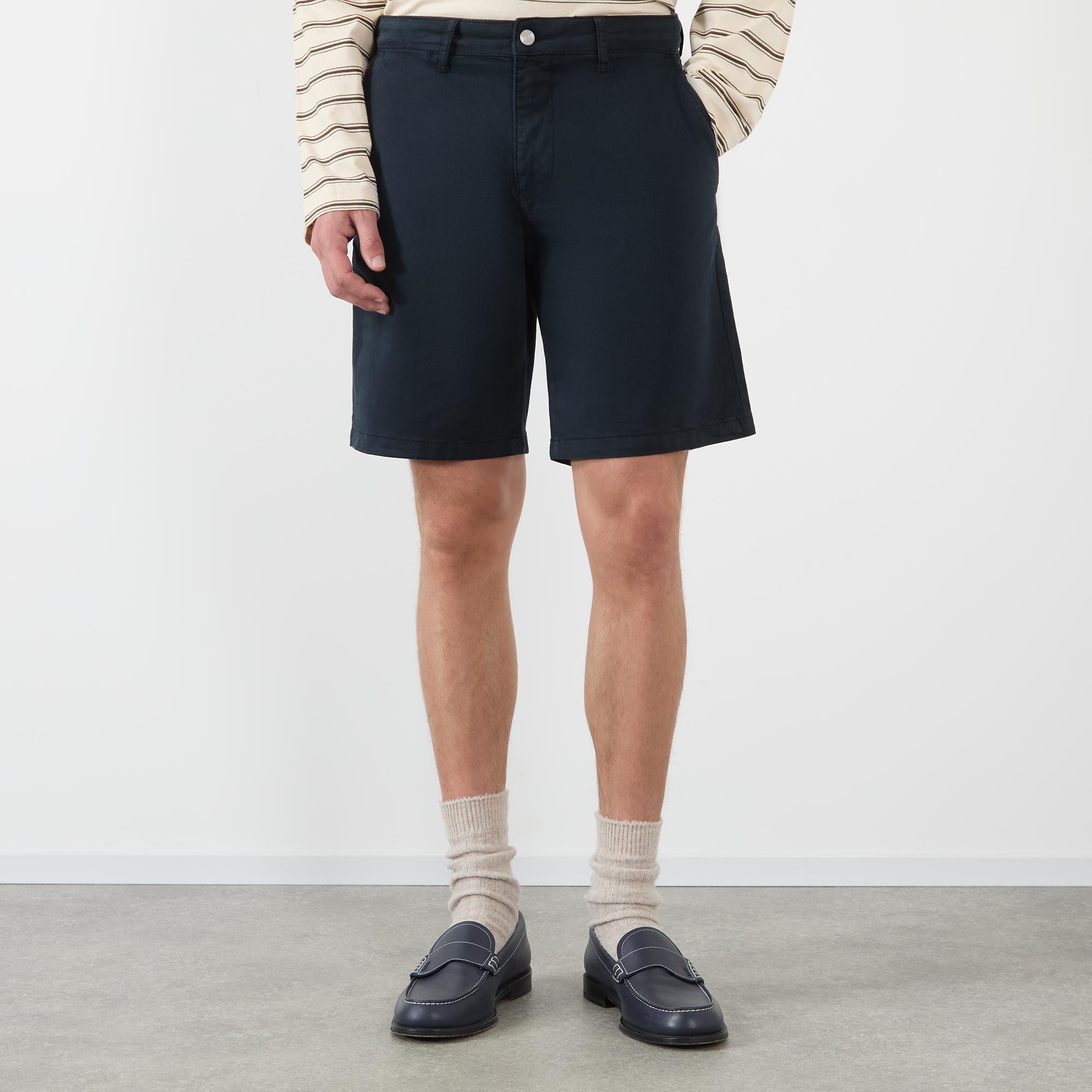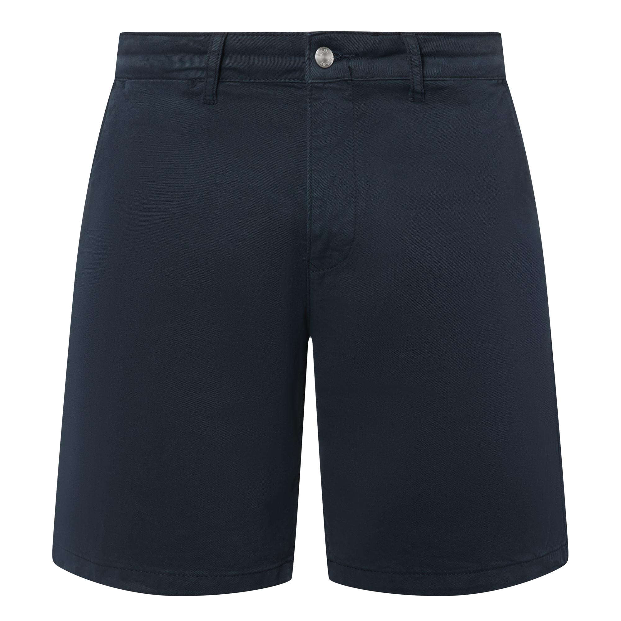• Mid-rise, straight-leg, above-the-knee length, belt lops, concealed fly and button fastening, two side entry pockets, two rear welt pockets, clean hems, logo detail, tonal stitching, garment-dyed finish