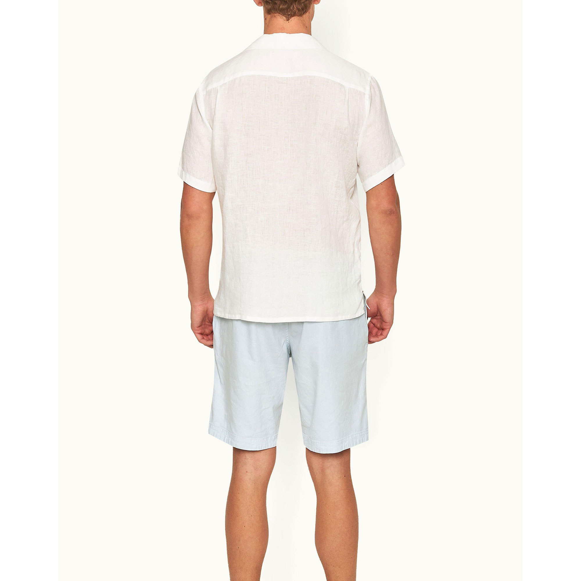 - Short sleeves, button fastenings, linen, woven, capri collar, concealed placket, zigzag stitching, branded imitation mother of pearl buttons, tonal multi-stitch details, pleated back yoke, side seam hem split, brand stripe embroidery
