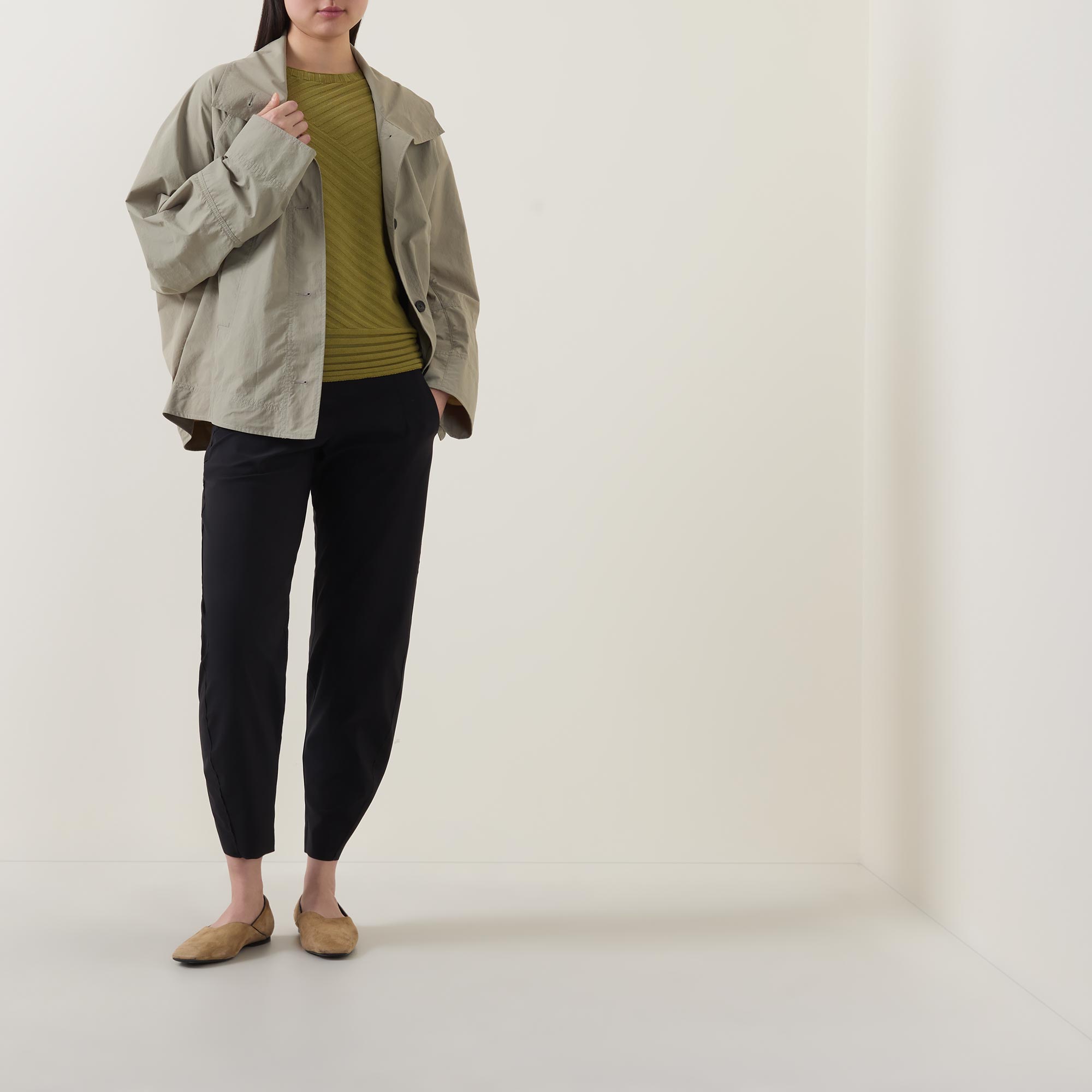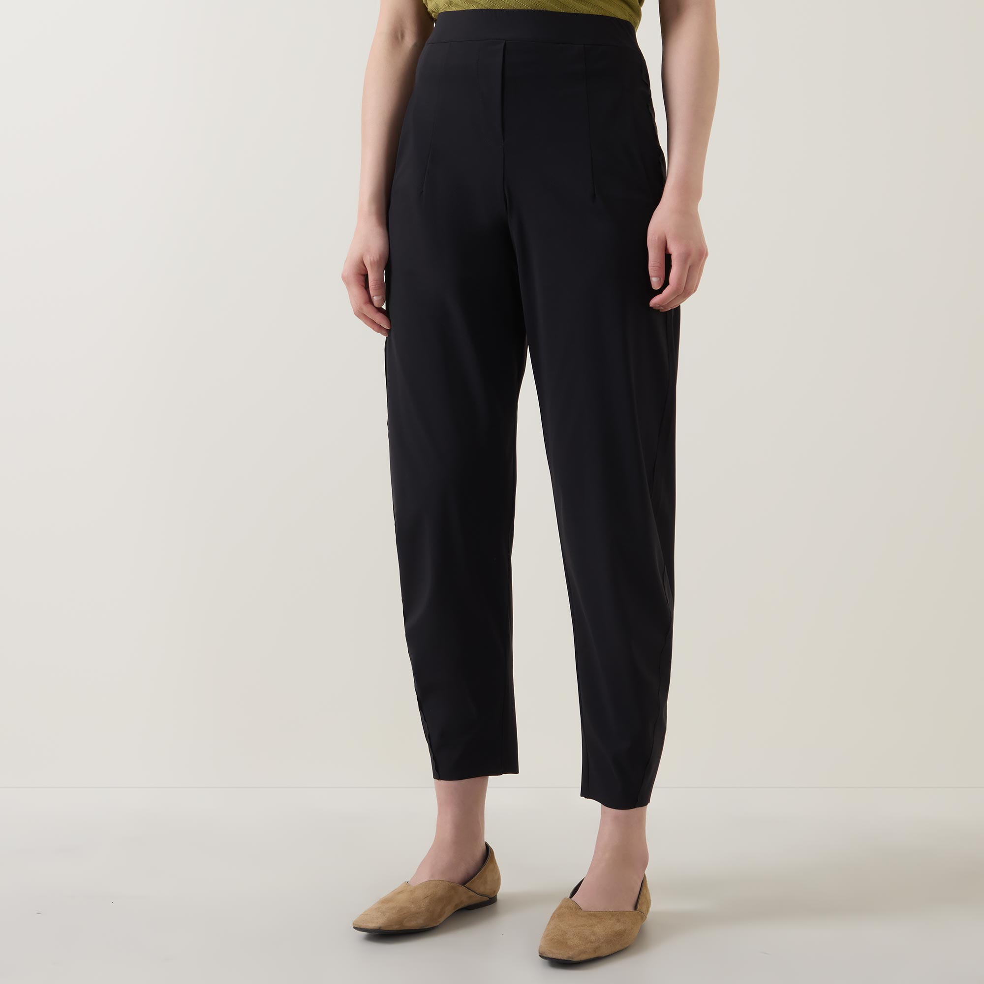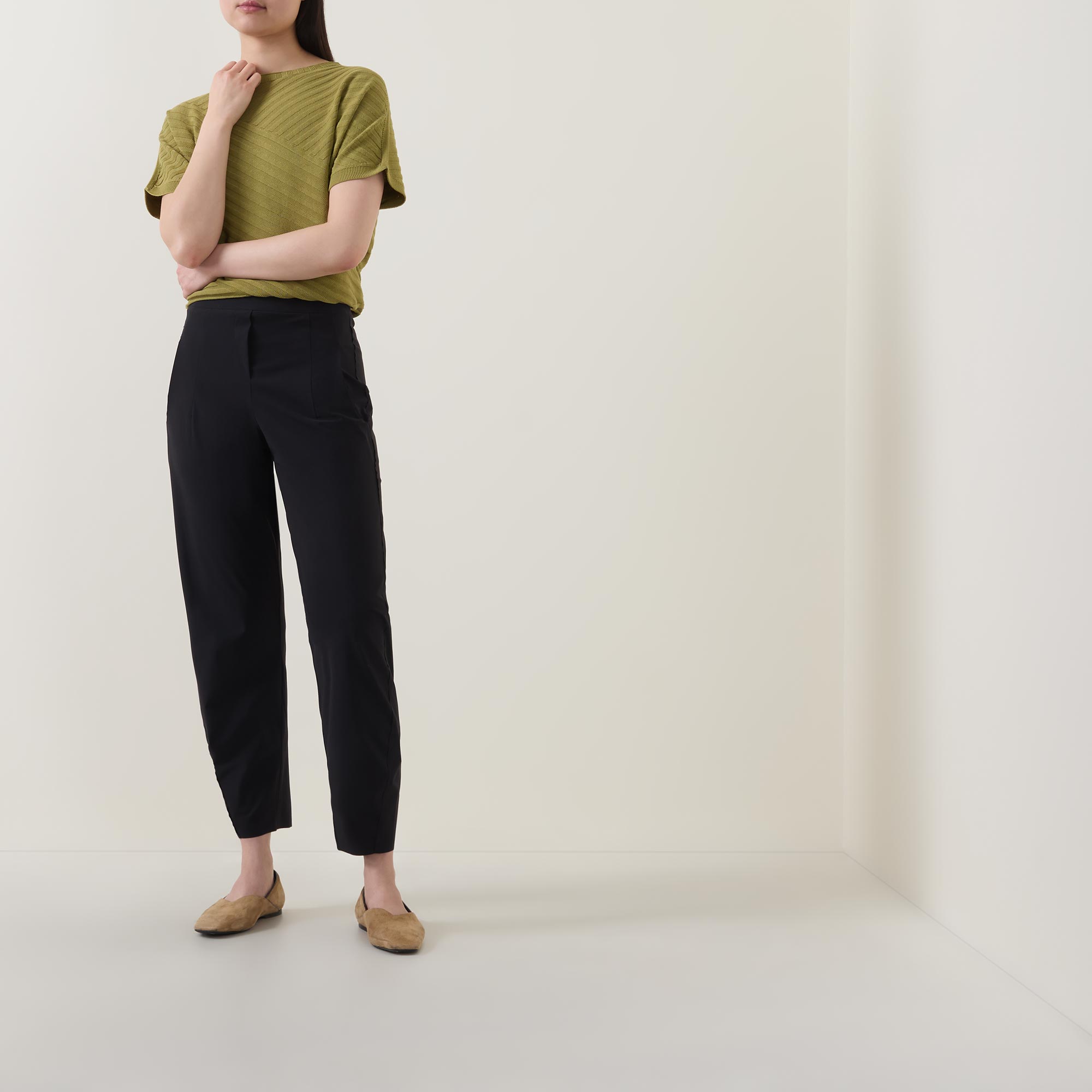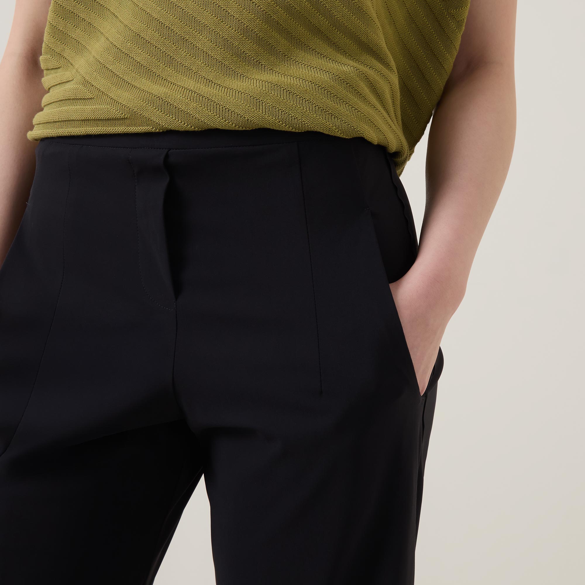 - Mid rise, slim tapered leg, cropped length, covered waistband, mock fly, two front pockets, clean hems, exposed seam detailing, tonal stitching, smooth finish