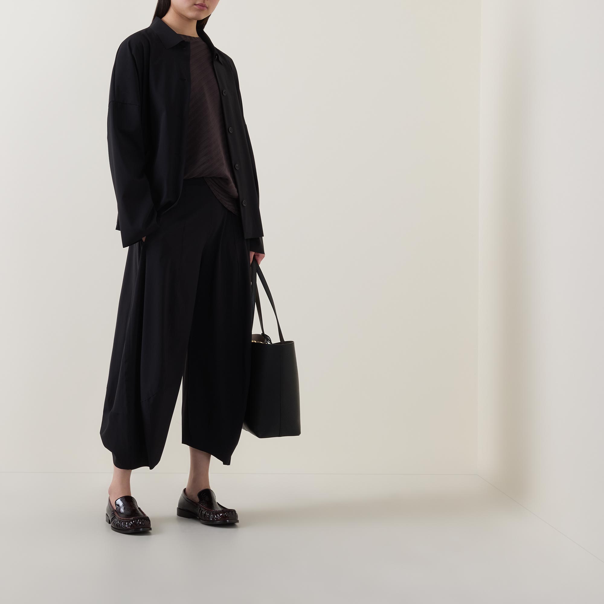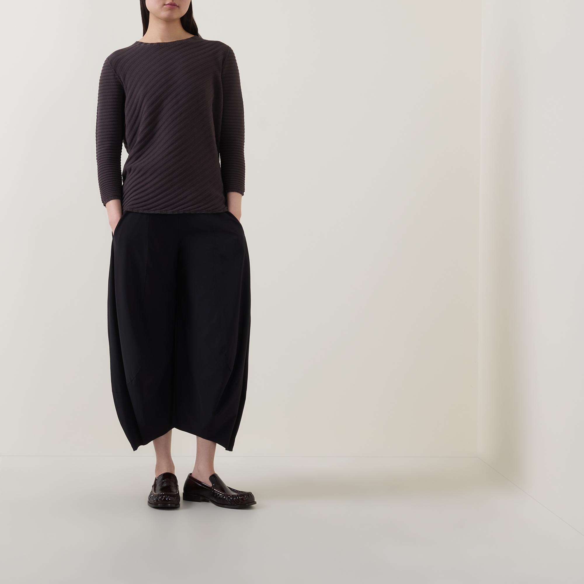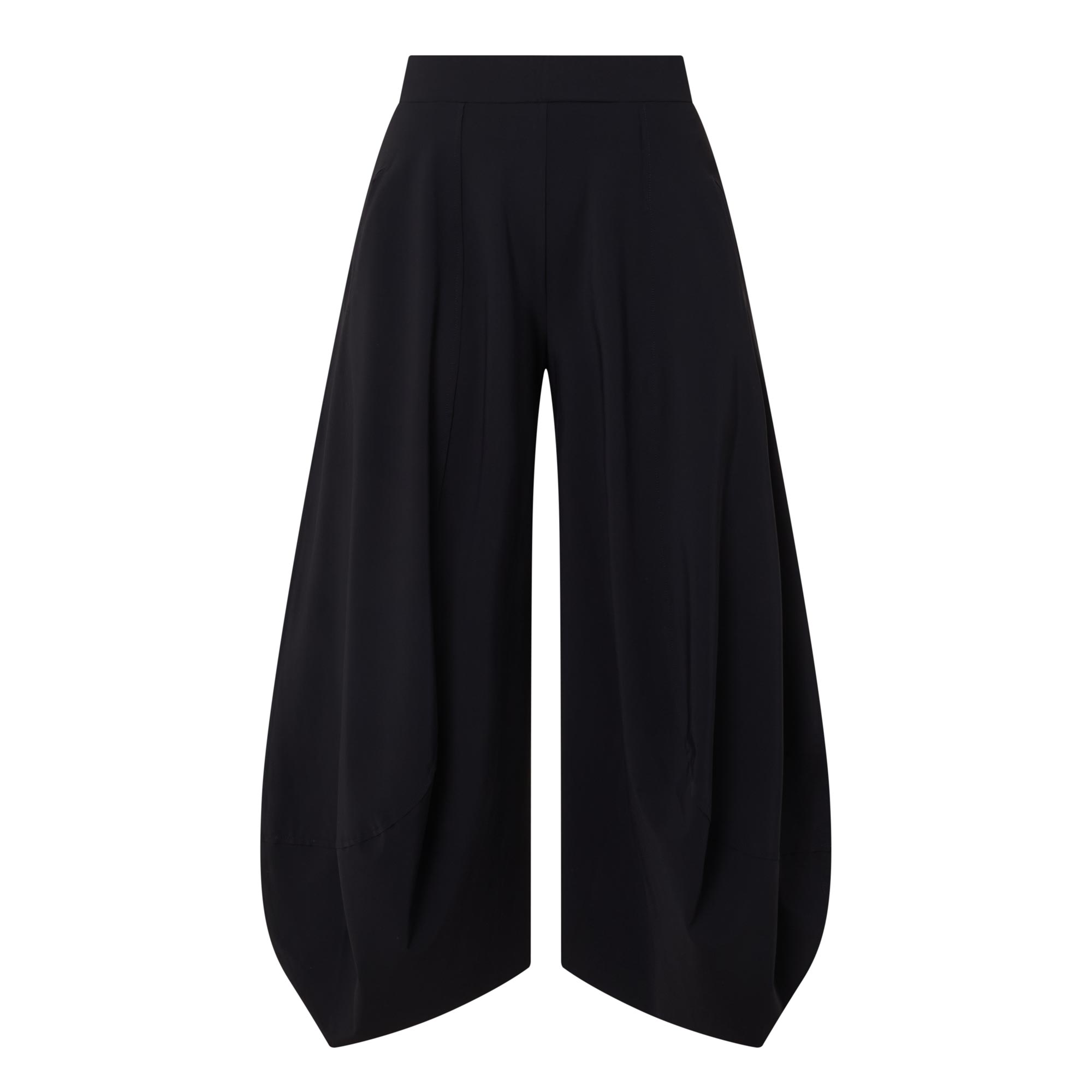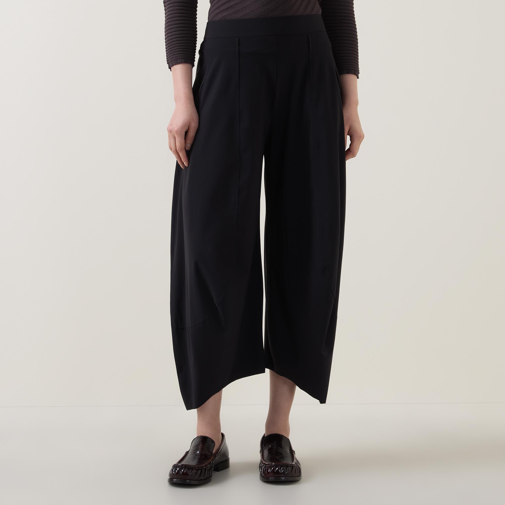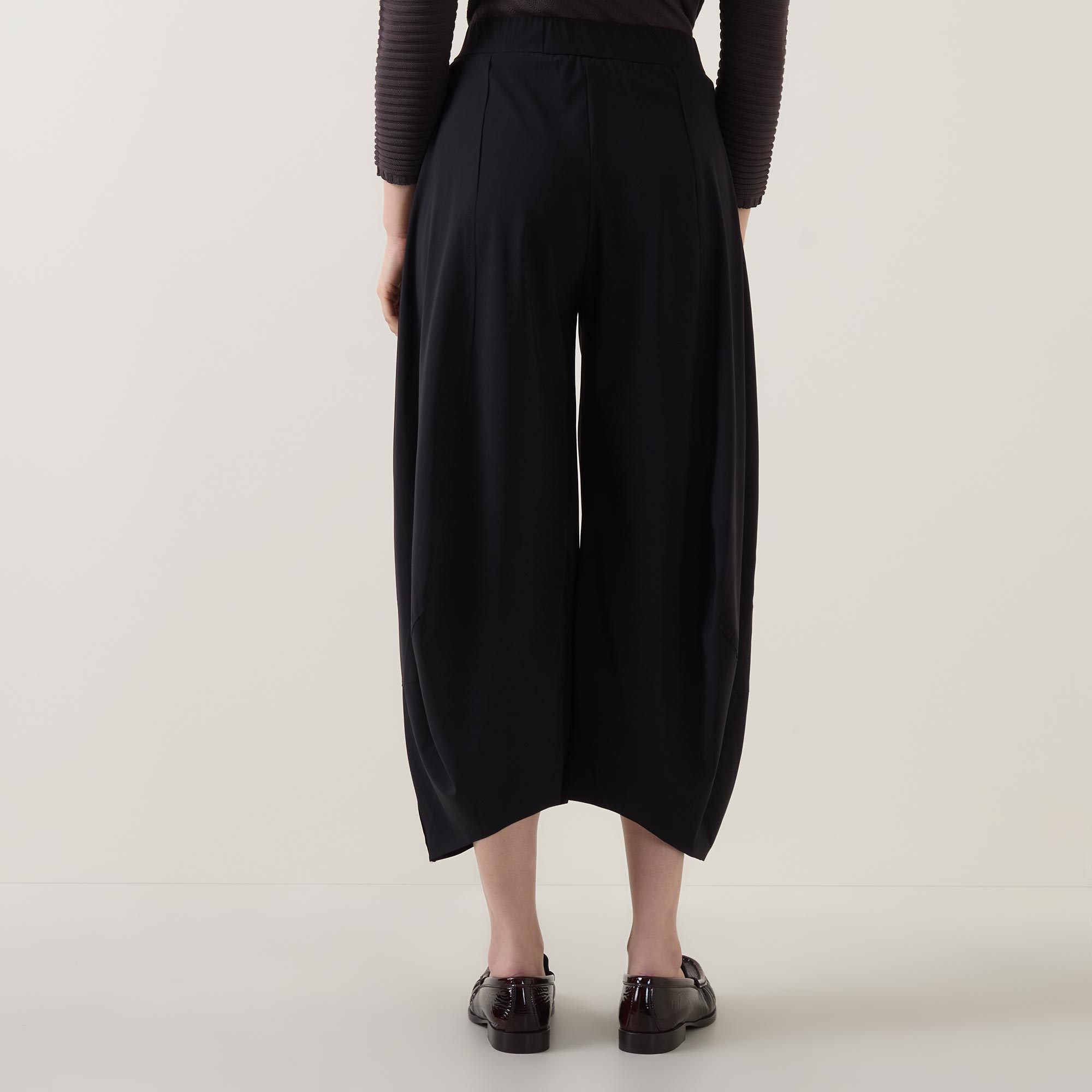 - Mid rise, wide tapered leg, cropped length, covered elasticated waistband, two side entry pockets, clean asymmetric hems, exposed seam detailing, tonal stitching, smooth finish