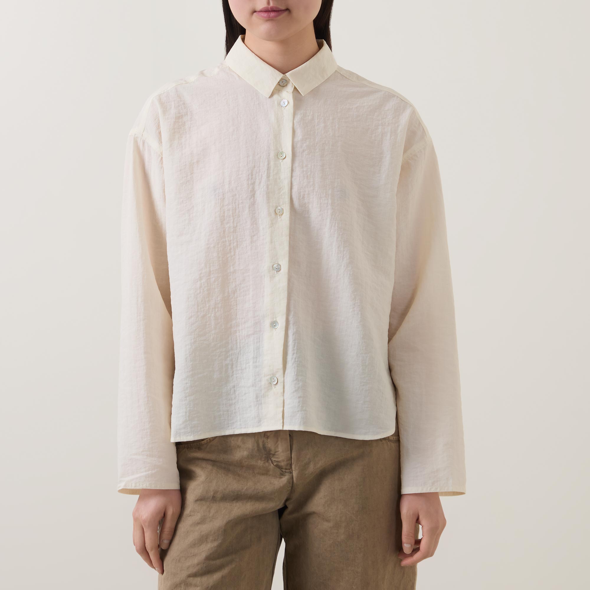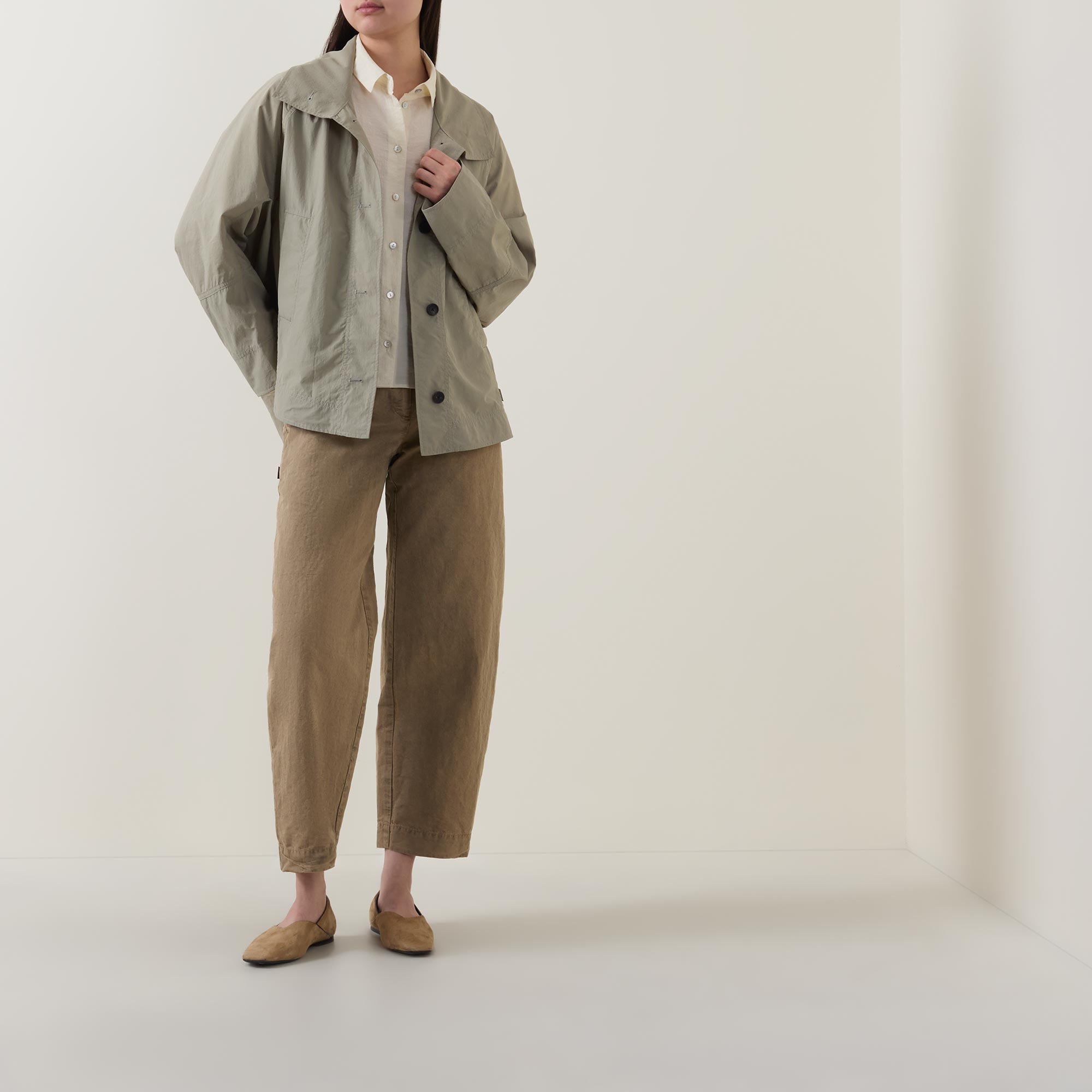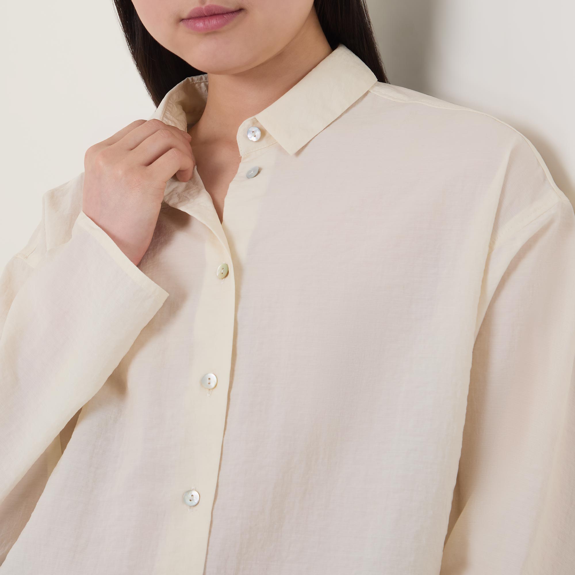 • Small collar, dropped shoulders, long wide sleeves, front button fastening, curved hem, rear pleating, tonal stitching, textured finish