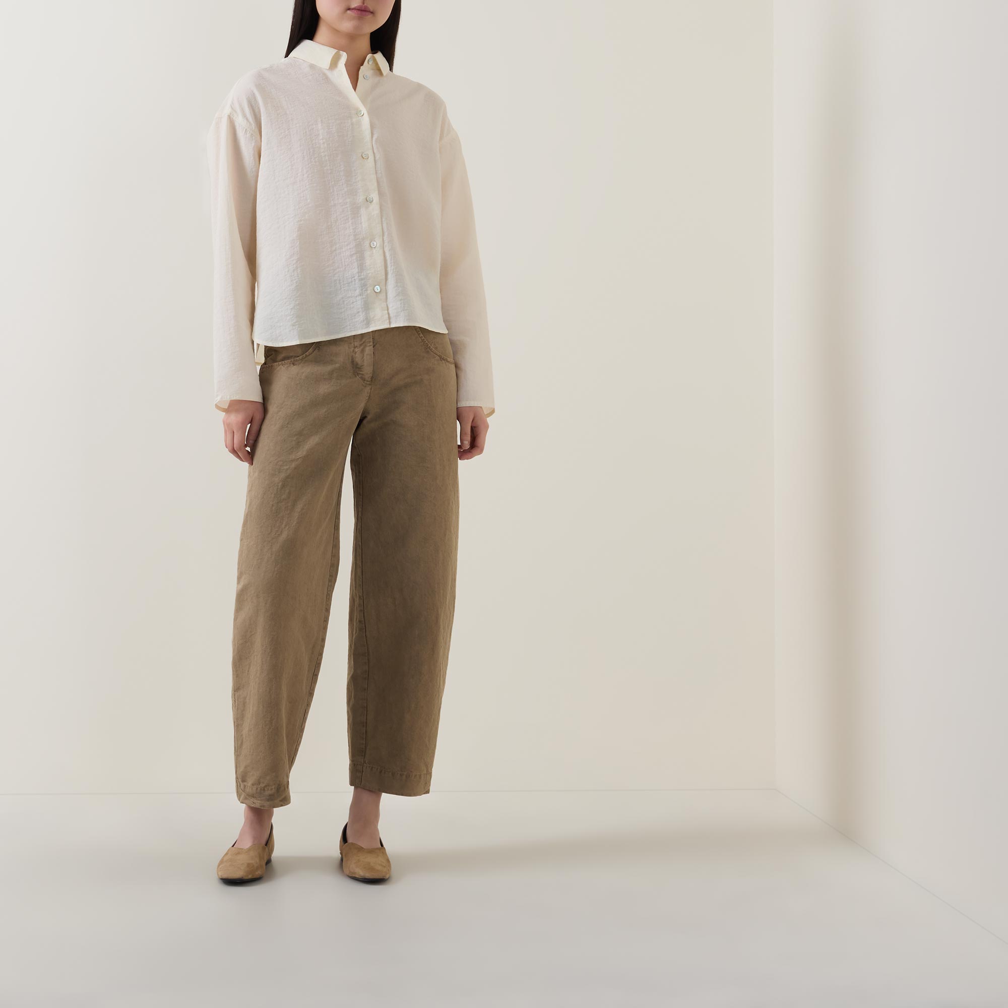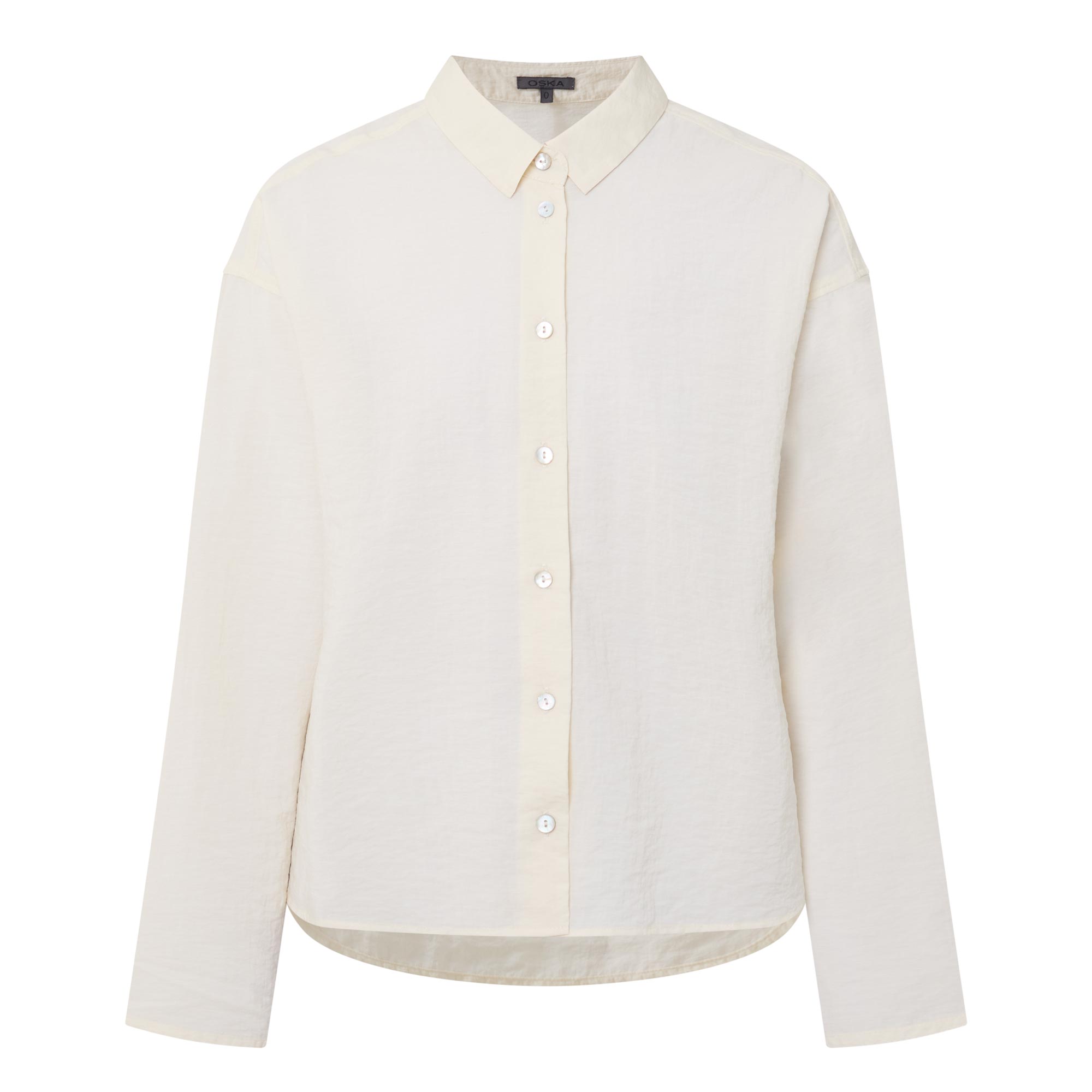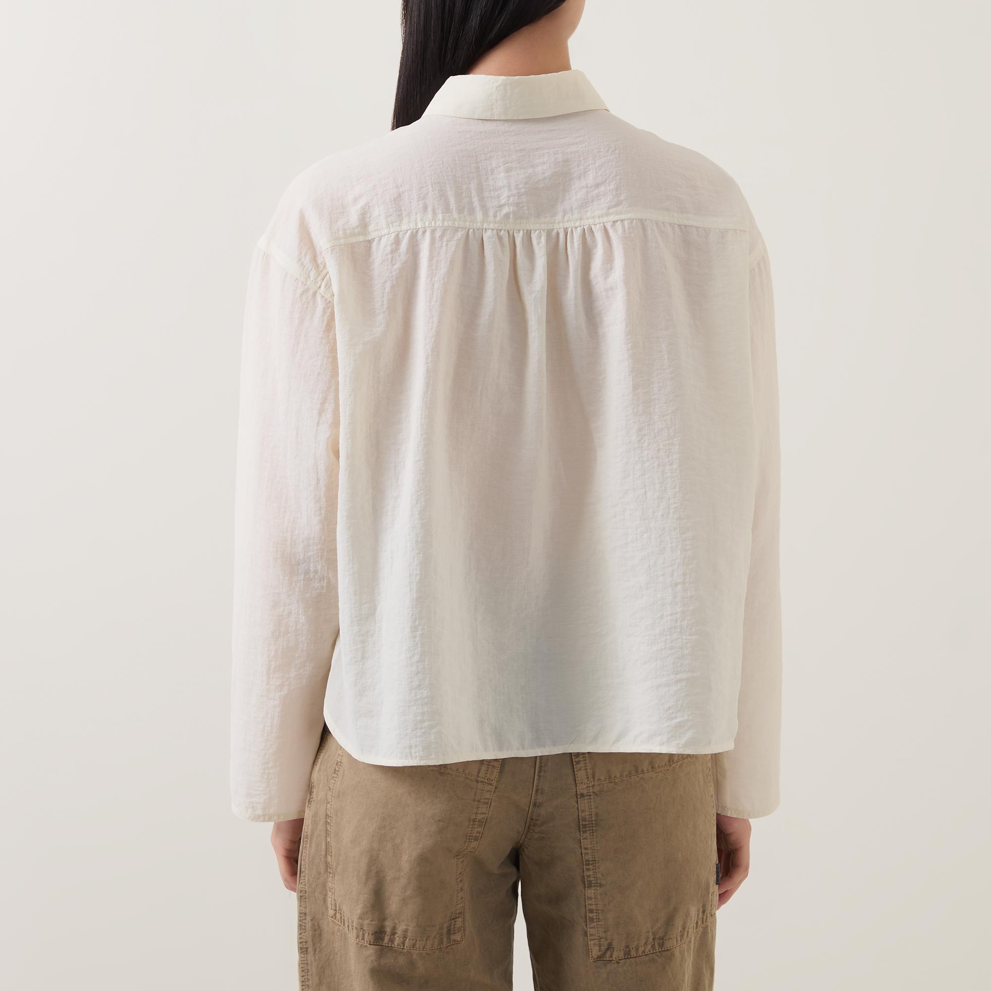 • Small collar, dropped shoulders, long wide sleeves, front button fastening, curved hem, rear pleating, tonal stitching, textured finish