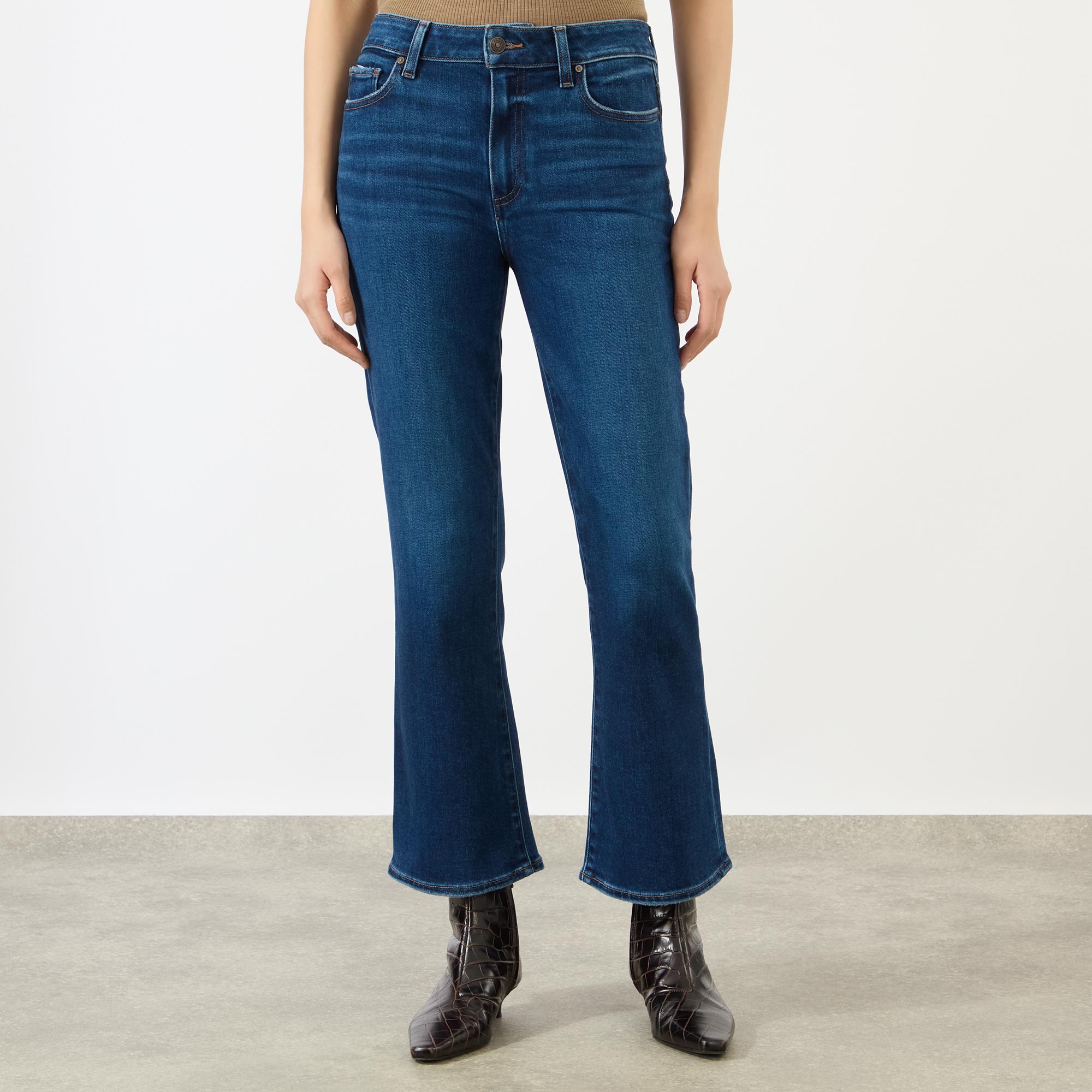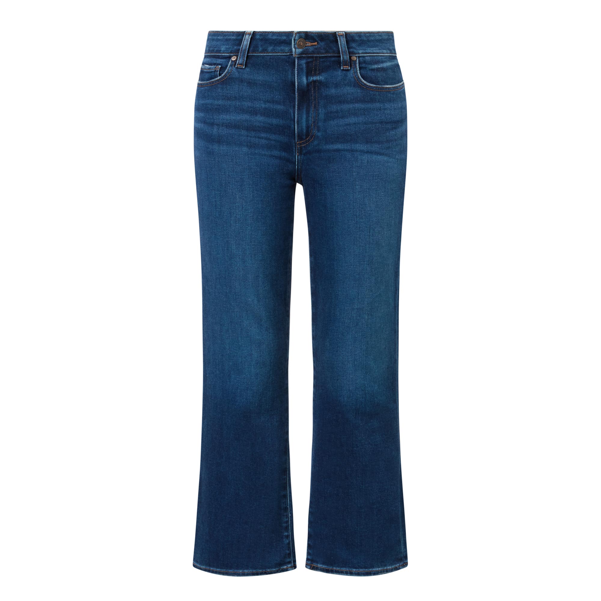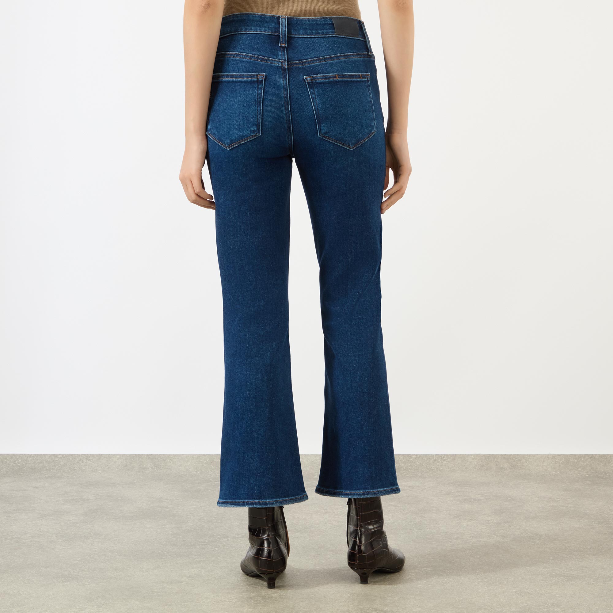 - Mid-rise, bootcut leg, cropped length, belt loops, concealed fly and button fastening, five-pocket styling, clean hems, tobacco stitching, dark wash finish