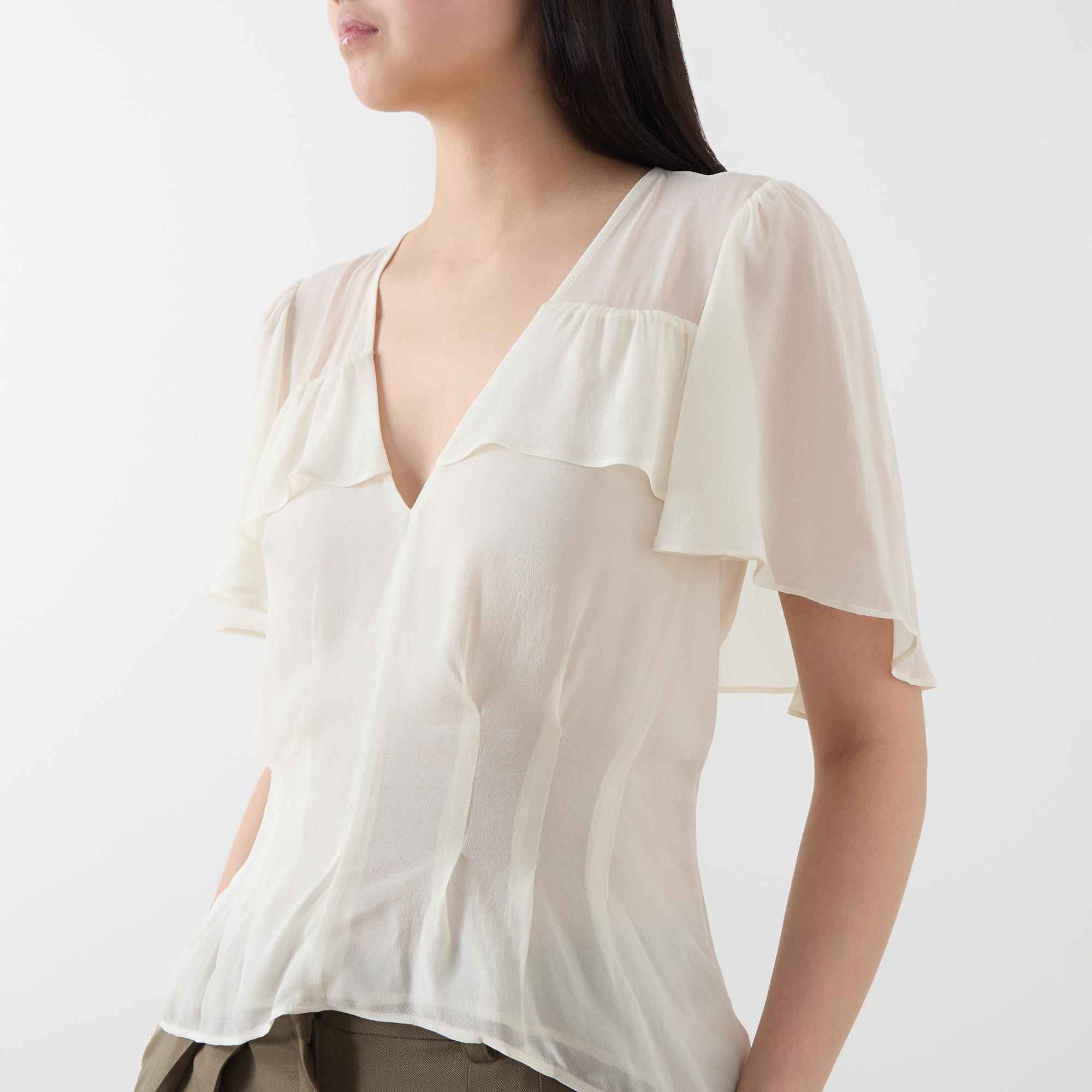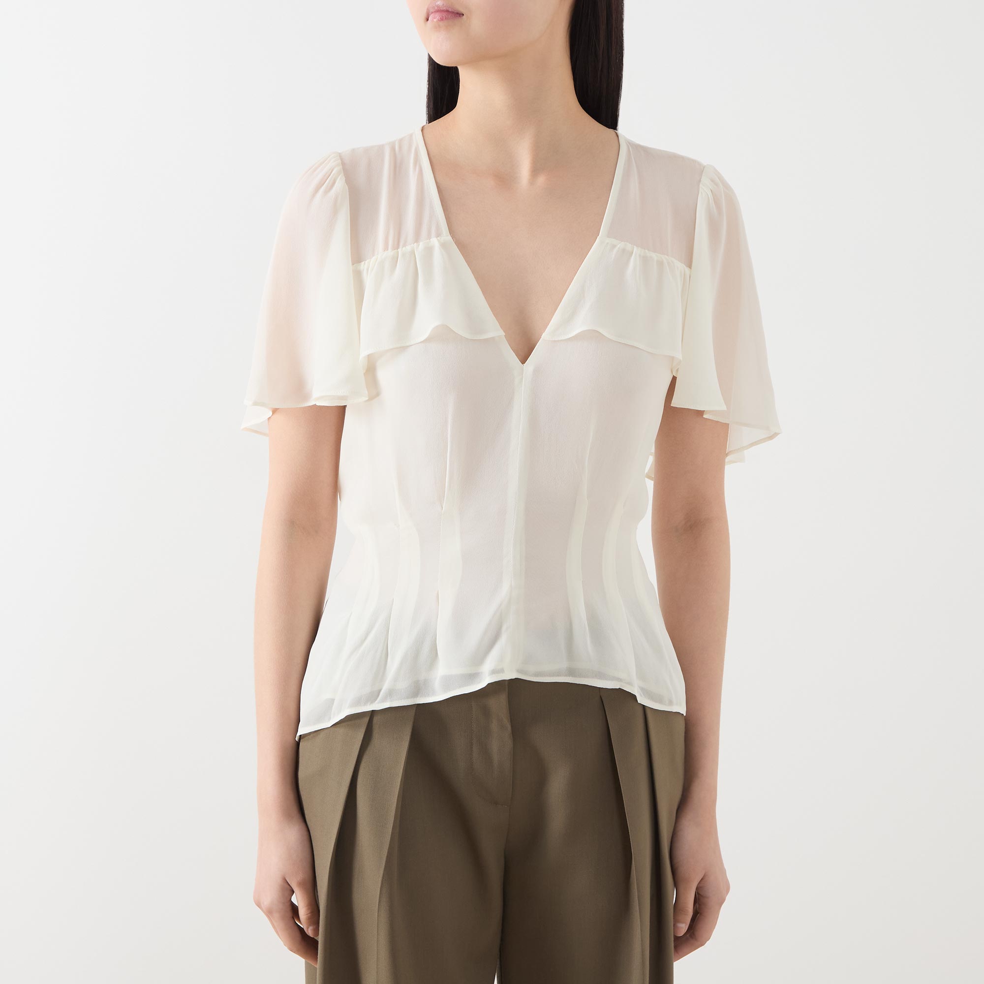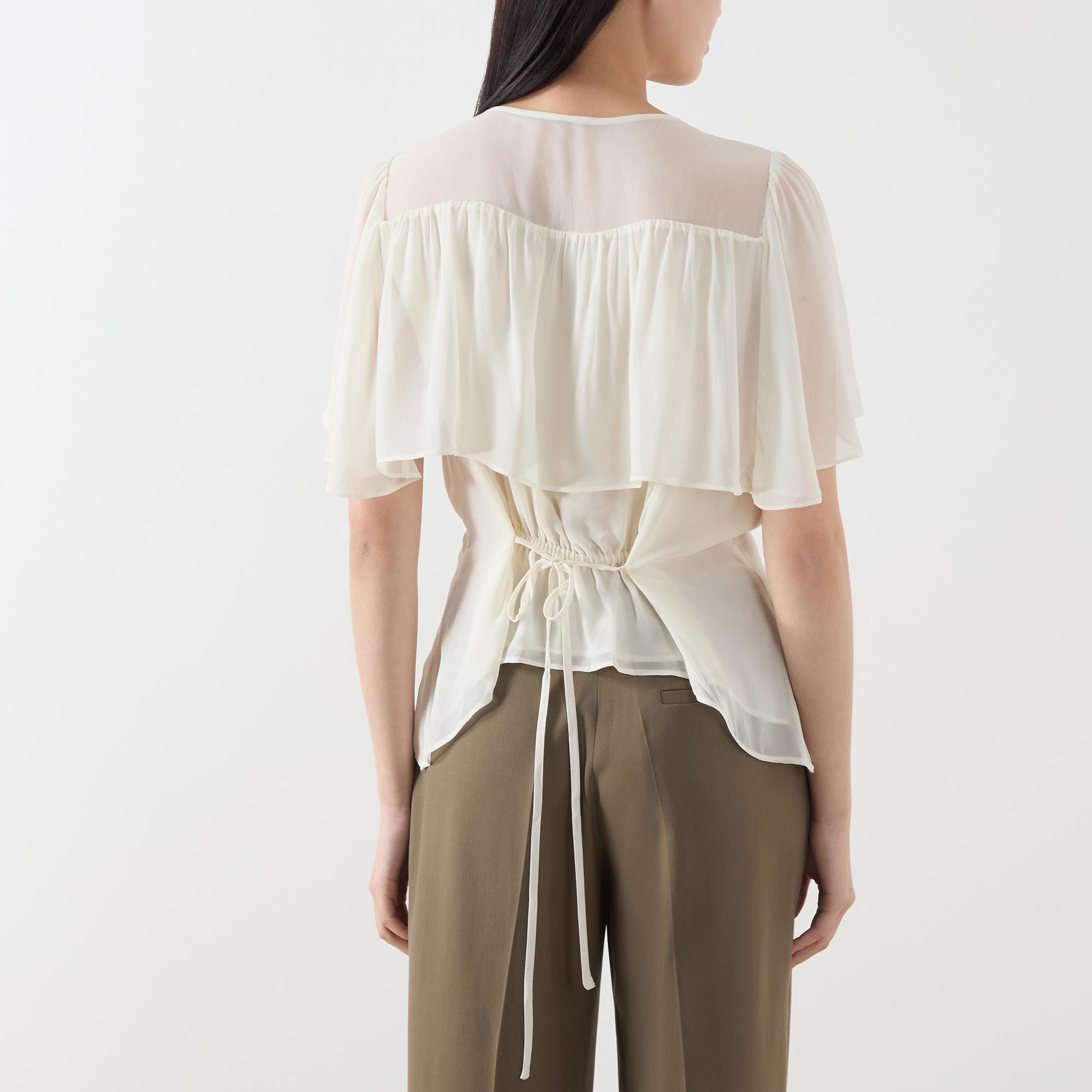 - V-neckline, short sleeves, overlay detailing, ruffle detailing, flared hem, rear tie fastening, darting throughout, semi-sheer finish