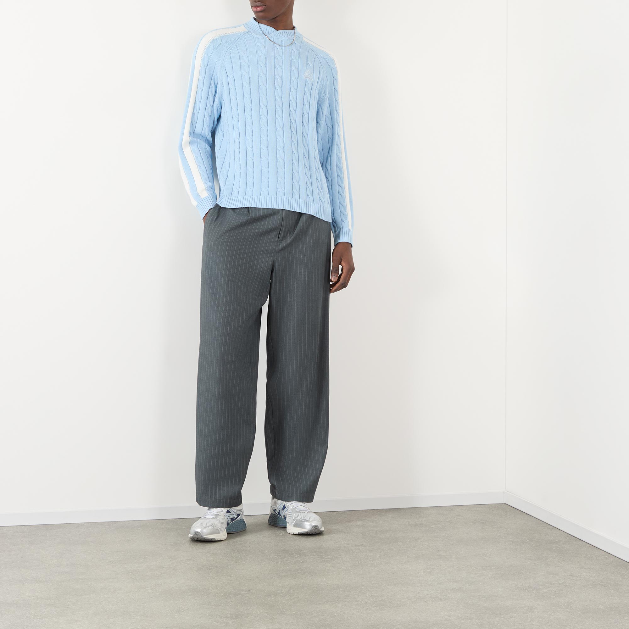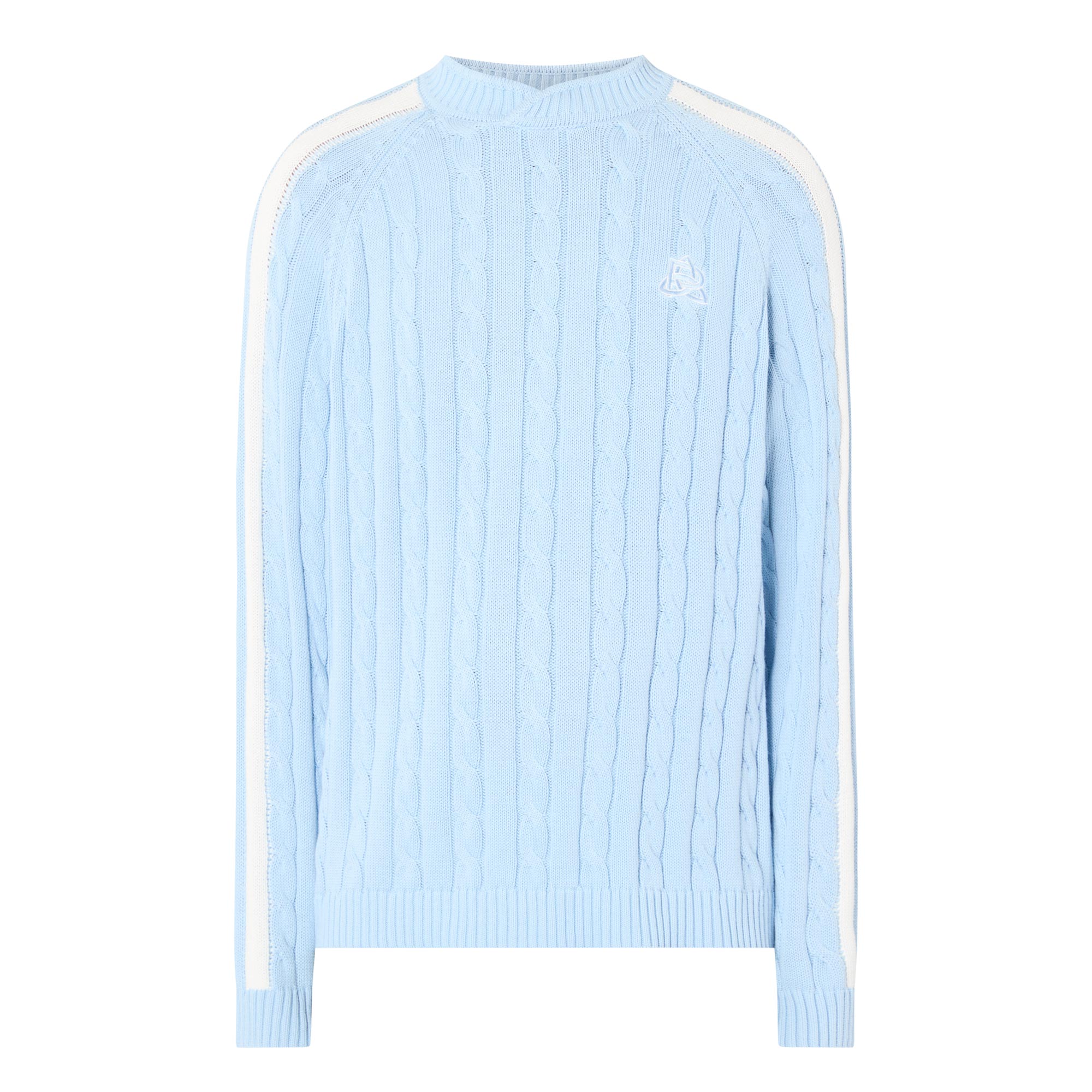 - Cable knit, crew neckline, long sleeves, ribbed trims, logo detail, side stripes