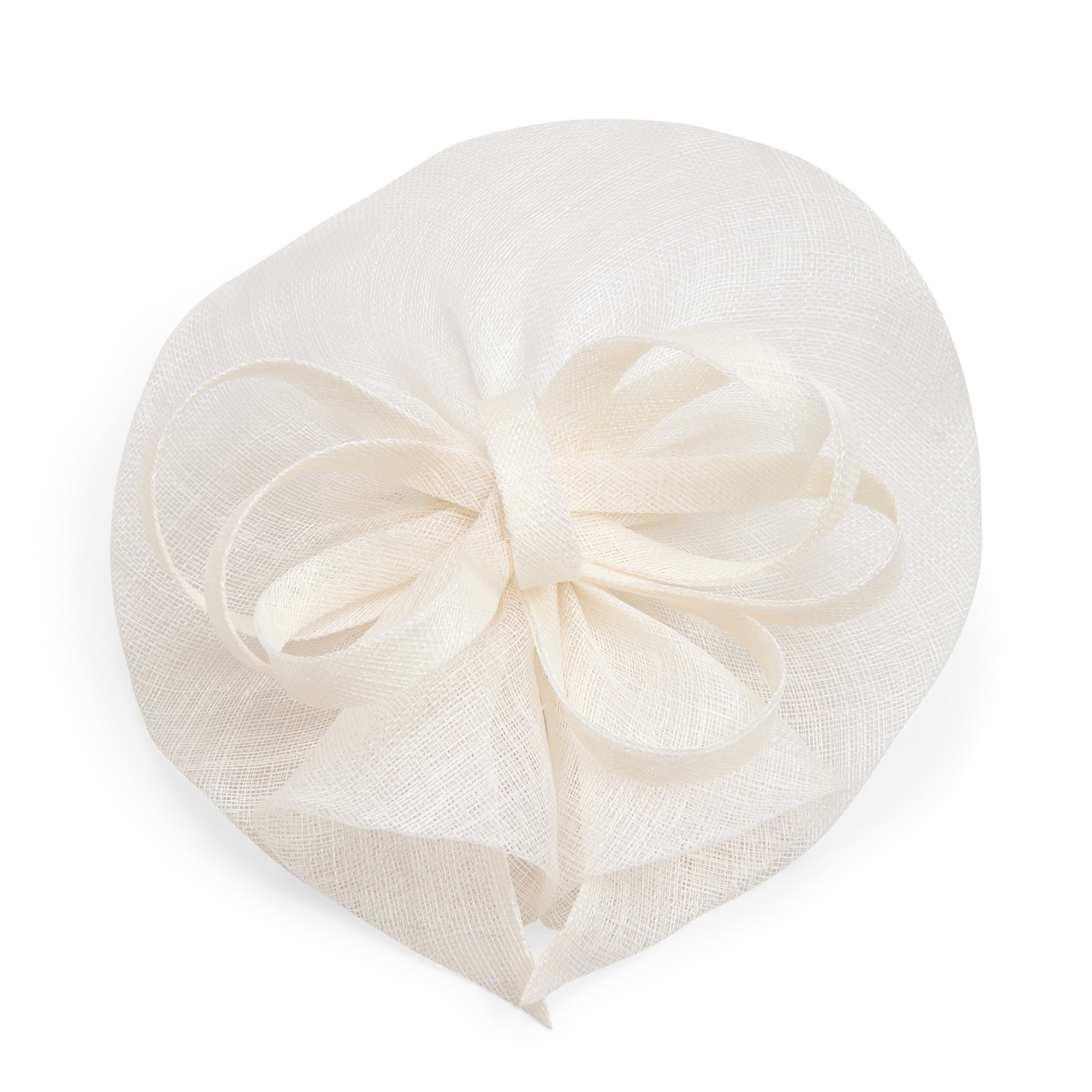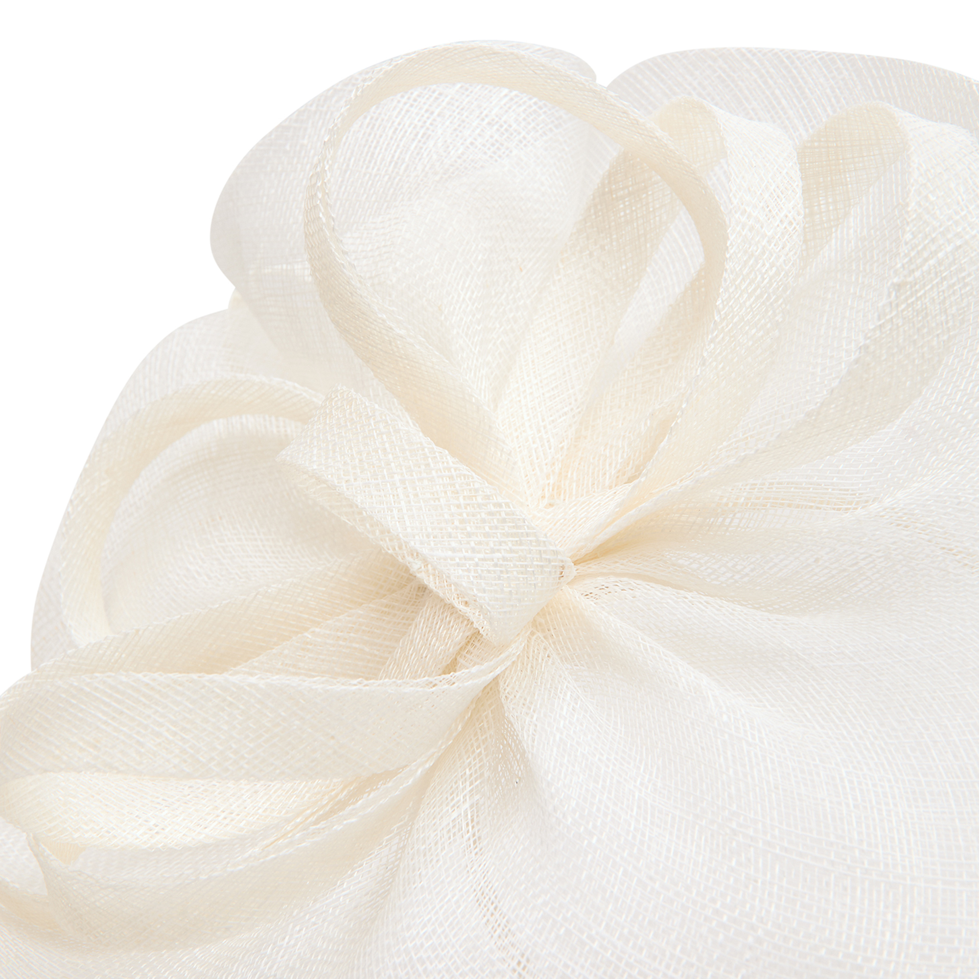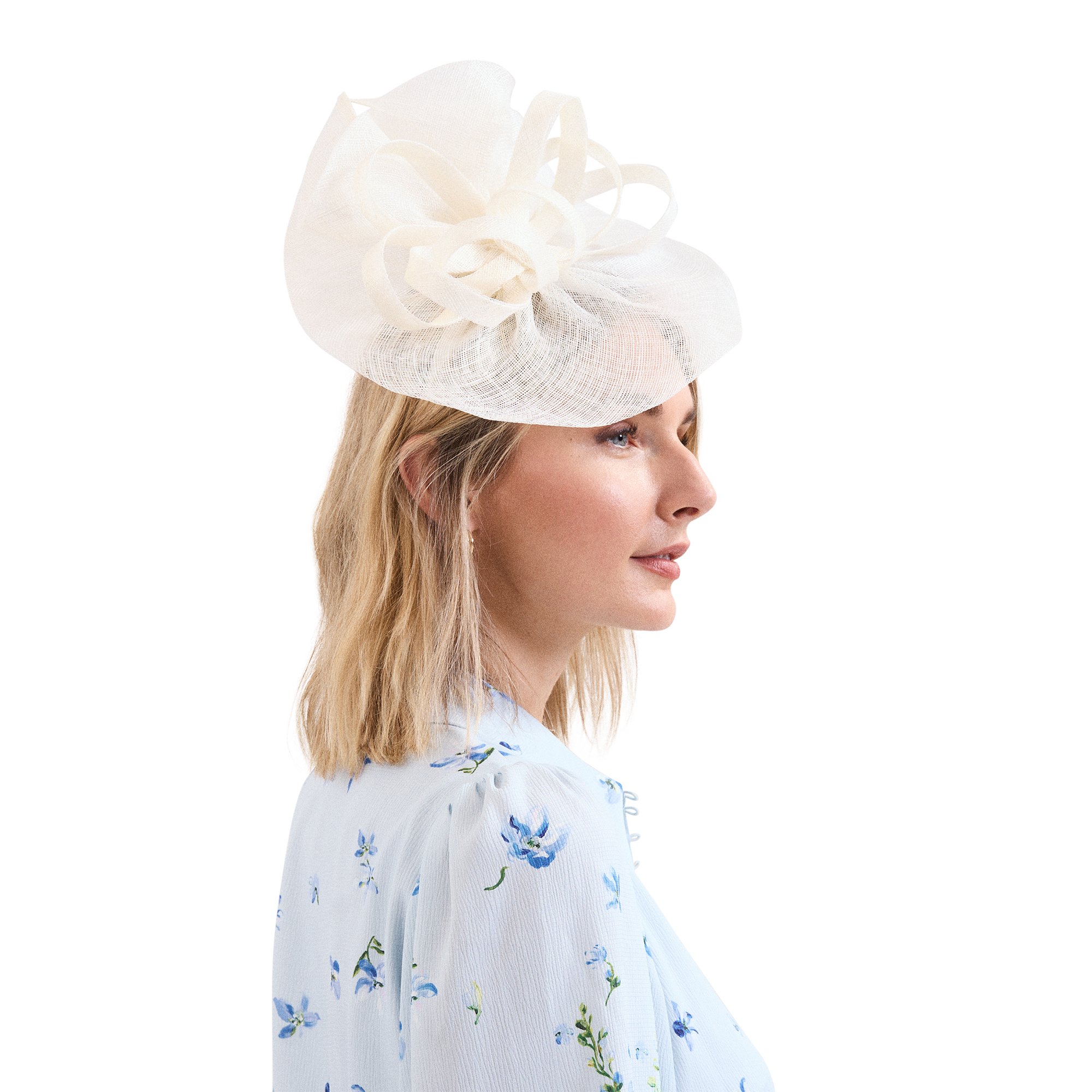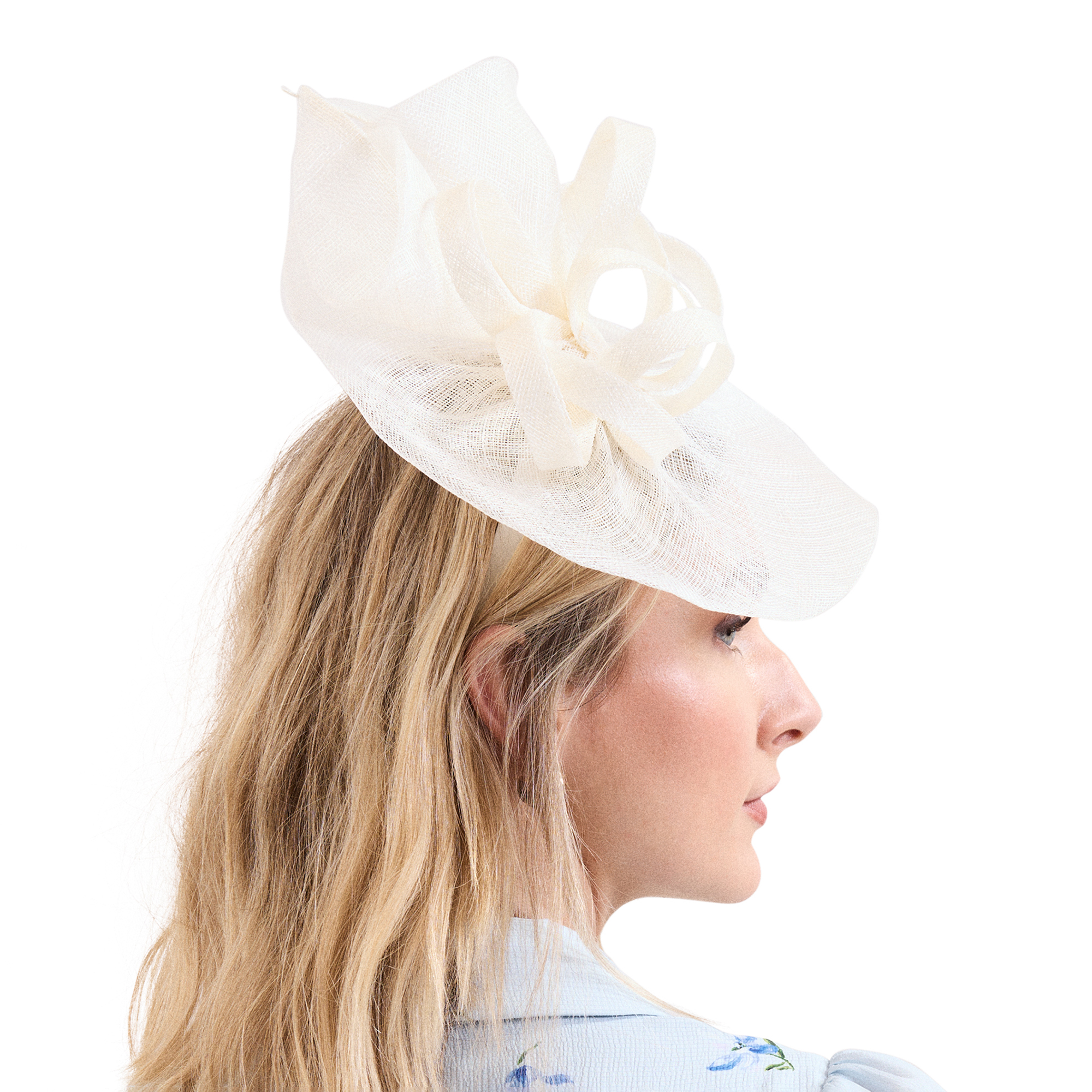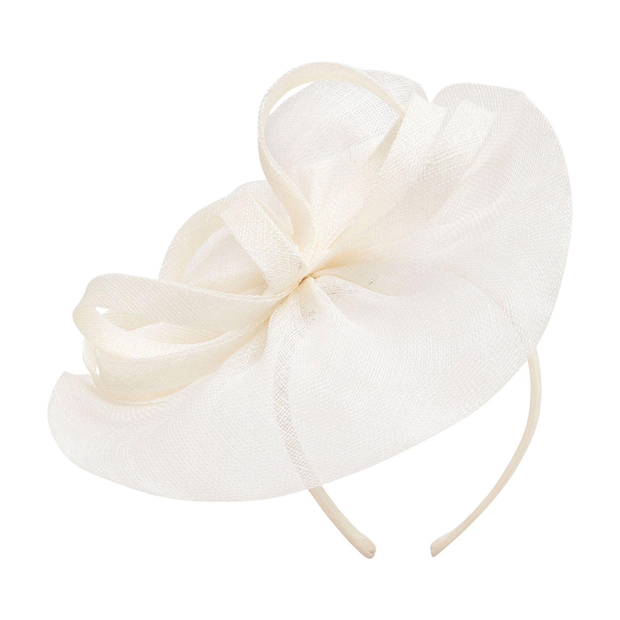 - Fascinator design, headband style, twisted appliqué detail, woven finish