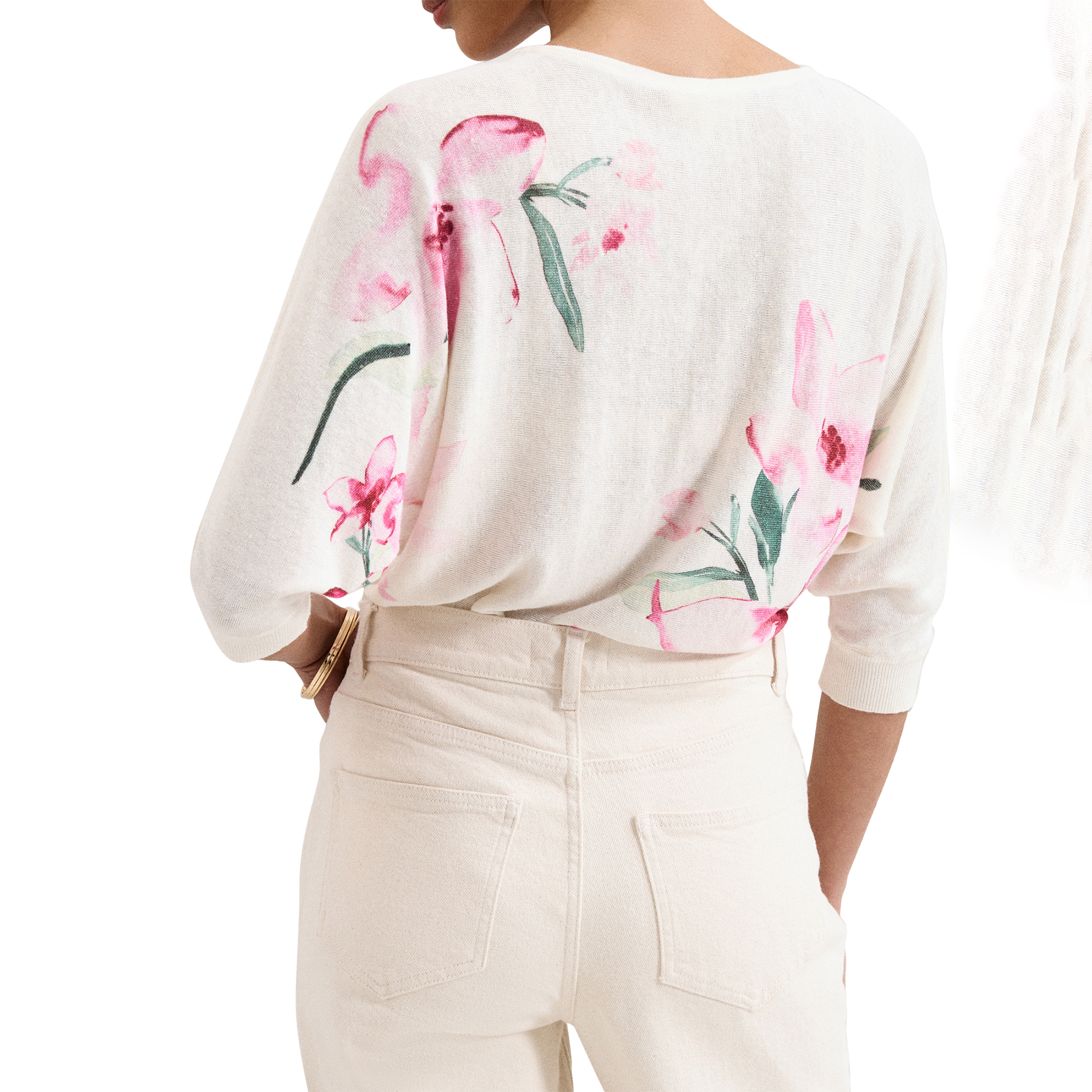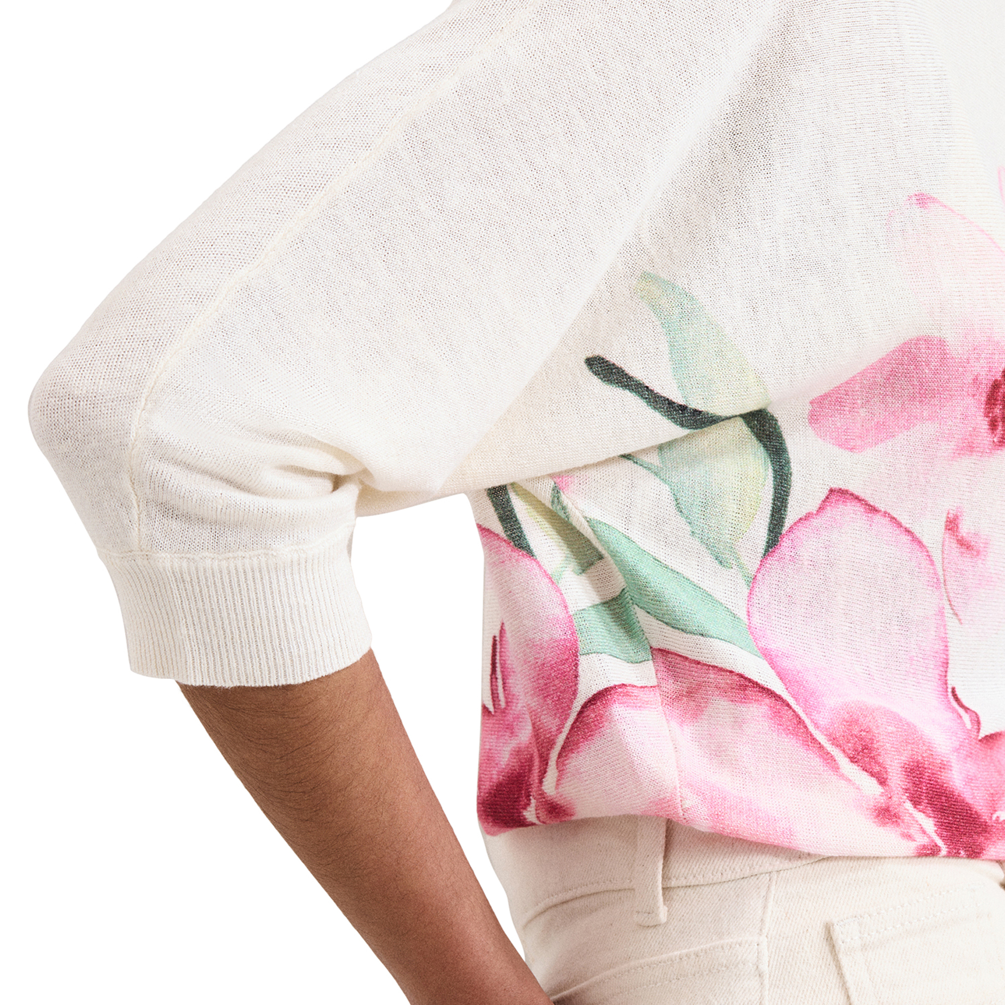 - Round neckline, batwing sleeves, floral print, fine-knit construction