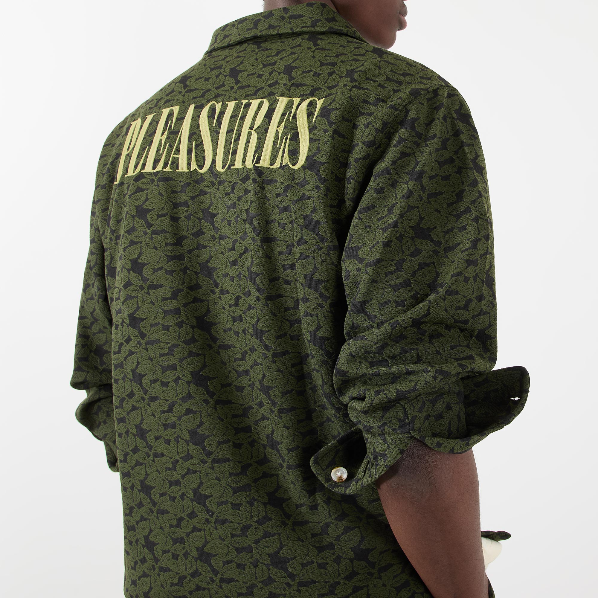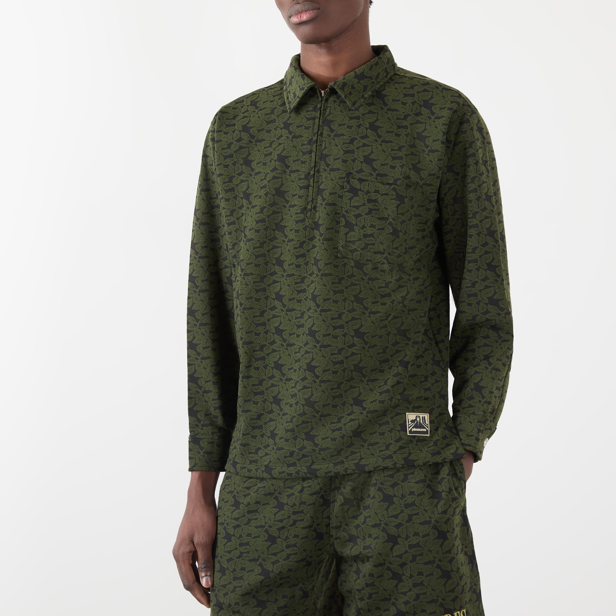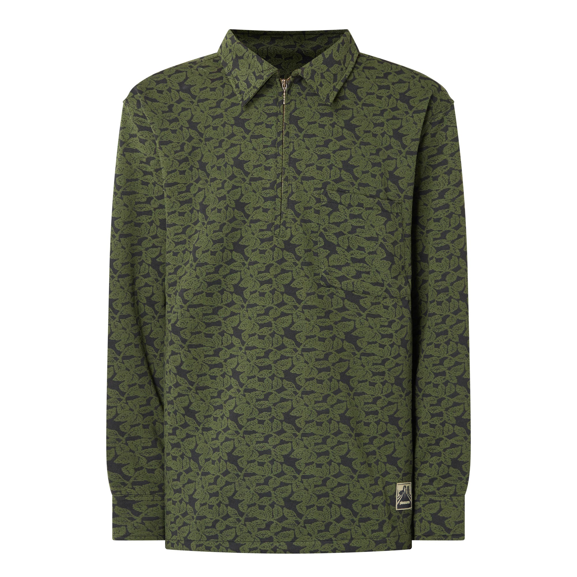 - Spread collar, long sleeves, half zip-fastening placket, chest patch pocket, front logo patch, rear logo branding, leaf pattern, single-button cuffs, smooth fabric