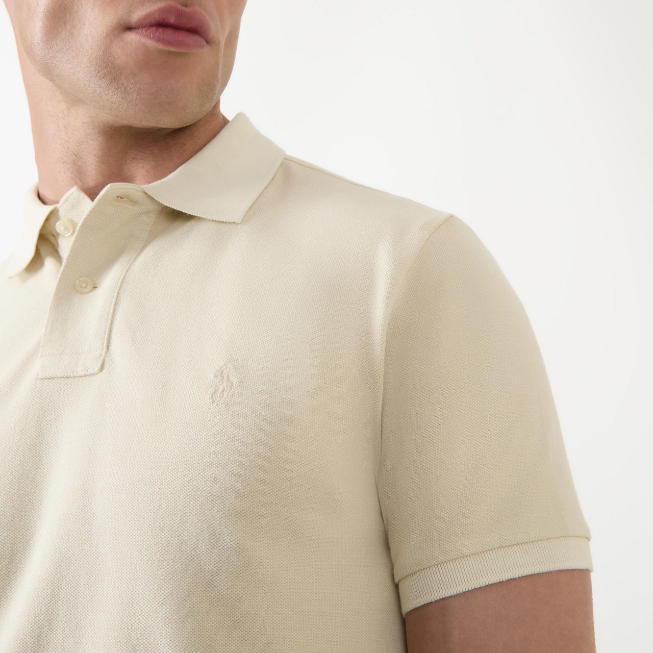 - Polo collar, two-button placket, short sleeves, rib-knit cuffs, straight hem, side slit detailing, polo player logo embroidery on the chest, lightweight, breathable