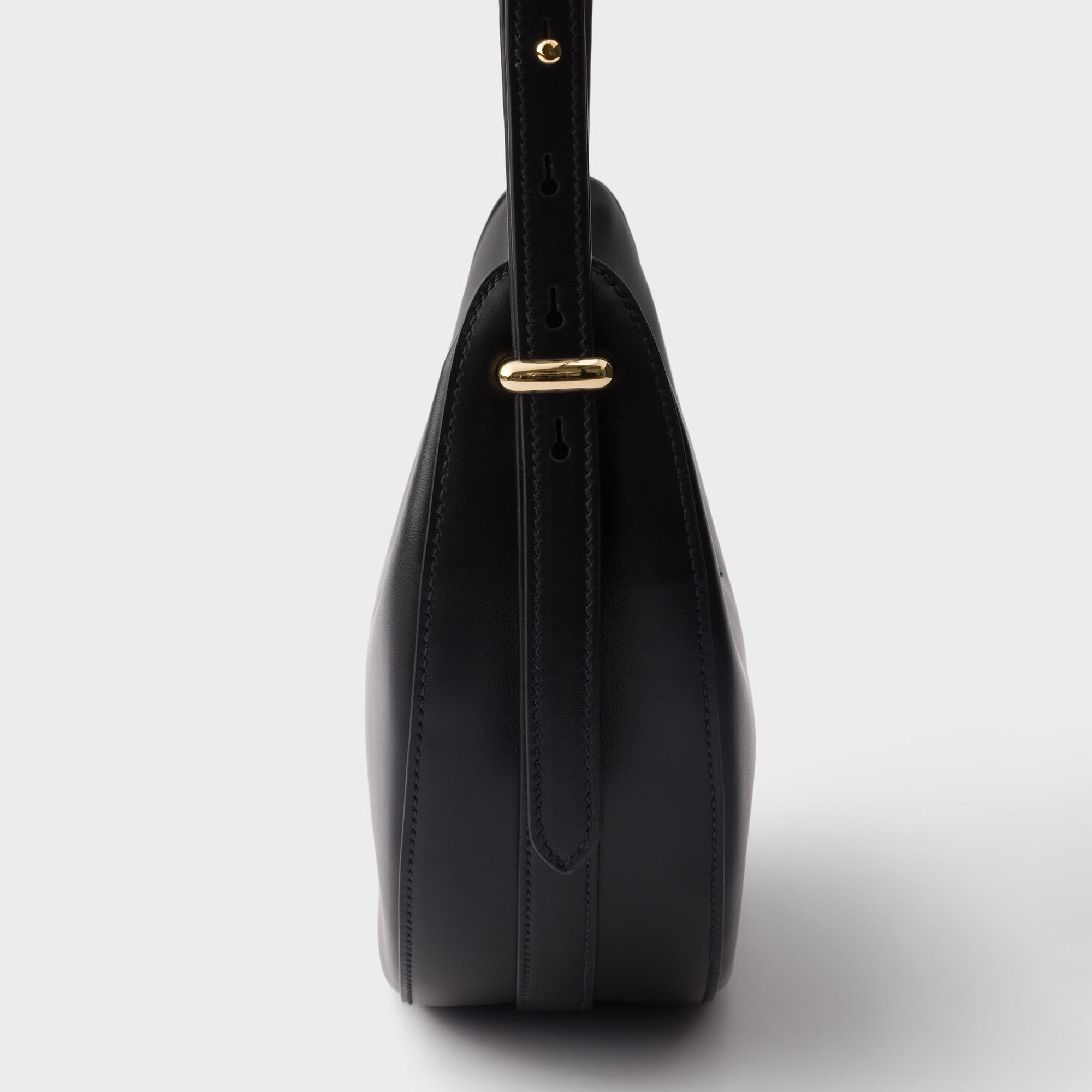 - Adjustable leather shoulder strap, enamelled metal triangle logo on the front, zipper closure, logo print lining, patch pocket, gold-tone hardware