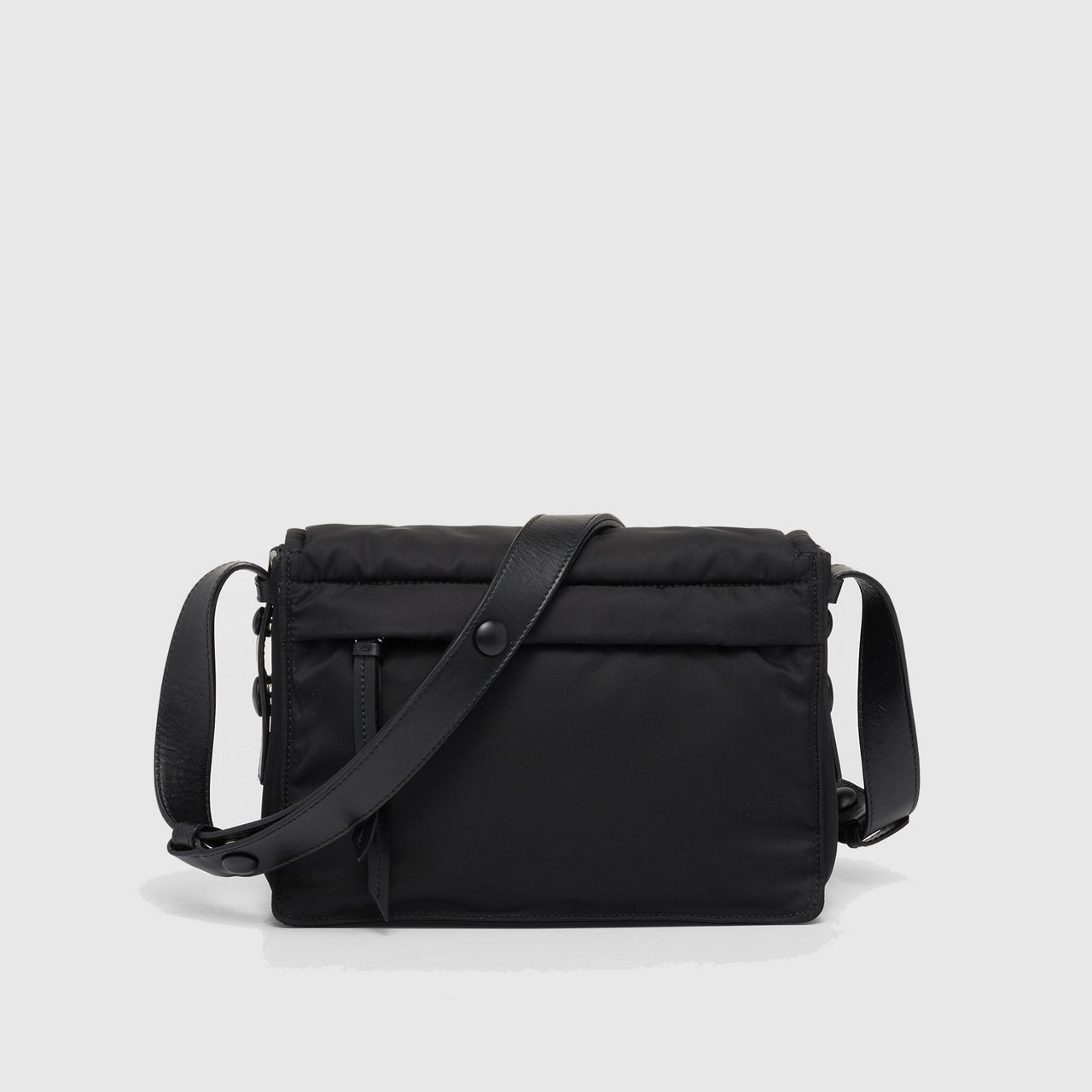 - Adjustable leather shoulder strap, zipper pocket on the back, metal hardware, front enamelled metal triangle logo, magnetic closure