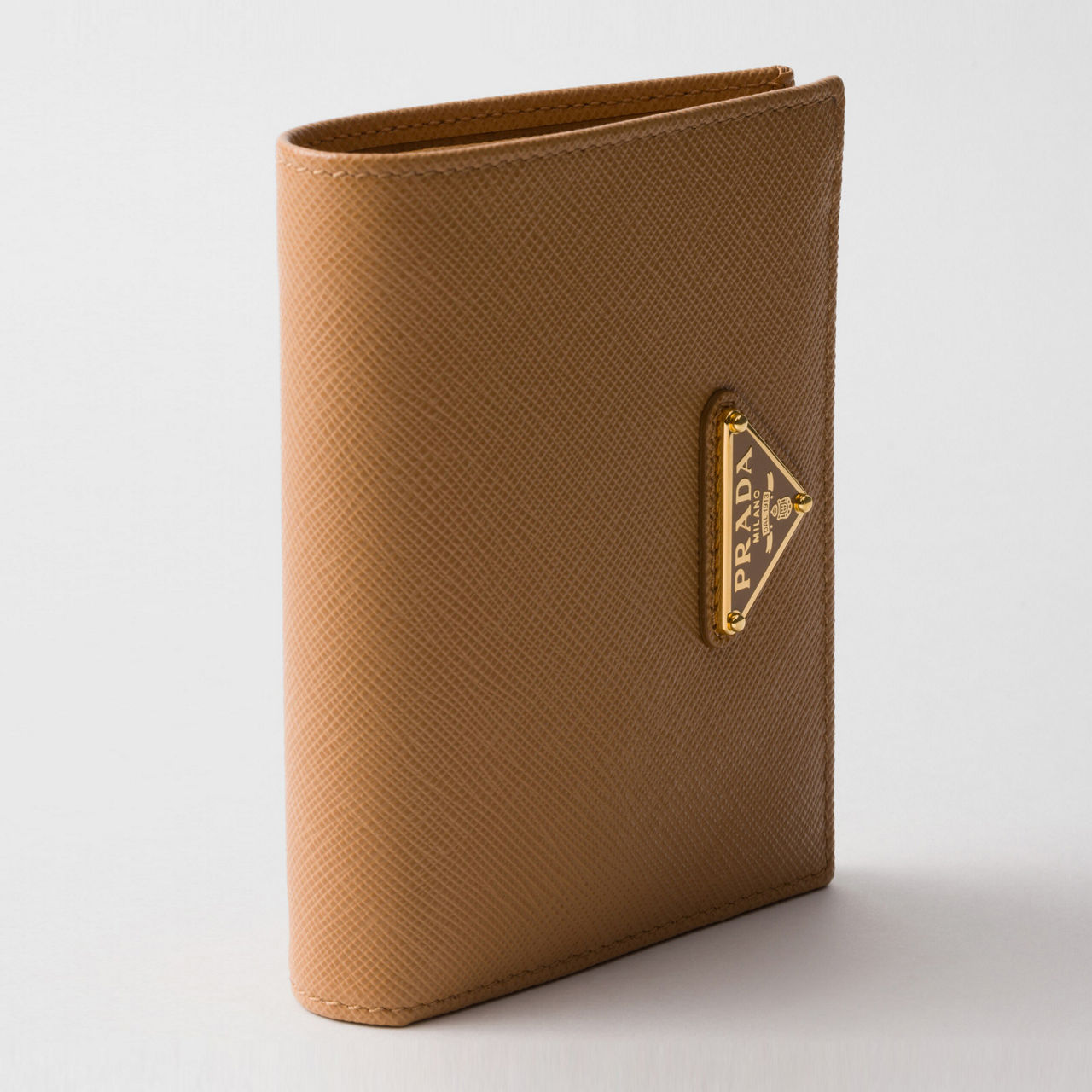 - Snap fastening, enamelled metal triangle logo, moire and Saffiano leather lining, gold-tone hardware