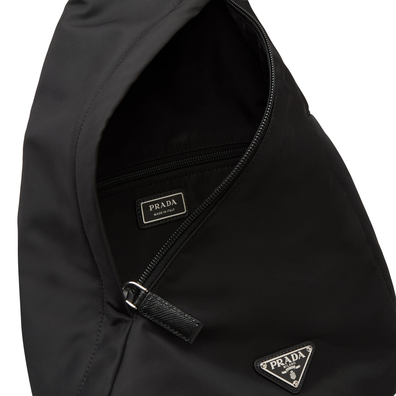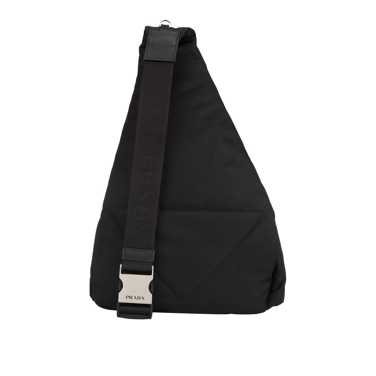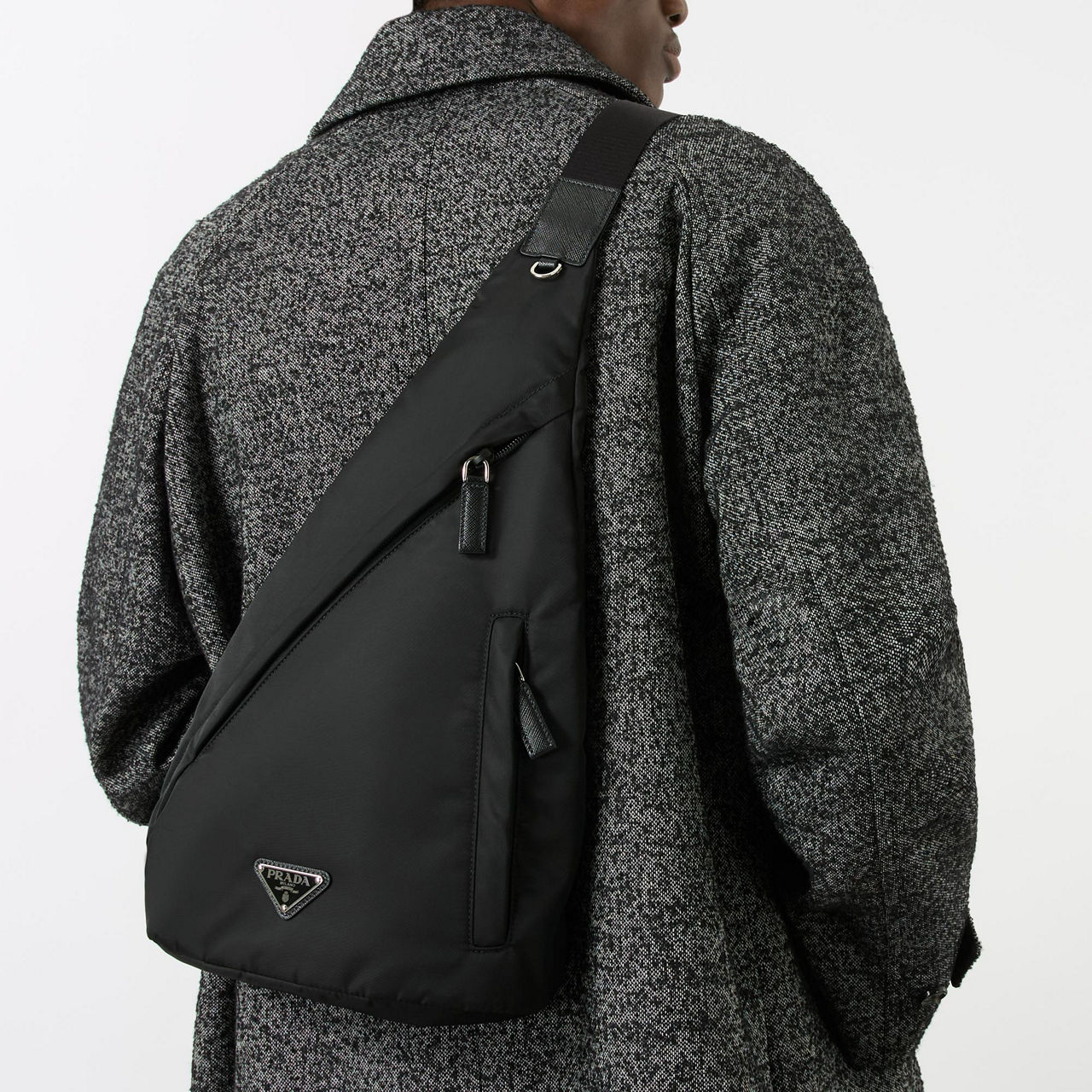 - Sling style, adjustable strap, asymmetric zip fastening, silver-tone hardware, D-ring, triangle logo hardware