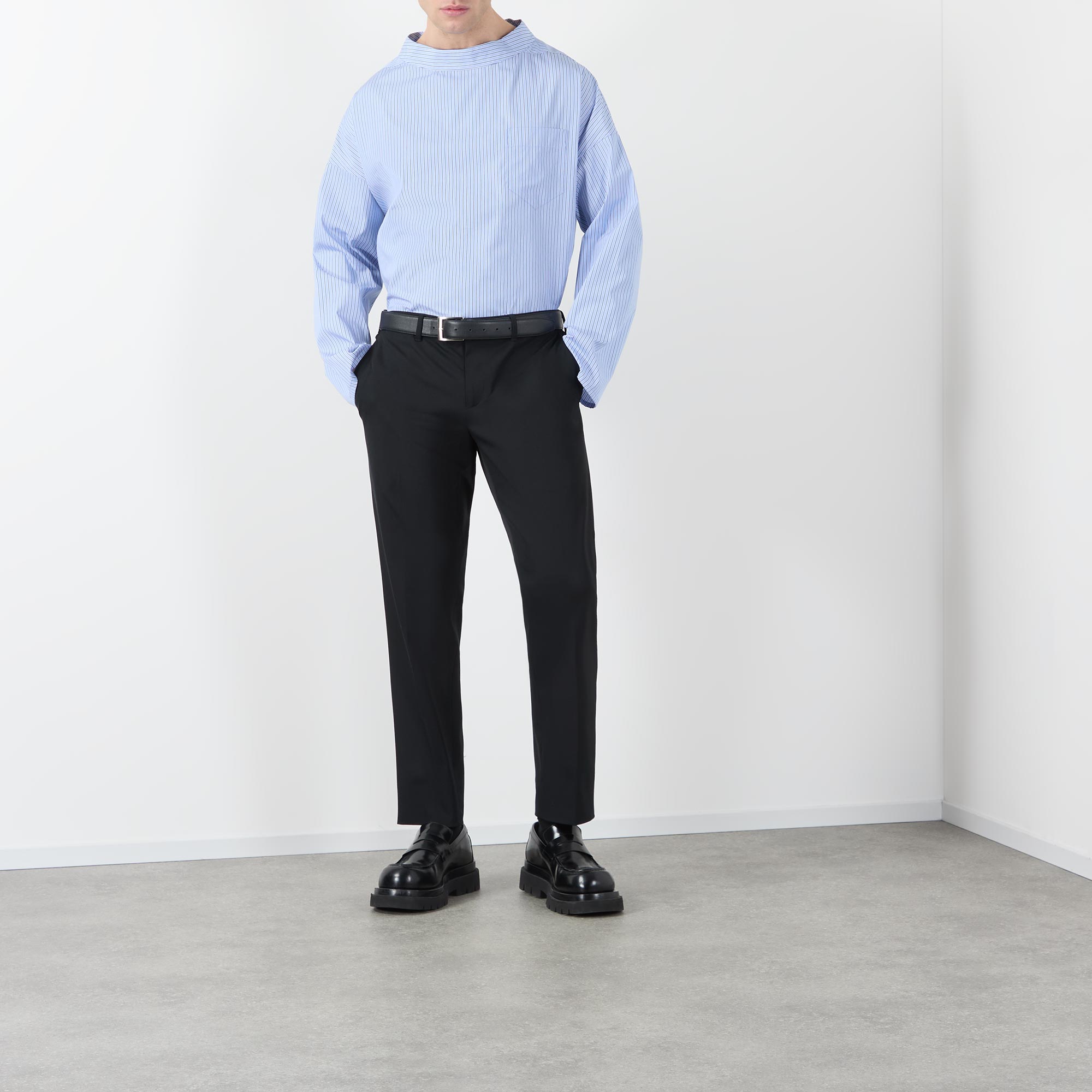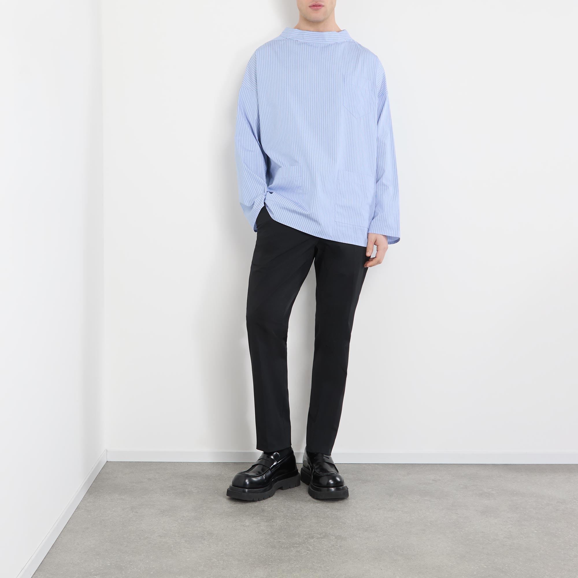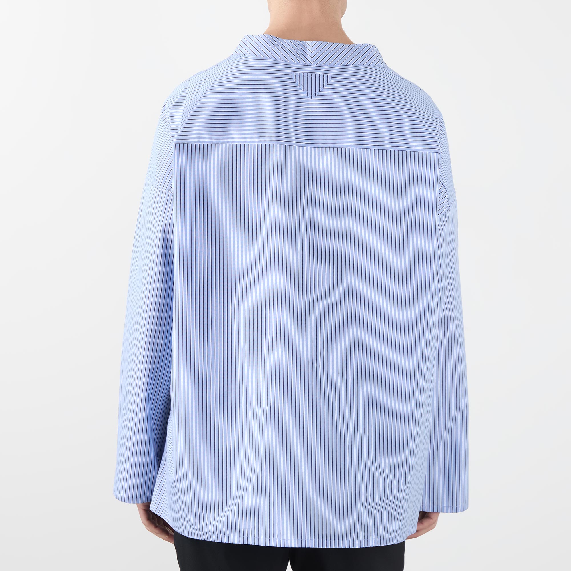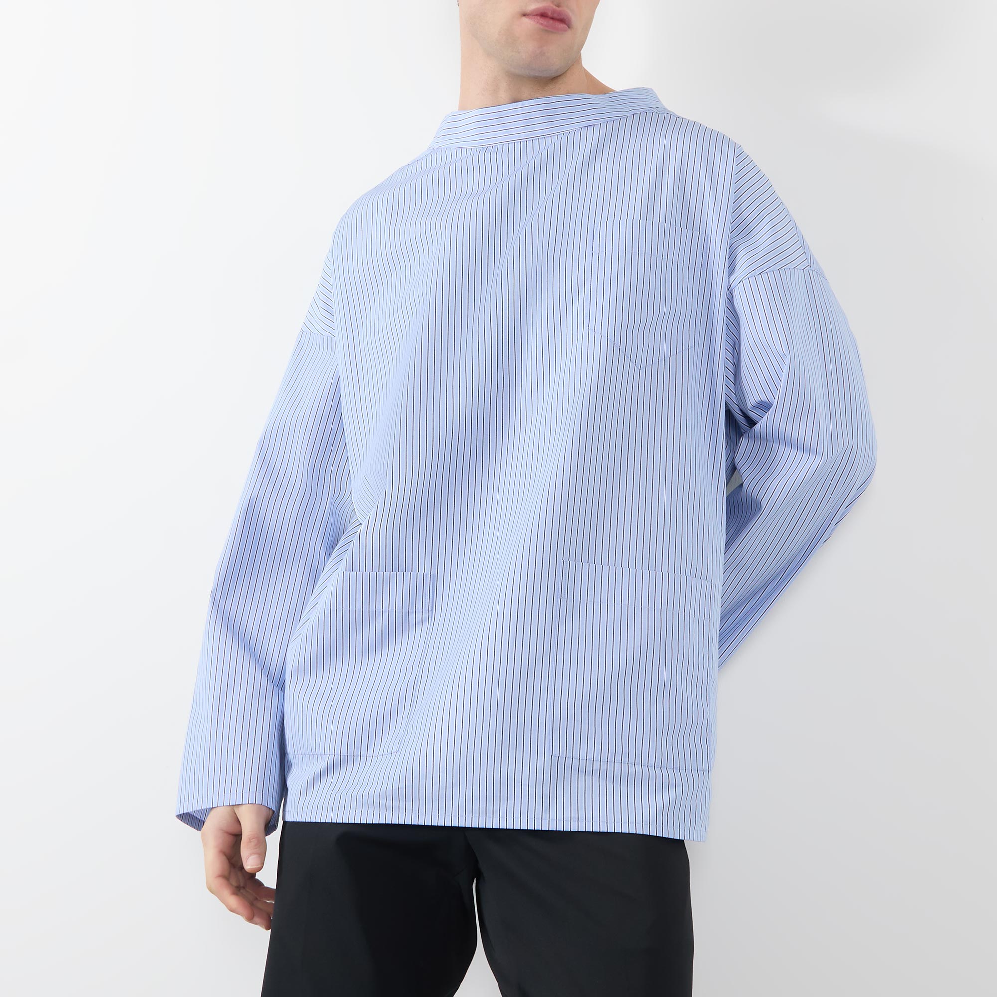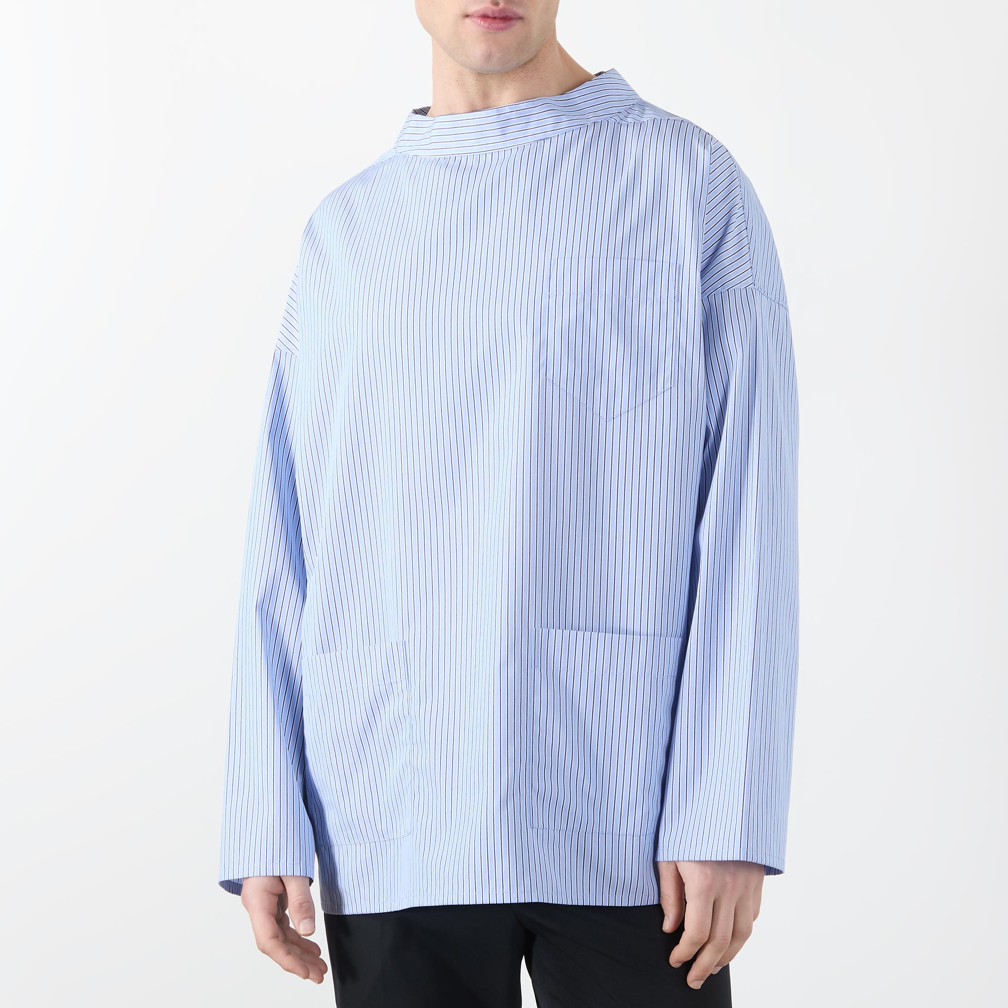 - Wide mock collar, dropped shoulders, long sleeves, one chest and two front patch pockets, curved hem, triangle logo detail at the back of the neck, striped pattern