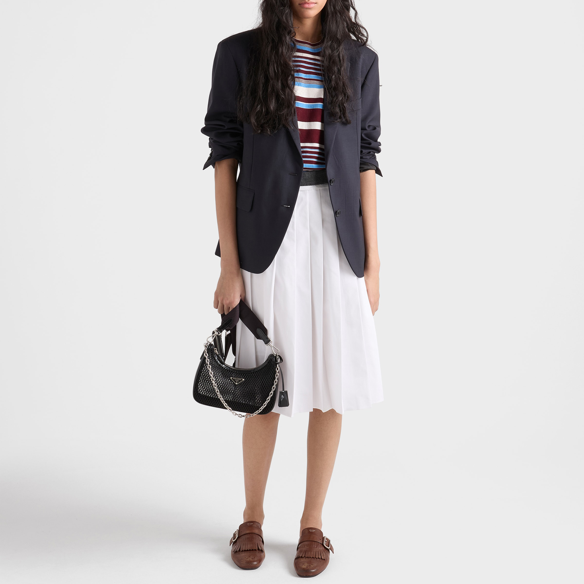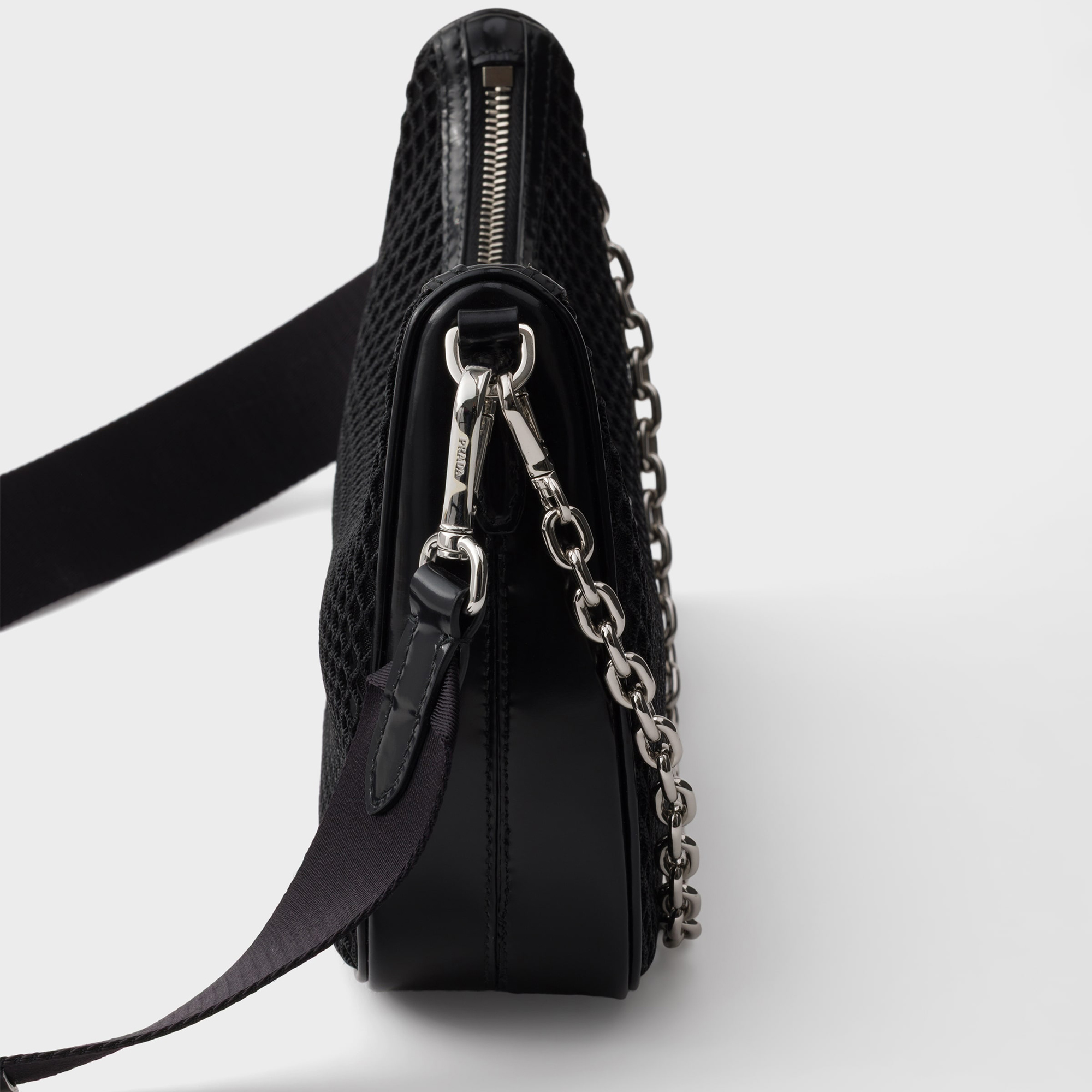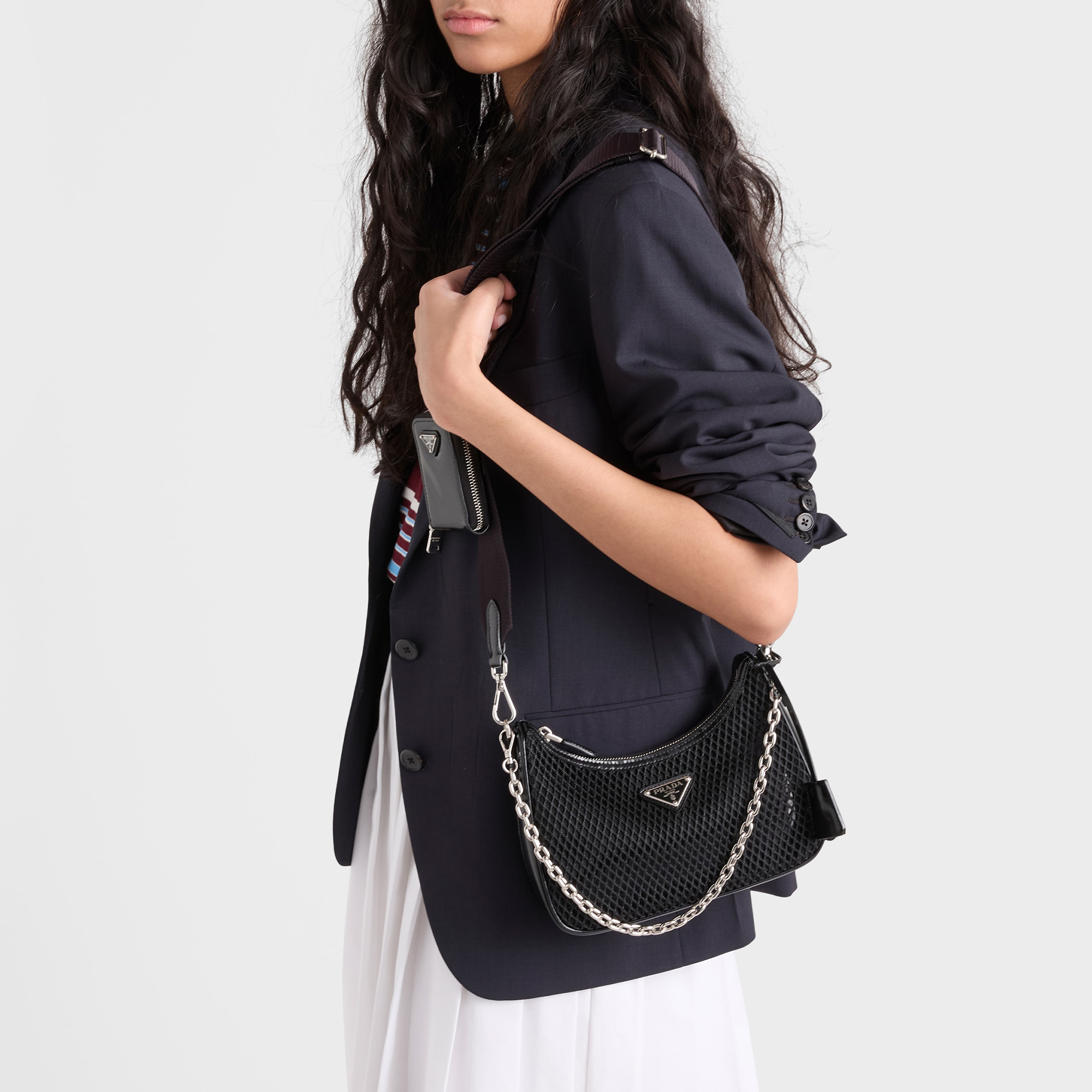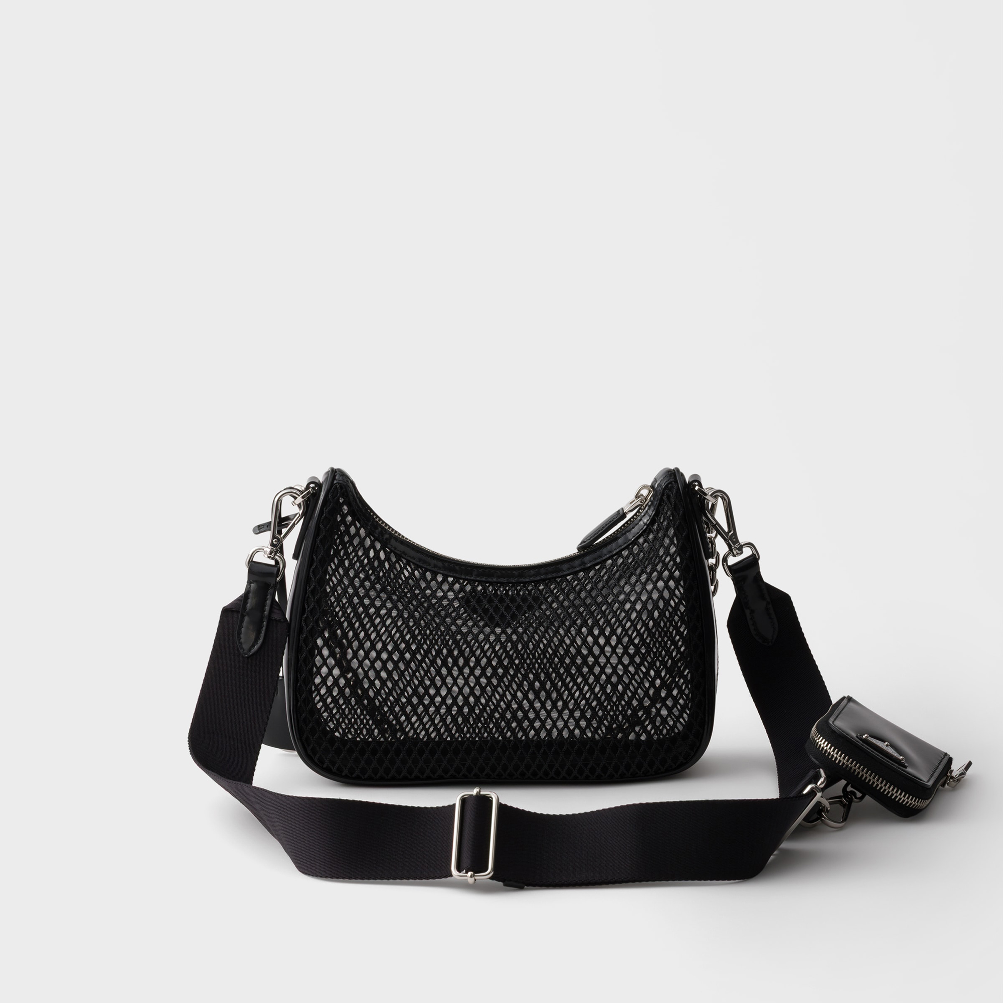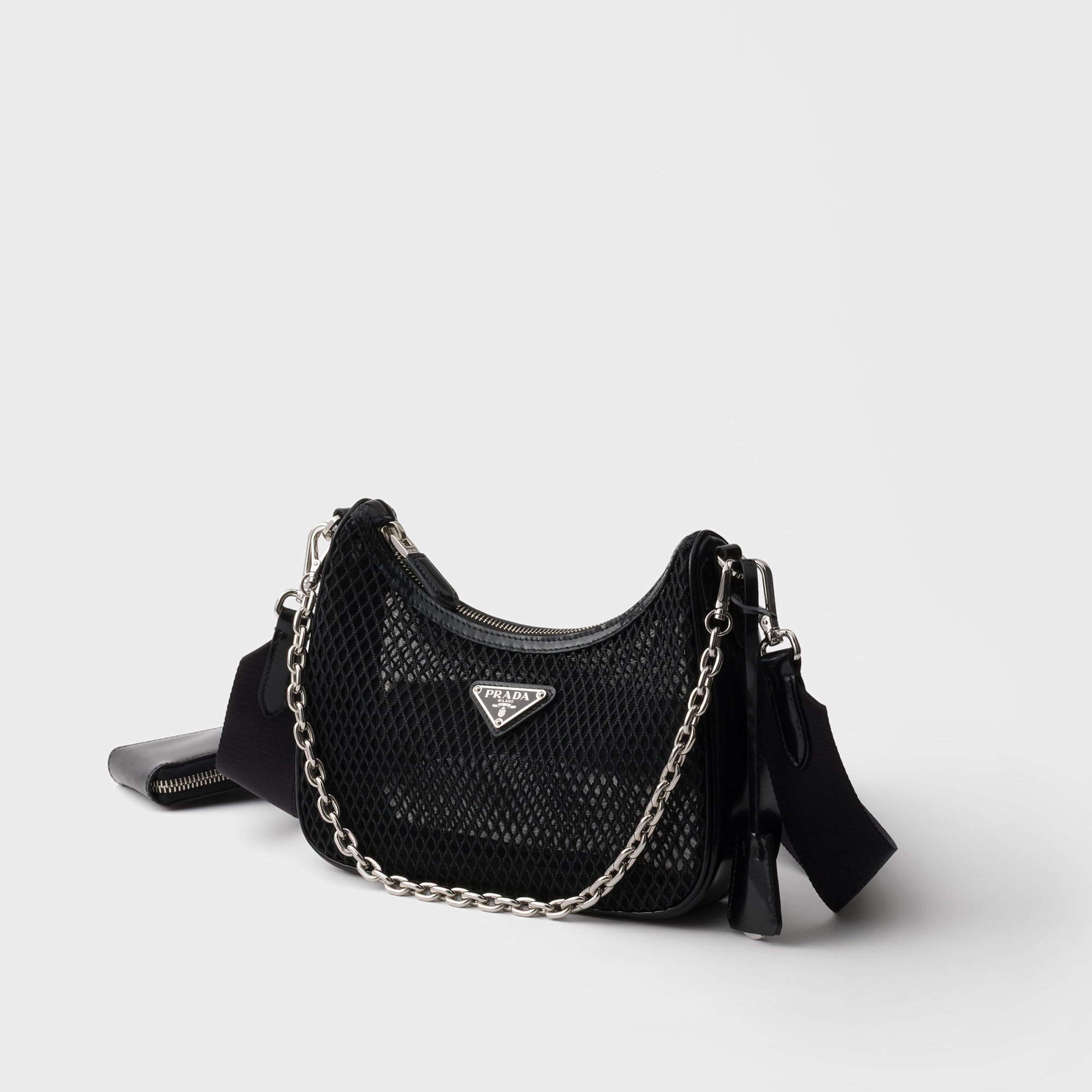 - Removable chain handle, detachable and adjustable logo jacquard woven strap, removable leather zipper pouch, ReEdition key ring, silver-tone metal hardware, enamelled metal triangle logo on the front, zipper closure