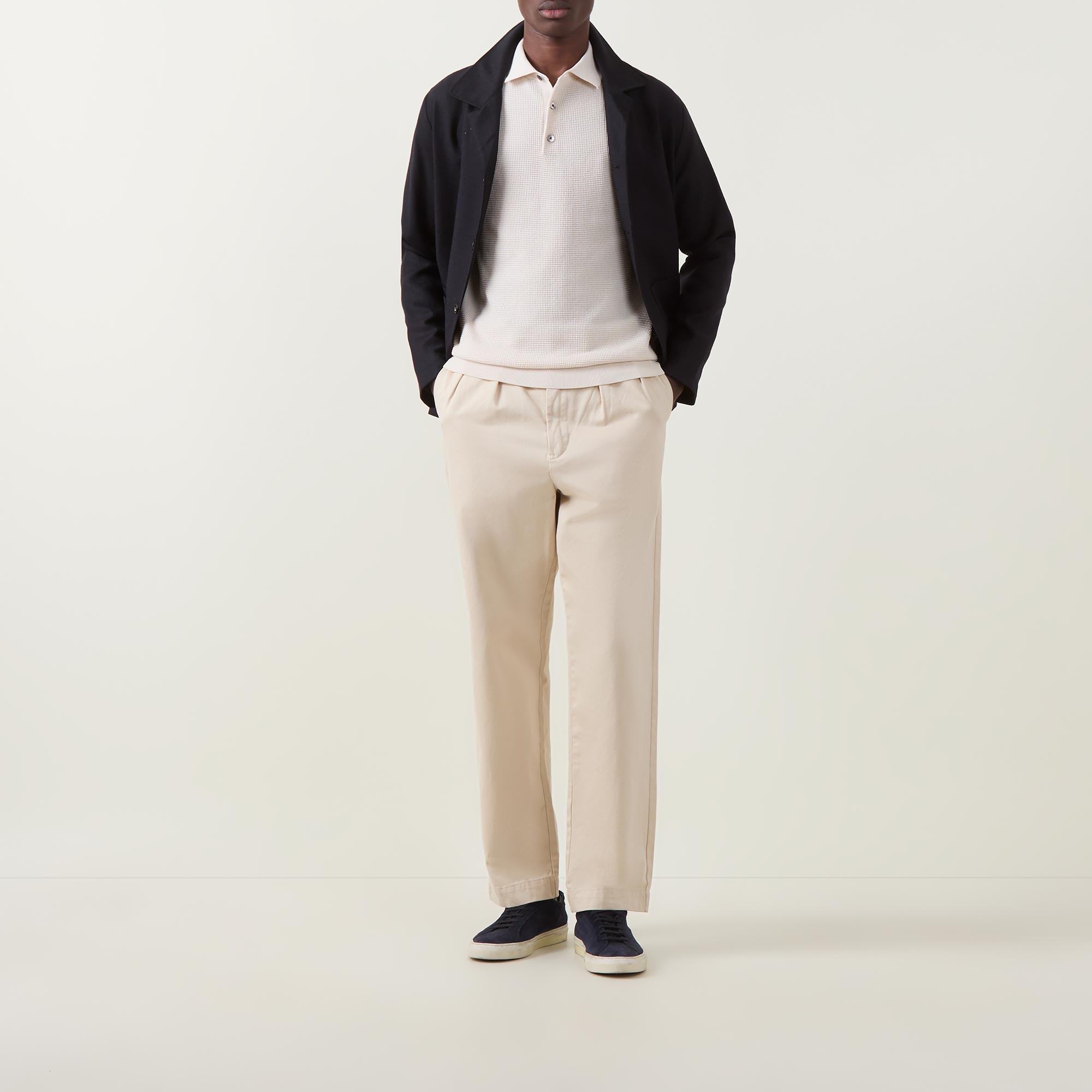 - Waffle texture, polo collar, short sleeves, straight hemline, button fastenings