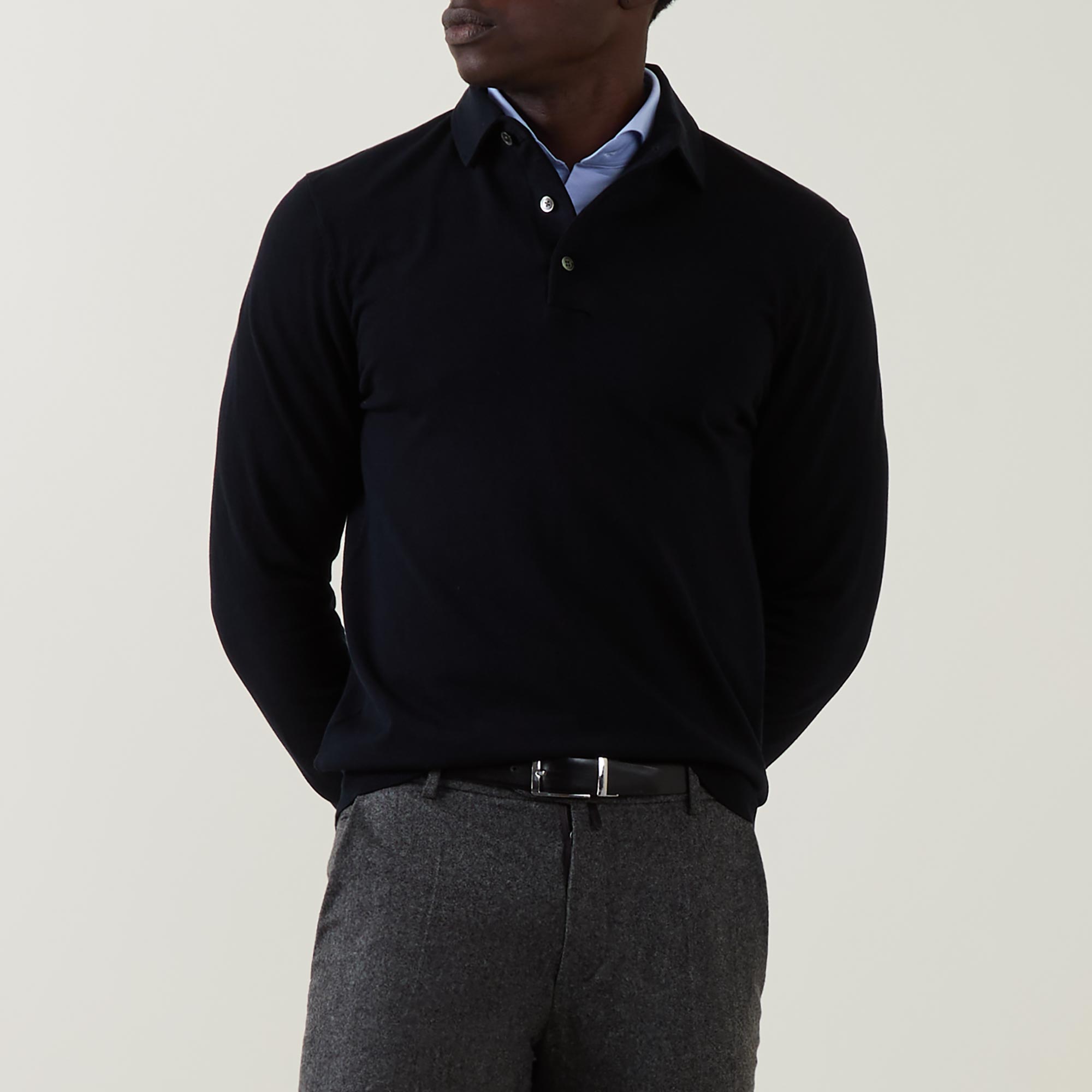 - Long sleeves, polo collar, button fastenings, straight hemline