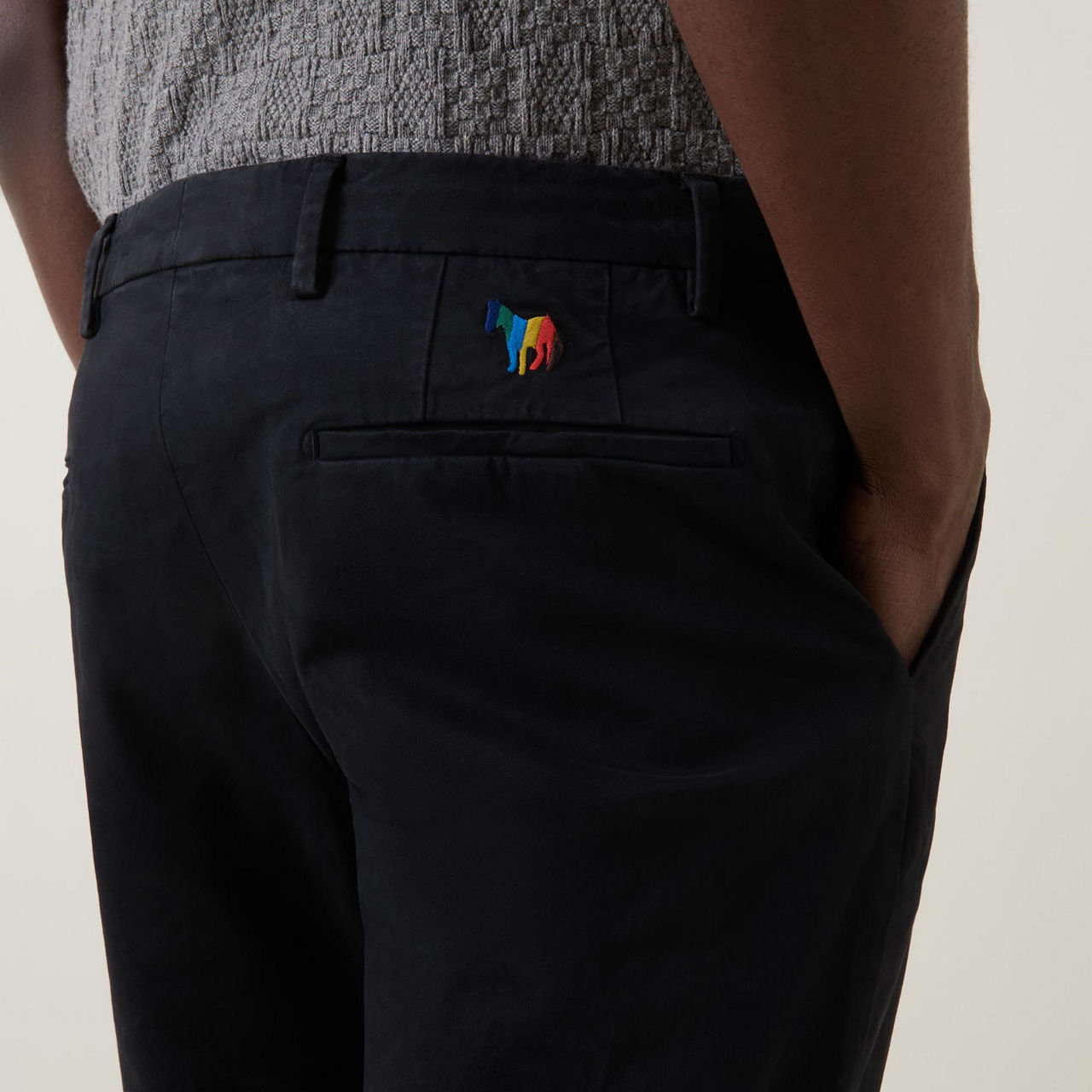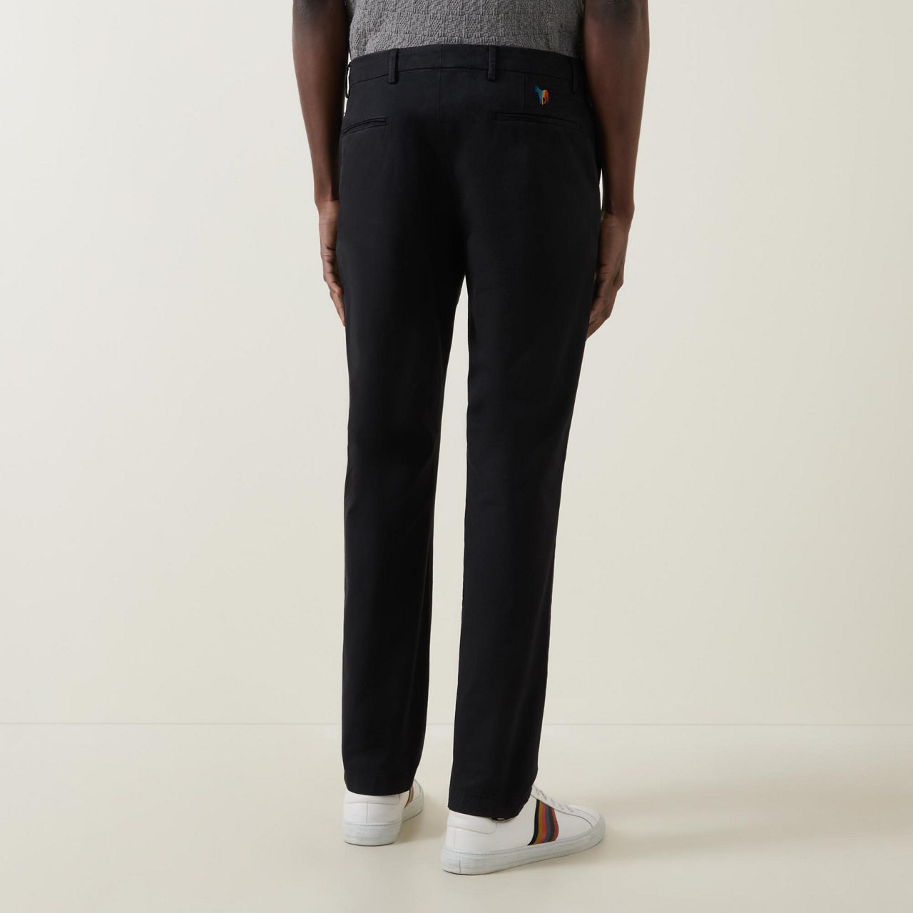 - Mid-rise, slim-leg, belt loops, concealed fly and button fastening, two side slit pockets, two rear welt pockets, clean hems, embroidered zebra logo detail, soft finish