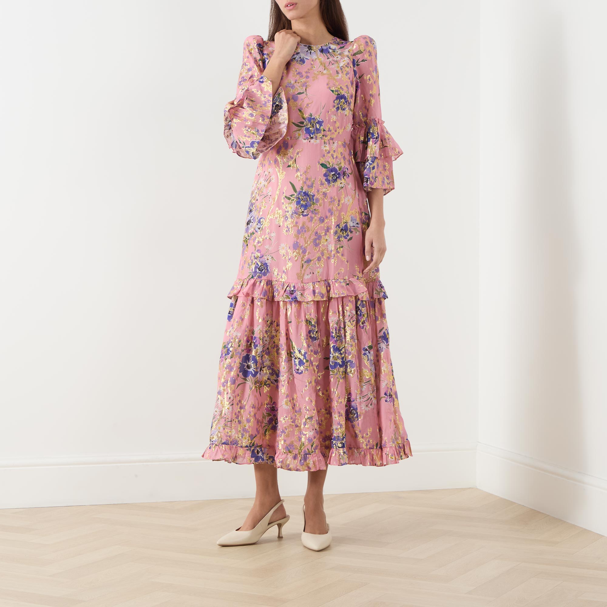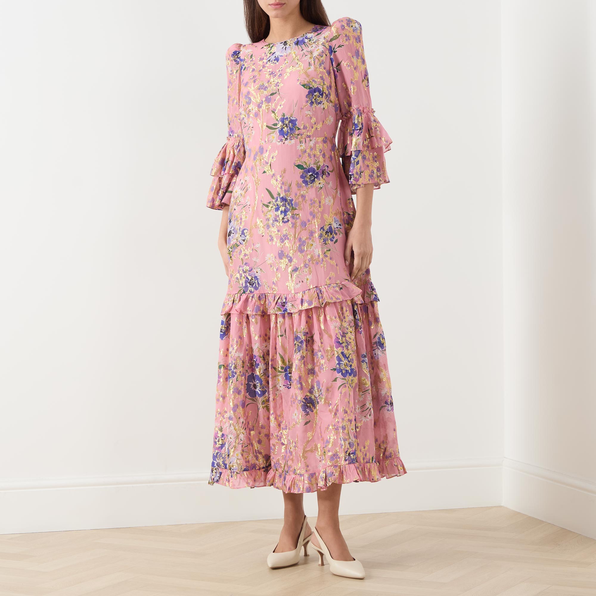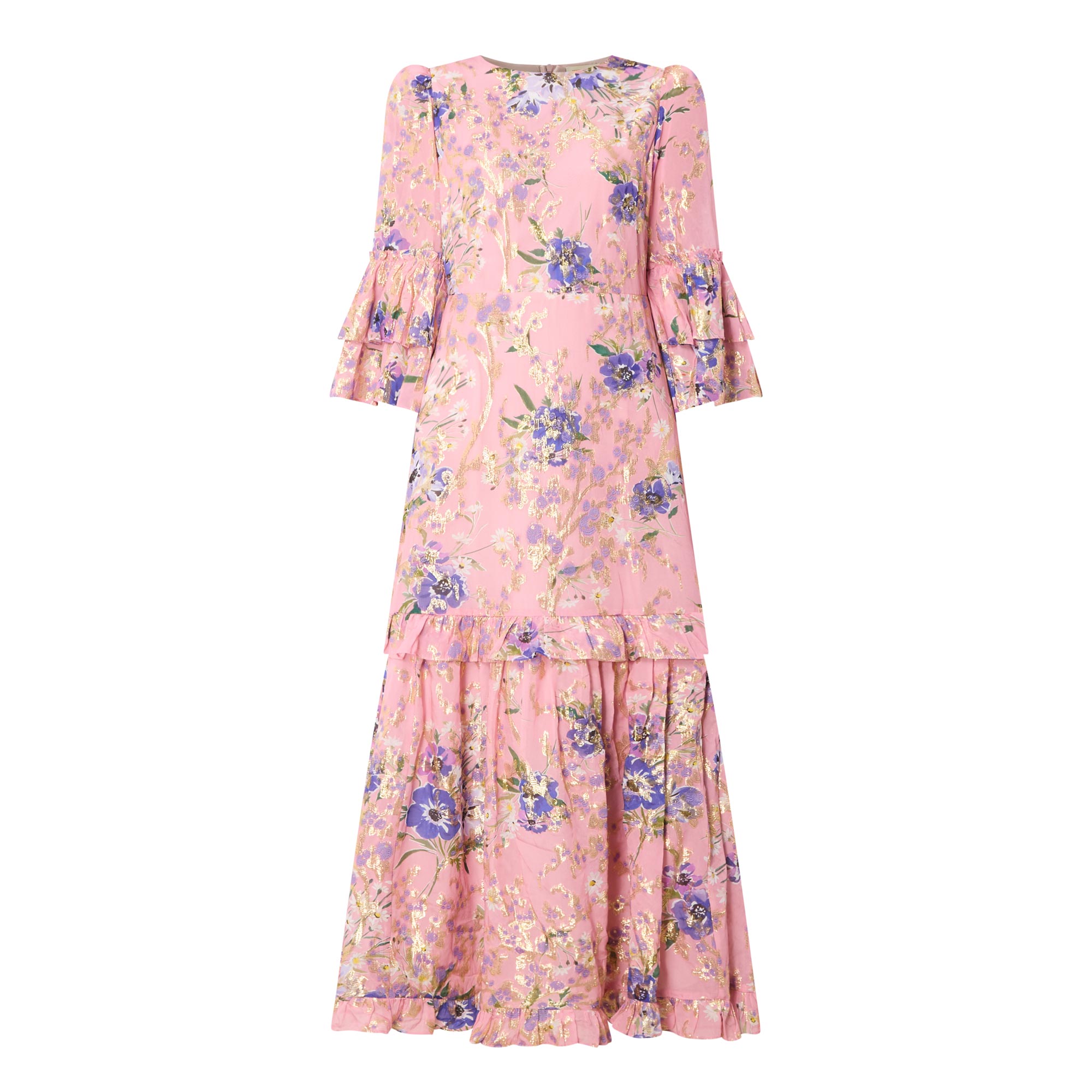 - Round neckline, three-quarter length sleeves, tiered cuffs, rear zip fastening, dropped waistline, tiered skirt, deep hem, poppy pink floral print, lurex threading throughout, maxi length, lined