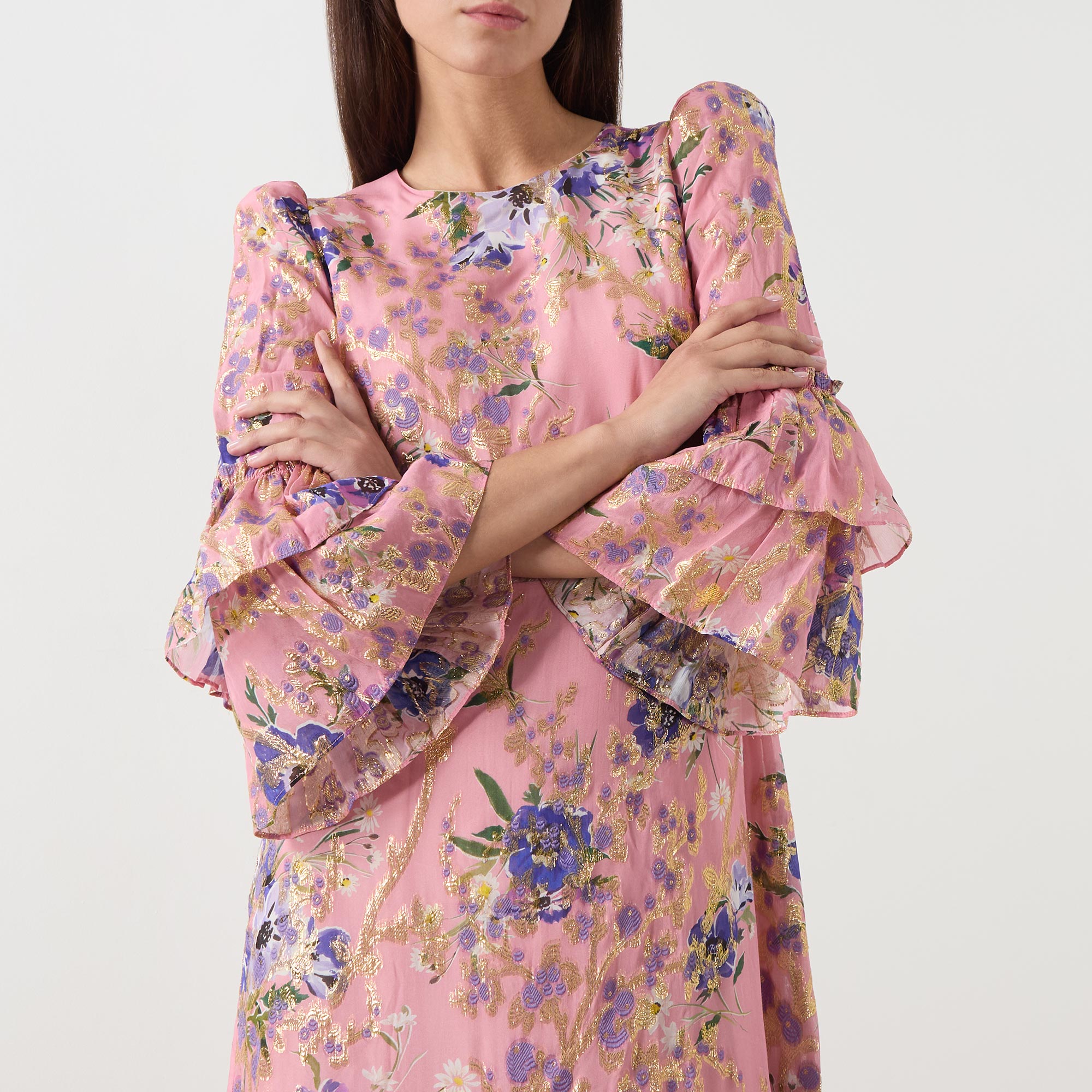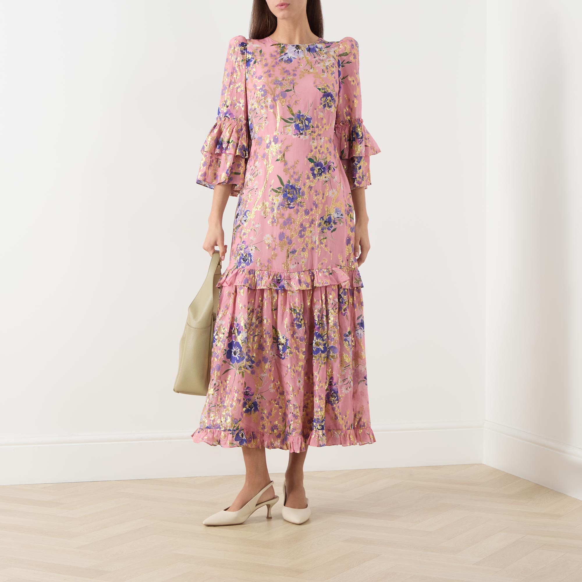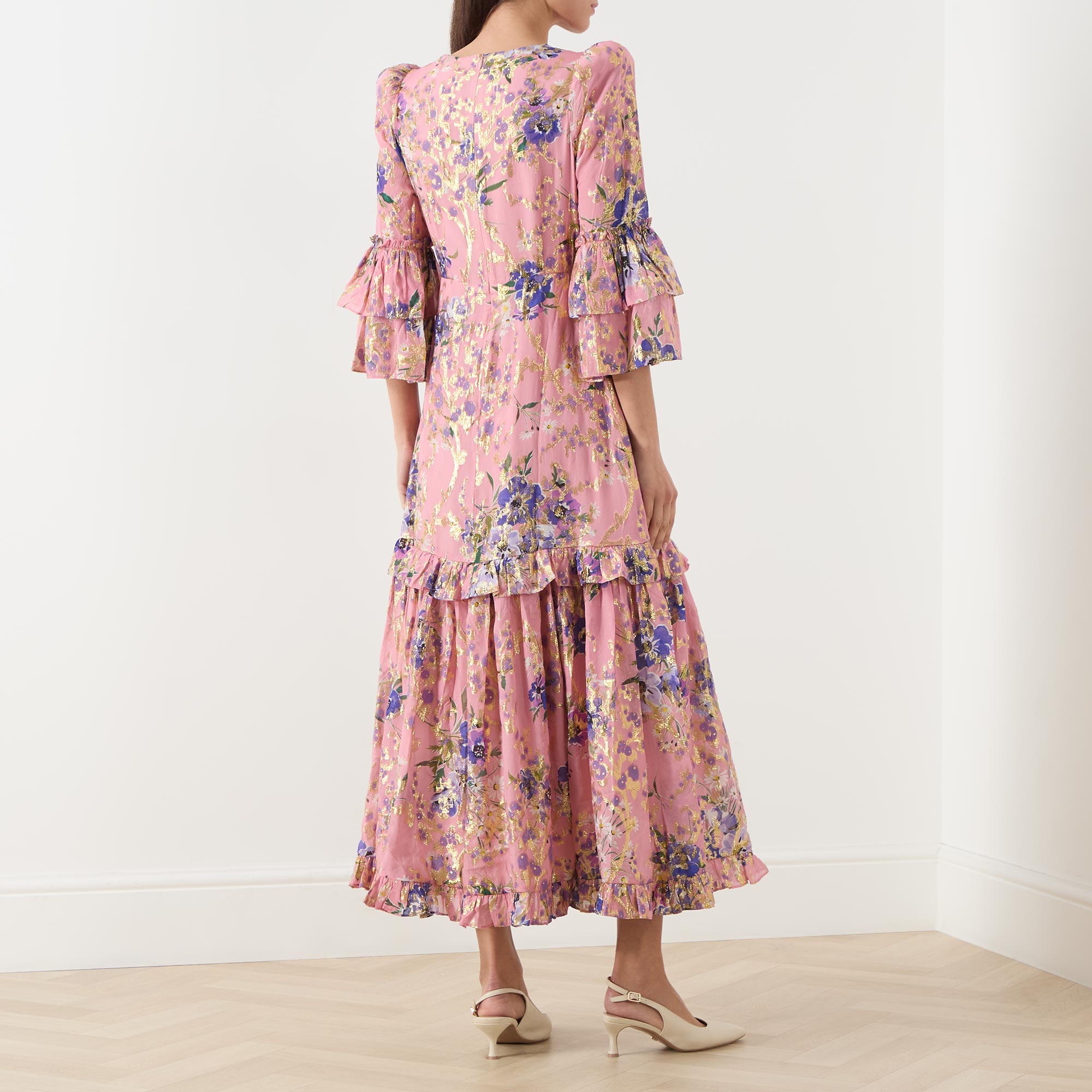 - Round neckline, three-quarter length sleeves, tiered cuffs, rear zip fastening, dropped waistline, tiered skirt, deep hem, poppy pink floral print, lurex threading throughout, maxi length, lined